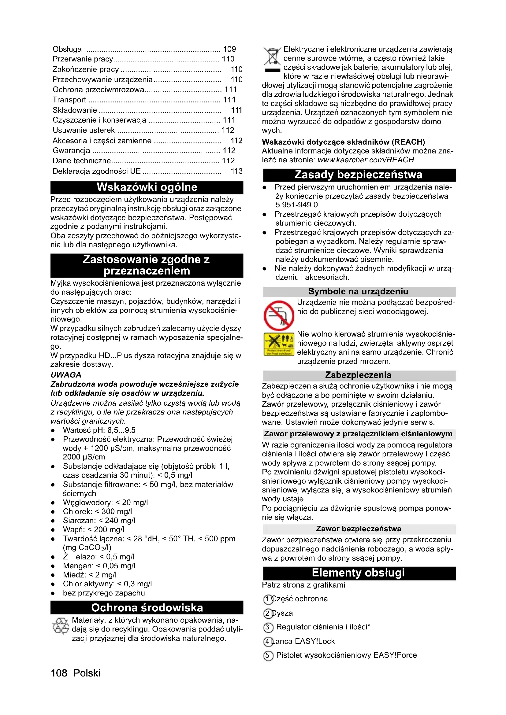 - /l) ●Żelazo: < 0,5 mg/l ● Mangan: < 0,05 mg/l ● Miedź: < 2 mg/l ● Chlor aktywny: < 0,3 mg/l ● bez przykrego zapachu Ochrona środowiska Materiały, z których wykonano opakowania, na- dają się do recyklingu. Opakowania poddać utyli- zacji przyjaznej dla środowiska naturalnego. Elektryczne i elektroniczne urządzenia zawierają cenne surowce wtórne, a często również takie części składowe jak baterie, akumulatory lub olej, które w razie niewłaściwej obsługi lub nieprawi- dłowej utylizacji mogą stanowić potencjalne zagrożenie dla zdrowia ludzkiego i środowiska naturalnego. Jednak te części składowe są niezbędne do prawidłowej pracy urządzenia. Urządzeń oznaczonych tym symbolem nie można wyrzucać do odpadów z gospodarstw domo- wych. Wskazówki dotyczące składników (REACH) Aktualne informacje dotyczące składników można zna- leźć na stronie: www.kaercher.com/REACH Zasady bezpieczeństwa ● Przed pierwszym uruchomieniem urządzenia nale- ży koniecznie przeczytać zasady bezpieczeństwa 5.951-949.0. ● Przestrzegać krajowych przepisów dotyczących strumienic cieczowych. ● Przestrzegać krajowych przepisów dotyczących za- pobiegania wypadkom. Należy regularnie spraw- dzać strumienice cieczowe. Wyniki sprawdzania należy udokumentować pisemnie. ● Nie należy dokonywać żadnych modyfikacji w urzą- dzeniu i akcesoriach. Symbole na urządzeniu Urządzenia nie można podłączać bezpośred- nio do publicznej sieci wodociągowej. Nie wolno kierować strumienia wysokociśnie- niowego na ludzi, zwierzęta, aktywny osprzęt elektryczny ani na samo urządzenie. Chronić urządzenie przed mrozem. Zabezpieczenia Zabezpieczenia służą ochronie użytkownika i nie mogą być odłączone albo pominięte w swoim działaniu. Zawór przelewowy, przełącznik ciśnieniowy i zawór bezpieczeństwa są ustawiane fabrycznie i zaplombo- wane. Ustawień może dokonywać jedynie serwis. Zawór przelewowy z przełącznikiem ciśnieniowym W razie ograniczenia ilości wody za pomocą regulatora ciśnienia i ilości otwiera się zawór przelewowy i część wody spływa z powrotem do strony ssącej pompy. Po zwolnieniu dźwigni spustowej pistoletu wysokoci- śnieniowego wyłącznik ciśnieniowy pompy wysokoci- śnieniowej wyłącza się, a wysokociśnieniowy strumień wody ustaje. Po pociągnięciu za dźwignię spustową pompa ponow- nie się włącza. Zawór bezpieczeństwa Zawór bezpieczeństwa otwiera się przy przekroczeniu dopuszczalnego nadciśnienia roboczego, a woda spły- wa z powrotem do strony ssącej pompy. Elementy obsługi Patrz strona z grafikami 1 Część ochronna 2 Dysza 3 Regulator ciśnienia i ilości* 4 Lanca EASY!Lock 5 Pistolet wysokociśnieniowy EASY!Force Obsługa p. 109