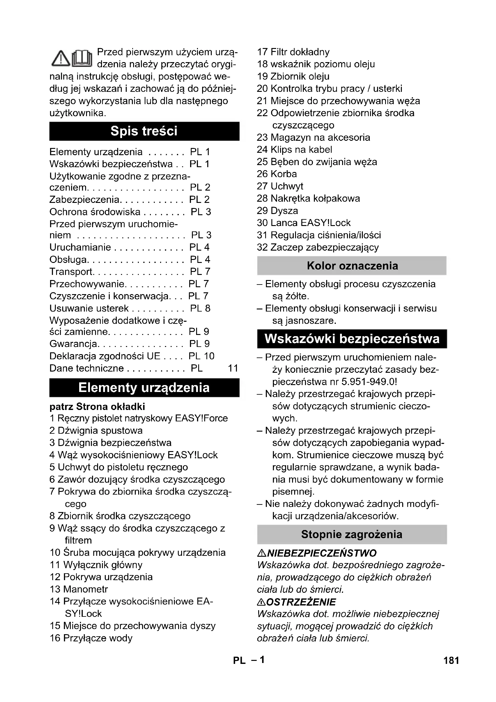 - 1.286-902.0: 75,5 kg; 1.286-903.0: 75,7 kg; 1.286-913.0: 69,1 kg; 1.286-927: 82,5 kg ** 1.286-914.0: 77,5 kg; 1.286-928.0: 86 kg 180 SL– 1 Przed pierwszym użyciem urzą- dzenia należy przeczytać orygi- nalną instrukcję obsługi, postępować we- dług jej wskazań i zachować ją do później- szego wykorzystania lub dla następnego użytkownika. patrz Strona okładki 1 Ręczny pistolet natryskowy EASY!Force 2 Dźwignia spustowa 3 Dźwignia bezpieczeństwa 4 Wąż wysokociśnieniowy EASY!Lock 5 Uchwyt do pistoletu ręcznego 6 Zawór dozujący środka czyszczącego 7 Pokrywa do zbiornika środka czyszczą- cego 8 Zbiornik środka czyszczącego 9 Wąż ssący do środka czyszczącego z filtrem 10 Śruba mocująca pokrywy urządzenia 11 Wyłącznik główny 12 Pokrywa urządzenia 13 Manometr 14 Przyłącze wysokociśnieniowe EA- SY!Lock 15 Miejsce do przechowywania dyszy 16 Przyłącze wody 17 Filtr dokładny 18 wskaźnik poziomu oleju 19 Zbiornik oleju 20 Kontrolka trybu pracy / usterki 21 Miejsce do przechowywania węża 22 Odpowietrzenie zbiornika środka czyszczącego 23 Magazyn na akcesoria 24 Klips na kabel 25 Bęben do zwijania węża 26 Korba 27 Uchwyt 28 Nakrętka kołpakowa 29 Dysza 30 Lanca EASY!Lock 31 Regulacja ciśnienia/ilości 32 Zaczep zabezpieczający – Elementy obsługi procesu czyszczenia są żółte. – Elementy obsługi konserwacji i serwisu są jasnoszare. – Przed pierwszym uruchomieniem nale- ży koniecznie przeczytać zasady bez- pieczeństwa nr 5.951-949.0! – Należy przestrzegać krajowych przepi- sów dotyczących strumienic cieczo- wych. – Należy przestrzegać krajowych przepi- sów dotyczących zapobiegania wypad- kom. Strumienice cieczowe muszą być regularnie sprawdzane, a wynik bada- nia musi być dokumentowany w formie pisemnej. – Nie należy dokonywać żadnych modyfi- kacji urządzenia/akcesoriów. NIEBEZPIECZEŃSTWO Wskazówka dot. bezpośredniego zagroże- nia, prowadzącego do ciężkich obrażeń ciała lub do śmierci. 몇 OSTRZEŻENIE Wskazówka dot. możliwie niebezpiecznej sytuacji, mogącej prowadzić do ciężkich obraże ń ciała lub śmierci. Spis treści Elementy urządzenia . . . . . . . PL 1 Wskazówki bezpieczeństwa . . PL 1 Użytkowanie zgodne z przezna- czeniem. . . . . . . . . . . . . . . . . . PL 2 Zabezpieczenia. . . . . . . . . . . . PL 2 Ochrona środowiska . . . . . . . . PL 3 Przed pierwszym uruchomie- niem . . . . . . . . . . . . . . . . . . . . PL 3 Uruchamianie . . . . . . . . . . . . . PL 4 Obsługa. . . . . . . . . . . . . . . . . . PL 4 Transport. . . . . . . . . . . . . . . . . PL 7 Przechowywanie. . . . . . . . . . . PL 7 Czyszczenie i konserwacja. . . PL 7 Usuwanie usterek . . . . . . . . . . PL 8 Wyposażenie dodatkowe i czę- ści zamienne. . . . . . . . . . . . . . PL 9 Gwarancja. . . . . . . . . . . . . . . . PL 9 Deklaracja zgodności UE . . . . PL 10 Dane techniczne . . . . . . . . . . . PL 11 Elementy urządzenia Kolor oznaczenia Wskazówki bezpieczeństwa Stopnie zagrożenia 181PL– 2 몇 OSTROŻNIE Wskazówka dot. możliwie niebezpiecznej sytuacji, która może prowadzić do lekkich zranień. UWAGA Wskazówka dot. możliwie niebezpiecznej sytuacji, która może prowadzić do szkód materialnych. W przypadku niewłaściwego użycia strumień wody pod ciś- nieniem może być niebezpieczny. Nie wol- no kierować strumienia na ludzi, zwierzęta, czynny osprzęt elektryczny ani na samo urządzenie. Zgodnie z obowiązującymi przepi- sami urządzenie nigdy nie może być używane bez odłącznika sy- stemowego przy sieci wodociągo- wej. Należy używać odpowiedniego od- łącznika systemowego firmy KÄRCHER albo odłącznika systemowego zgodnego z EN 12729, typu BA. Woda, która przepłynęła przez odłącznik systemowy, katalogowana jest jako nie na- dająca się do picia.