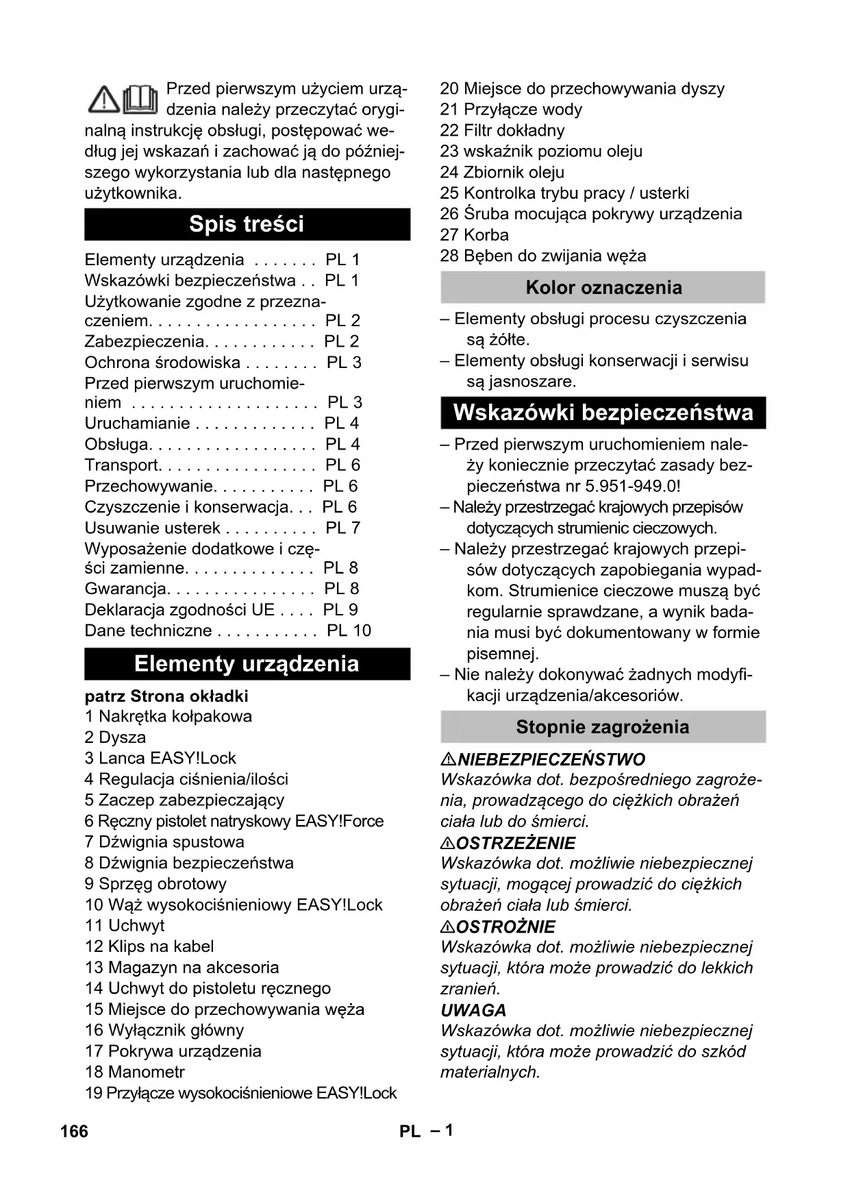dB(A) 96 Goriva Količina olja l 1,2 Vrsta olja SAE 90 Mere in teža Dolžina mm 560 Širina mm 500 Višina mm 1090 Tipična delovna teža (SX) kg 75 (77) Razlog za izjemo v skladu z Uredbo (EU) 2019/1781 Priloga I Točka 2 (12): j) 165SL– 1 Przed pierwszym użyciem urzą- dzenia należy przeczytać orygi- nalną instrukcję obsługi, postępować we- dług jej wskazań i zachować ją do później- szego wykorzystania lub dla następnego użytkownika. patrz Strona okładki 1 Nakrętka kołpakowa 2 Dysza 3 Lanca EASY!Lock 4 Regulacja ciśnienia/ilości 5 Zaczep zabezpieczający 6 Ręczny pistolet natryskowy EASY!Force 7 Dźwignia spustowa 8 Dźwignia bezpieczeństwa 9 Sprzęg obrotowy 10 Wąż wysokociśnieniowy EASY!Lock 11 Uchwyt 12 Klips na kabel 13 Magazyn na akcesoria 14 Uchwyt do pistoletu ręcznego 15 Miejsce do przechowywania węża 16 Wyłącznik główny 17 Pokrywa urządzenia 18 Manometr 19 Przyłącze wysokociśnieniowe EASY!Lock 20 Miejsce do przechowywania dyszy 21 Przyłącze wody 22 Filtr dokładny 23 wskaźnik poziomu oleju 24 Zbiornik oleju 25 Kontrolka trybu pracy / usterki 26 Śruba mocująca pokrywy urządzenia 27 Korba 28 Bęben do zwijania węża – Elementy obsługi procesu czyszczenia są żółte. – Elementy obsługi konserwacji i serwisu są jasnoszare. – Przed pierwszym uruchomieniem nale- ży koniecznie przeczytać zasady bez- pieczeństwa nr 5.951-949.0! – Należy przestrzegać krajowych przepisów dotyczących strumienic cieczowych. – Należy przestrzegać krajowych przepi- sów dotyczących zapobiegania wypad- kom. Strumienice cieczowe muszą być regularnie sprawdzane, a wynik bada- nia musi być dokumentowany w formie pisemnej. – Nie należy dokonywać żadnych modyfi- kacji urządzenia/akcesoriów. NIEBEZPIECZEŃSTWO Wskazówka dot. bezpośredniego zagroże- nia, prowadzącego do ciężkich obrażeń ciała lub do śmierci. 몇 OSTRZEŻENIE Wskazówka dot. możliwie niebezpiecznej sytuacji, mogącej prowadzić do ciężkich obrażeń ciała lub śmierci. 몇 OSTROŻNIE Wskazówka dot. możliwie niebezpiecznej sytuacji, która może prowadzić do lekkich zranień. UWAGA Wskazówka dot. możliwie niebezpiecznej sytuacji, która może prowadzić do szkód materialnych. Spis treści Elementy urządzenia . . . . . . . PL 1 Wskazówki bezpieczeństwa . . PL 1 Użytkowanie zgodne z przezna- czeniem. . . . . . . . . . . . . . . . . . PL 2 Zabezpieczenia. . . . . . . . . . . . PL 2 Ochrona środowiska . . . . . . . . PL 3 Przed pierwszym uruchomie- niem . . . . . . . . . . . . . . . . . . . . PL 3 Uruchamianie . . . . . . . . . . . . . PL 4 Obsługa. . . . . . . . . . . . . . . . . . PL 4 Transport. . . . . . . . . . . . . . . . . PL 6 Przechowywanie. . . . . . . . . . . PL 6 Czyszczenie i konserwacja. . . PL 6 Usuwanie usterek . . . . . . . . . . PL 7 Wyposażenie dodatkowe i czę- ści zamienne. . . . . . . . . . . . . . PL 8 Gwarancja. . . . . . . . . . . . . . . . PL 8 Deklaracja zgodności UE . . . . PL 9 Dane techniczne . . . . . . . . . . . PL 10 Elementy urządzenia Kolor oznaczenia Wskazówki bezpieczeństwa Stopnie zagrożenia 166 PL– 2 W przypadku niewłaściwego użycia strumień wody pod ciś- nieniem może być niebezpieczny. Nie wol- no kierować strumienia na ludzi, zwierzęta, czynny osprzęt elektryczny ani na samo urządzenie. Zgodnie z obowiązującymi przepi- sami urządzenie nigdy nie może być używane bez odłącznika sy- stemowego przy sieci wodociągo- wej. Należy używać odpowiedniego od- łącznika systemowego firmy KÄRCHER albo odłącznika systemowego zgodnego z EN 12729, typu BA. Woda, która przepłynęła przez odłącznik systemowy, katalogowana jest jako nie na- dająca się do picia. 몇 OSTROŻNIE Oddzielacz systemowy zawsze podłączać na doprowadzeniu wody, nigdy zaś bezpo- średnio przy urządzeniu. Używać wyłącznie tę myjkę wysokociśnie- niową. – do czyszczenia strumieniem niskociś- nieniowym i środkiem czyszczącym (np. czyszczenie maszyn, pojazdów, budynków, narzędzi), – do czyszczenia strumieniem wysoko- ciśnieniowym bez środka czyszczące- go (np. czyszczenie fasad, tarasów, urządzeń ogrodowych). Wymagania względem jakości wody: UWAGA Jako nośnika wysokiego ciśnienia można używać wyłącznie czystą wodę. Zabrudze- nia powodują wcześniejsze zużycie wzgl. odkładanie się osadów w urządzeniu. Jeżeli stosuje się wodę z recyklingu, to nie można przekroczyć poniższych wartości granicznych. Zabezpieczenia chronią użytkownika i dla- tego nie wolno ich usuwać, wyłączać ani obchodzić ich działania. W razie ograniczenia ilości wody za pomo- cą reguklacji ciśnienia/ilości wody, otwiera się zawór przelewowy i część wody spływa z powrotem do ssącej strony pompy. Po zwolnieniu dźwigni spustowej pistoletu natryskowego wyłącznik ciśnieniowy pom- py wyłącza się, a wysokociśnieniowy stru- mień wody ustaje. Po pociągnięciu za dźwignię spustową pompa ponownie się włącza. Zawór przelewowy z przełącznikiem ciśnie- niowym są ustawiane fabrycznie i zaplom- bowane. Może być ustawiany tylko przez serwis. Symbole na urządzeniu Użytkowanie zgodne z przeznaczeniem Poziom pH 6,5...9,5 Przewodność elektryczna * Przewodność świeżej wody +1200 µS/cm Substancje odkładające się