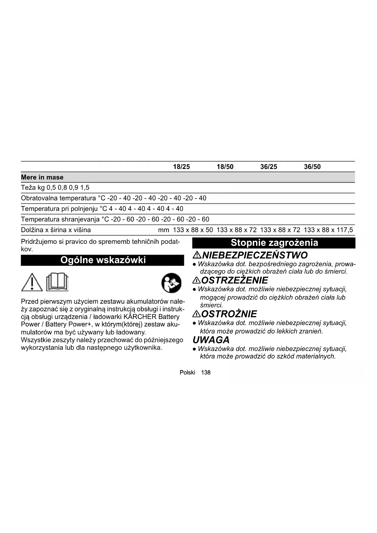 akumulatorskih baterij. Tehnični podatki 18/25 18/50 36/25 36/50 Električni priključek Nazivna napetost paketa akumulatorskih ba- terij V18183636 Sistem akumulatorskih baterij Battery Power Battery Power Battery Power Battery Power Združljivo s sistemom akumulatorskih baterij Battery Power + Battery Power + Battery Power + Battery Power + Vrsta paketa akumulatorskih baterij Li-ION Li-ION Li-ION Li-ION Nazivna zmogljivost (v skladu z IEC/ EN 61960) Ah 2,5 5,0 2,5 5,0 Nazivna energija Wh 45 90 90 180 Največji napajalni tok A 3,5 7,5 3,5 7,5Polski 138 Pridržujemo si pravico do sprememb tehničnih podat- kov. Ogólne wskazówki Przed pierwszym użyciem zestawu akumulatorów nale- ży zapoznać się z oryginalną instrukcją obsługi i instruk- cją obsługi urządzenia / ładowarki KÄRCHER Battery Power / Battery Power+, w którym(której) zestaw aku- mulatorów ma być używany lub ładowany. Wszystkie zeszyty należy przechować do późniejszego wykorzystania lub dla następnego użytkownika. Stopnie zagrożenia NIEBEZPIECZEŃSTWO ● Wskazówka dot. bezpośredniego zagrożenia, prowa- dzącego do ciężkich obrażeń ciała lub do śmierci. 몇 OSTRZEŻENIE ● Wskazówka dot. możliwie niebezpiecznej sytuacji, mogącej prowadzić do ciężkich obrażeń ciała lub śmierci. 몇 OSTROŻNIE ● Wskazówka dot. możliwie niebezpiecznej sytuacji, która może prowadzić do lekkich zranień. UWAGA ● Wskazówka dot. możliwie niebezpiecznej sytuacji, która może prowadzić do szkód materialnych. Mere in mase Teža kg 0,5 0,8 0,9 1,5 Obratovalna temperatura °C -20 - 40 -20 - 40 -20 - 40 -20 - 40 Temperatura pri polnjenju °C 4 - 40 4 - 40 4 - 40 4 - 40 Temperatura shranjevanja °C -20 - 60 -20 - 60 -20 - 60 -20 - 60 Dolžina x širina x višina mm 133 x 88 x 50 133 x 88 x 72 133 x 88 x 72 133 x 88 x 117,5 18/25 18/50 36/25 36/50139 Polski Wskazówki dotyczące bezpieczeństwa ● Przed każdym użyciem sprawdzić, czy zestaw aku- mulatorów nie jest uszkodzony. Nie używać uszko- dzonych zestawów akumulatorów. ● Przed wykonaniem wszelkich czynności konserwa- cyjnych i pielęgnacyjnych należy wyjąć zestaw aku- mulatorów z urządzenia. ● Zestawu akumulatorów nie należy narażać na ob- ciążenia mechaniczne. ● Nie upuścić zestawu akumulatorów. ● Nie zanurzać zestawu akumulatorów w wodzie ani nie trzymać go pod strumieniem wody. ● Nie używać, nie ładować ani nie przechowywać ze- stawu akumulatorów, gdy jest mokry lub zabrudzo- ny. ● Jeśli zestaw akumulatorów zamoknie, natychmiast go wysuszyć. Upewnić się, że na stykach nie pozo- stała wilgoć. ● Nie przechowywać ani nie ładować zestawu akumu- latorów w wilgotnym lub mokrym otoczeniu. ● Zestaw akumulatorów można ładować tylko za po- mocą dopuszczonych ładowarek. ● Nie ładować zestawu akumulatorów bez nadzoru. Podczas procesu ładowania regularnie sprawdzać stan zestawu akumulatorów i ładowarki. ● Jeśli podczas ładowania wystąpi usterka, nietypowy zapach lub wydzielanie się ciepła, odłączyć łado- warkę od sieci, a zestaw akumulatorów - od łado- warki. Niezwłocznie poddać zestaw akumulatorów i ładowarkę utylizacji i postępować zgodnie z obowią- zującymi przepisami dotyczącymi transportu i utyli- zacji. ● Nie używać, nie ładować ani nie przechowywać ze- stawu akumulatorów w otoczeniu zagrożonym wy- buchem ani w pobliżu łatwopalnych przedmiotów. ● Nie wrzucać zestawów akumulatorów do ognia. ● Chronić zestaw akumulatorów przed wysoką tem- peraturą, ostrymi krawędziami, olejem, rozpusz- czalnikami, ś rodkami czyszczącymi i obracającymi się częściami urządzenia. ● Niebezpieczeństwo zwarcia. Chronić styki zestawu akumulatorów przed częściami metalowymi i nie przechowywać go razem z częściami metalowymi. ● Nie otwierać zestawu akumulatorów. Naprawy mo- że przeprowadzać jedynie wykwalifikowany perso- nel. ● Unikać kontaktu z cieczą wypływającą z uszkodzo- nych akumulatorów. W razie kontaktu z cieczą na- tychmiast spłukać dane miejsce wodą, a w przypadku kontaktu cieczy z oczami dodatkowo za- sięgnąć opinii lekarza.Polski 140 ● Po zakończeniu okresu użytkowania zestaw aku- mulatorów należy poddać utylizacji zgodnie z obo- wiązującymi przepisami. Zasady bezpieczeństwa dotyczące transportu Akumulator litowo-jonowy podlega przepisom dotyczą- cym towarów niebezpiecznych. Nieuszkodzony i sprawny zestaw akumulatorów nie może być transportowany przez użytkownika bez do- datkowych powłok w obszarze transportu publicznego. W przypadku wysyłki za pośrednictwem strony trzeciej (przedsiębiorstwa transportowego) należy przestrzegać specjalnych wymogów dotyczących pakowania i ozna- czania. Zestaw akumulatorów można przesyłać tylko wtedy, gdy jego obudowa jest nieuszkodzona. Okleić otwarte styki. Zapakować zestaw akumulatorów w sposób stabilny i bezpieczny. Zestaw akumulatorów nie może prze- mieszczać się wewnątrz opakowania. NIEBEZPIECZEŃSTWO ● Uszkodzony lub niesprawny zestaw akumulatorów nie może być wysyłany i należy go poddać odpowied- niej utylizacji na miejscu zgodnie z obowiązującymi przepisami. Należy przestrzegać przepisów krajowych. Zastosowanie zgodne z przeznaczeniem 몇 OSTROŻNIE Niebezpieczeństwo wybuchu! Obrażenia i uszkodzenia spowodowane wybuchem ze- stawu akumulatorów. Ładować, używać i przechowywać tylko nieuszkodzone i w pełni funkcjonalne zestawy akumulatorów. Zabronione są jakiekolwiek modyfikacje i nieautoryzo- wane przez producenta zmiany. Każde inne zastosowanie jest niedopuszczalne. Za za- grożenia powstałe w wyniku niedopuszczalnego zasto- sowania odpowiada użytkownik. Ładować zestawy akumulatorów i używać ich tylko z urządzeniami systemu KÄRCHER 18 V / 36 V Battery Power / Battery Power+. UWAGA Zestawy akumulatorów mogą być używane tylko z urzą- dzeniami o tym samym rodzaju napięcia (18 V lub 36 V)! Nie u