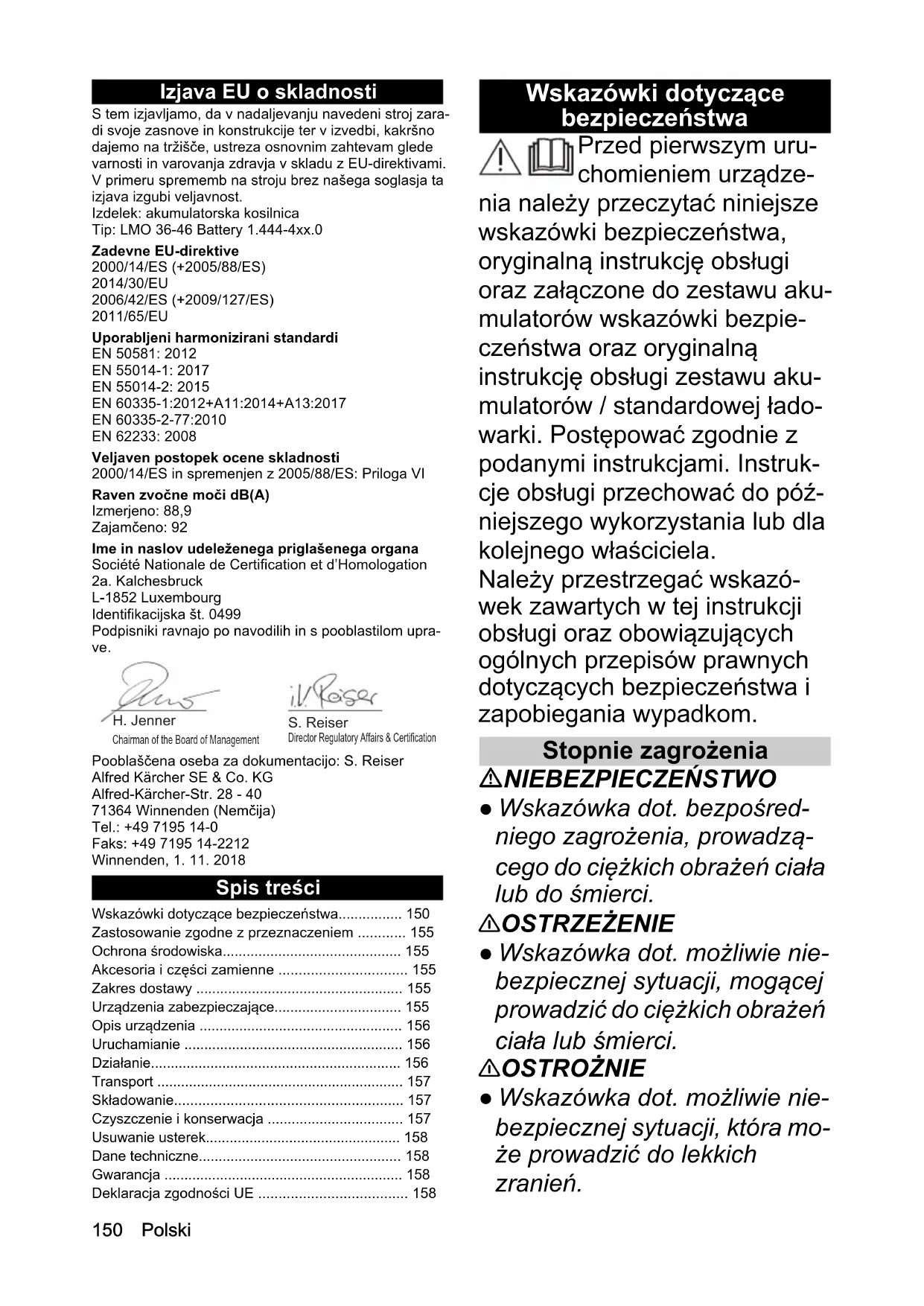 - Teža (brez paketa akumulatorskih baterij) kg 19,8150 Polski Izjava EU o skladnosti S tem izjavljamo, da v nadaljevanju navedeni stroj zara- di svoje zasnove in konstrukcije ter v izvedbi, kakršno dajemo na tržišče, ustreza osnovnim zahtevam glede varnosti in varovanja zdravja v skladu z EU-direktivami. V primeru sprememb na stroju brez našega soglasja ta izjava izgubi veljavnost. Izdelek: akumulatorska kosilnica Tip: LMO 36-46 Battery 1.444-4xx.0 Zadevne EU-direktive 2000/14/ES (+2005/88/ES) 2014/30/EU 2006/42/ES (+2009/127/ES) 2011/65/EU Uporabljeni harmonizirani standardi EN 50581: 2012 EN 55014-1: 2017 EN 55014-2: 2015 EN 60335-1:2012+A11:2014+A13:2017 EN 60335-2-77:2010 EN 62233: 2008 Veljaven postopek ocene skladnosti 2000/14/ES in spremenjen z 2005/88/ES: Priloga VI Raven zvočne moči dB(A) Izmerjeno: 88,9 Zajamčeno: 92 Ime in naslov udeleženega priglašenega organa Société Nationale de Certification et d’Homologation 2a. Kalchesbruck L-1852 Luxembourg Identifikacijska št. 0499 Podpisniki ravnajo po navodilih in s pooblastilom upra- ve. Pooblaščena oseba za dokumentacijo: S. Reiser Alfred Kärcher SE & Co. KG Alfred-Kärcher-Str. 28 - 40 71364 Winnenden (Nemčija) Tel.: +49 7195 14-0 Faks: +49 7195 14-2212 Winnenden, 1. 11. 2018 Spis treści Wskazówki dotyczące bezpieczeństwa Przed pierwszym uru- chomieniem urządze- nia należy przeczytać niniejsze wskazówki bezpieczeństwa, oryginalną instrukcję obsługi oraz załączone do zestawu aku- mulatorów wskazówki bezpie- czeństwa oraz oryginalną instrukcję obsługi zestawu aku- mulatorów / standardowej łado- warki. Postępować zgodnie z podanymi instrukcjami. Instruk- cje obsługi przechować do póź- niejszego wykorzystania lub dla kolejnego właściciela. Należy przestrzegać wskazó- wek zawartych w tej instrukcji obsługi oraz obowiązujących ogólnych przepisów prawnych dotyczących bezpieczeństwa i zapobiegania wypadkom. Stopnie zagrożenia NIEBEZPIECZEŃSTWO ● Wskazówka dot. bezpośred- niego zagrożenia, prowadzą- cego do ciężkich obrażeń ciała lub do śmierci. 몇 OSTRZEŻENIE ● Wskazówka dot. możliwie nie- bezpiecznej sytuacji, mogącej prowadzić do ciężkich obrażeń ciała lub śmierci. 몇 OSTROŻNIE ● Wskazówka dot. możliwie nie- bezpiecznej sytuacji, która mo- że prowadzić do lekkich zranień. Wskazówki dotyczące bezpieczeństwa p. 150