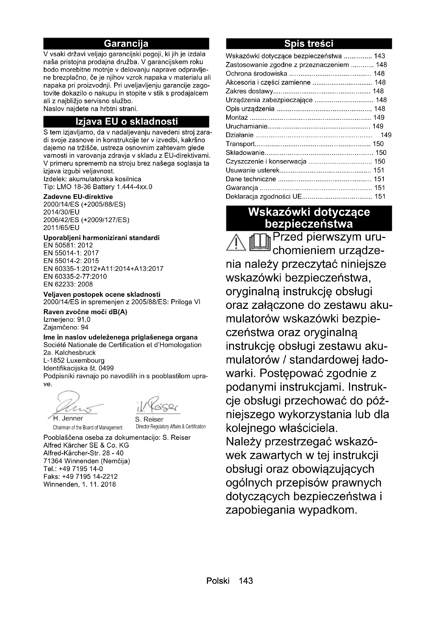 - Teža (brez paketa akumulatorskih baterij) kg 13,4Polski 143 Garancija V vsaki državi veljajo garancijski pogoji, ki jih je izdala naša pristojna prodajna družba. V garancijskem roku bodo morebitne motnje v delovanju naprave odpravlje- ne brezplačno, če je njihov vzrok napaka v materialu ali napaka pri proizvodnji. Pri uveljavljenju garancije zago- tovite dokazilo o nakupu in stopite v stik s prodajalcem ali z najbližjo servisno službo. Naslov najdete na hrbtni strani. Izjava EU o skladnosti S tem izjavljamo, da v nadaljevanju navedeni stroj zara- di svoje zasnove in konstrukcije ter v izvedbi, kakršno dajemo na tržišče, ustreza osnovnim zahtevam glede varnosti in varovanja zdravja v skladu z EU-direktivami. V primeru sprememb na stroju brez našega soglasja ta izjava izgubi veljavnost. Izdelek: akumulatorska kosilnica Tip: LMO 18-36 Battery 1.444-4xx.0 Zadevne EU-direktive 2000/14/ES (+2005/88/ES) 2014/30/EU 2006/42/ES (+2009/127/ES) 2011/65/EU Uporabljeni harmonizirani standardi EN 50581: 2012 EN 55014-1: 2017 EN 55014-2: 2015 EN 60335-1:2012+A11:2014+A13:2017 EN 60335-2-77:2010 EN 62233: 2008 Veljaven postopek ocene skladnosti 2000/14/ES in spremenjen z 2005/88/ES: Priloga VI Raven zvočne moči dB(A) Izmerjeno: 91,0 Zajamčeno: 94 Ime in naslov udeleženega priglašenega organa Société Nationale de Certification et d’Homologation 2a. Kalchesbruck L-1852 Luxembourg Identifikacijska št. 0499 Podpisniki ravnajo po navodilih in s pooblastilom upra- ve. Pooblaščena oseba za dokumentacijo: S. Reiser Alfred Kärcher SE & Co. KG Alfred-Kärcher-Str. 28 - 40 71364 Winnenden (Nemčija) Tel.: +49 7195 14-0 Faks: +49 7195 14-2212 Winnenden, 1. 11. 2018 Spis treści Wskazówki dotyczące bezpieczeństwa Przed pierwszym uru- chomieniem urządze- nia należy przeczytać niniejsze wskazówki bezpieczeństwa, oryginalną instrukcję obsługi oraz załączone do zestawu aku- mulatorów wskazówki bezpie- czeństwa oraz oryginalną instrukcję obsługi zestawu aku- mulatorów / standardowej łado- warki. Postępować zgodnie z podanymi instrukcjami. Instruk- cje obsługi przechować do póź- niejszego wykorzystania lub dla kolejnego właściciela. Należy przestrzegać wskazó- wek zawartych w tej instrukcji obsługi oraz obowiązujących ogólnych przepisów prawnych dotyczących bezpieczeństwa i zapobiegania wypadkom. Chairman of the Board of ManagementDirector Regulatory Affairs & Certification H. Jenner S. Reiser Wskazówki dotyczące bezpieczeństwa p. 143