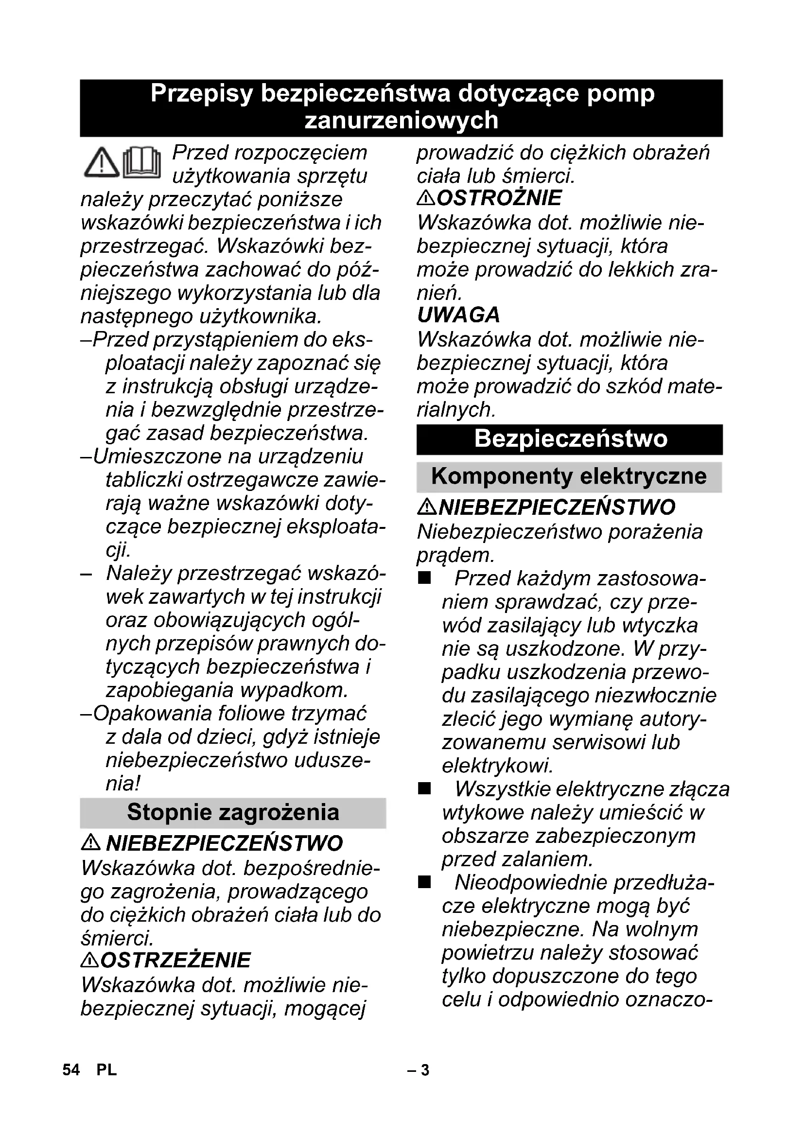NIEBEZPIECZEŃSTWO Wskazówka dot. bezpośrednie- go zagrożenia, prowadzącego do ciężkich obrażeń ciała lub do śmierci. 몇 OSTRZEŻENIE Wskazówka dot. możliwie nie- bezpiecznej sytuacji, mogącej prowadzić do ciężkich obrażeń ciała lub śmierci. 몇 OSTROŻNIE Wskazówka dot. możliwie nie- bezpiecznej sytuacji, która może prowadzić do lekkich zra- nień. UWAGA Wskazówka dot. możliwie nie- bezpiecznej sytuacji, która może prowadzić do szkód mate- rialnych. NIEBEZPIECZEŃSTWO Niebezpieczeństwo porażenia prądem. Przed każdym zastosowa- niem sprawdzać, czy prze- wód zasilający lub wtyczka nie są uszkodzone. W przy- padku uszkodzenia przewo- du zasilającego niezwłocznie zleci ć jego wymianę autory- zowanemu serwisowi lub elektrykowi. Wszystkie elektryczne złącza wtykowe należy umieścić w obszarze zabezpieczonym przed zalaniem. Nieodpowiednie przedłuża- cze elektryczne mogą być niebezpieczne. Na wolnym powietrzu należy stosować tylko dopuszczone do tego celu i odpowiednio oznaczo- Przepisy bezpieczeństwa dotyczące pomp zanurzeniowych Stopnie zagrożenia Bezpieczeństwo Komponenty elektryczne 54 PL– 4 ne przedłużacze elektryczne o wystarczającym przekroju. Wtyczka i złącze przedłuża- cza muszą być wodoszczelne i nie mogą leżeć w wodzie. Złącze nie może też leżeć na ziemi. Zaleca się stosowanie bębnów kablowych, które za- pewniają, że gniazdka znaj- dują się co najmniej 60 mm nad ziemią. Nie używać przewodu siecio- wego do transportowania / mocowania urządzenia. Aby odłączyć urządzenie od sieci, nie ciągnąć za kabel in- stalacyjny, lecz za wtyczkę. Unikać sytuacji prowadzą- cych do uszkodzenia mecha- niczego kabla zasilającego (przecięcia, przetarcia, zgnie- cenia, wyrwania). Napięcie podane na tabliczce znamionowej musi si ę zga- dzać z napięciem źródła prą- du. Aby wykluczyć zagrożenia, naprawy i montaż części za- miennych mogą być przepro- wadzane jedynie przez auto- ryzowany serwis. Pompy używać tylko na gniazdkach z wyłącznikiem ochronnym prądowym o prą- dzie uszkodzeniowym wyno- szącym maks. 30 mA i wypo- sażonym w styk ochronny (uziemienie). Regularnie sprawdzać działa- nie wyłącznika ochronnego prądowego i styku ochronne- go (uziemienia). W żadnym wypadku nie uży- wać pomp, gdy osoby prze- bywają w basenie pływackim wzgl. w stawie ogrodowym. W trakcie pracy nie dotykać cieczy, liny zamocowanej przy uchwycie do noszenia ani przedmiotów, będących w kontakcie z tłoczoną cieczą (np. przewodów rurowych wchodzących do wody, balu- strad itd.).