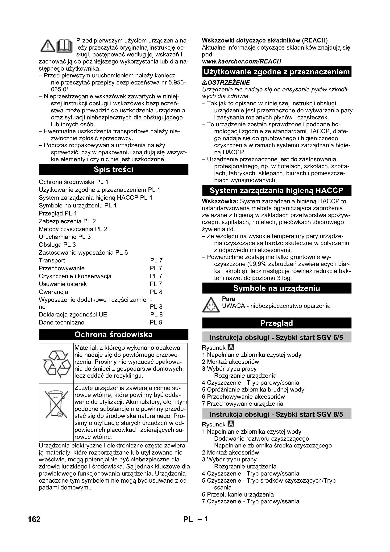 Št. delov Dolžina kabla EU 6.648-098.0 7,5 m GB 6.648-102.0 7,5 m CH 6.648-119.0 7,5 m AU 6.650-709.0 7,5 m 161SL– 1 Przed pierwszym użyciem urządzenia na- leży przeczytać oryginalną instrukcję ob- sługi, postępować według jej wskazań i zachować ją do późniejszego wykorzystania lub dla na- stępnego użytkownika. – Przed pierwszym uruchomieniem należy koniecz- nie przeczytać przepisy bezpieczeństwa nr 5.956- 065.0! – Nieprzestrzeganie wskazówek zawartych w niniej- szej instrukcji obsługi i wskazówek bezpieczeń- stwa może prowadzić do uszkodzenia urządzenia oraz sytuacji niebezpiecznych dla obsługującego lub innych osób. – Ewentualne uszkodzenia transportowe należy nie- zwłocznie zgłosić sprzedawcy. – Podczas rozpakowywania urządzenia należy sprawdzić, czy w opakowaniu znajdują się wszyst- kie elementy i czy nic nie jest uszkodzone. Urządzenia elektryczne i elektroniczne często zawiera- ją materiały, które rozporządzane lub utylizowane nie- właściwie, mogą potencjalnie być niebezpieczne dla zdrowia ludzkiego i środowiska. Są jednak kluczowe dla prawidłowego funkcjonowania urządzenia. Urządzenia oznaczone tym symbolem nie mogą być usuwane z od- padami domowymi. Wskazówki dotyczące składników (REACH) Aktualne informacje dotyczące składników znajdują się pod: www.kaercher.com/REACH 몇 OSTRZEŻENIE Urządzenie nie nadaje się do odsysania pyłów szkodli- wych dla zdrowia. – Tak jak to opisano w niniejszej instrukcji obsługi, urządzenie jest przeznaczone do wytwarzania pary i zasysania rozlanych płynów i cząsteczek. – To urządzenie zostało sprawdzone i poddane ho- mologacji zgodnie ze standardami HACCP, dlate- go nadaje się do gruntownego i higienicznego czyszczenia w ramach systemu zarządzania higie- ną HACCP. – Urządzenie przeznaczone jest do zastosowania profesjonalnego, np. w hotelach, szkołach, szpita- lach, fabrykach, sklepach, biurach i pomieszcze- niach wynajmowanych. Wskazówka: System zarządzania higieną HACCP to ustandaryzowana metoda ograniczająca zagrożenia związane z higieną w zakładach przetwórstwa spożyw- czego, szpitalach, hotelach, placówkach zbiorowego żywienia itd. – Ze względu na wysokie temperatury pary urządze- nia czyszczące są bardzo skuteczne w połączeniu z odpowiednimi akcesoriami. – Powierzchnie zostają nie tylko gruntownie wy- czyszczone (99,9% zabrudzeń zawierających biał- ka i skrobię), lecz następuje również redukcja bak- terii nawet do poziomu 3 log. Para UWAGA - niebezpieczeństwo oparzenia Rysunek 1 Napełnianie zbiornika czystej wody 2 Montaż akcesoriów 3 Wybór trybu pracy Rozgrzanie urządzenia 4 Czyszczenie - Tryb parowy/ssania 5 Opróżnianie zbiornika brudnej wody 6 Przechowywanie akcesoriów 7 Przechowywanie urządzenia Rysunek 1 Napełnianie zbiornika czystej wody Dodawanie roztworu czyszczącego Napełnianie zbiornika środka czyszczącego 2 Montaż akcesoriów 3 Wybór trybu pracy Rozgrzanie urządzenia 4 Czyszczenie - Tryb parowy/ssania 5 Czyszczenie - Tryb środków czyszczących/Tryb ssania 6 Przepłukanie urządzenia 7 Czyszczenie - Tryb parowy/ssania Spis treści Ochrona środowiska PL 1 Użytkowanie zgodne z przeznaczeniem PL 1 System zarządzania higieną HACCP PL 1 Symbole na urządzeniu PL 1 Przegląd PL 1 Zabezpieczenia PL 2 Metody czyszczenia PL 2 Uruchamianie PL 3 Obsługa PL 3 Zastosowanie wyposażenia PL 6 Transport PL 7 Przechowywanie PL 7 Czyszczenie i konserwacja PL 7 Usuwanie usterek PL 7 Gwarancja PL 8 Wyposażenie dodatkowe i części zamien- ne PL 8 Deklaracja zgodności UE PL 8 Dane techniczne PL 9 Ochrona środowiska Materiał, z którego wykonano opakowa- nie nadaje się do powtórnego przetwo- rzenia. Prosimy nie wyrzucać opakowa- nia do śmieci z gospodarstw domowych, lecz oddać do recyklingu. Zużyte urządzenia zawierają cenne su- rowce wtórne, które powinny być odda- wane do utylizacji. Akumulatory, olej i tym podobne substancje nie powinny przedo- stać się do środowiska naturalnego. Pro- simy o utylizację starych urządzeń w od- powiednich placówkach zbierających su- rowce wtórne. Użytkowanie zgodne z przeznaczeniem System zarządzania higieną HACCP Symbole na urządzeniu Przegląd Instrukcja obsługi - Szybki start SGV 6/5 Instrukcja obsługi - Szybki start SGV 8/5 162 PL– 2 8 Opróżnianie zbiornika brudnej wody 9 Przeprowadzanie samooczyszczania 10 Przechowywanie akcesoriów 11 Przechowywanie urządzenia Rysunek 1 Blokowanie zbiornika brudnej wody 2 Pokrywa zbiornika brudnej wody 3 Zbiornik brudnej wody 4 Filtr zgrubny 5 Oprawka filtra 6 Wężyk do zasysania pary 7 Uchwyt do prowadzenia 8 Wspornik węża 9 Przejściówka do akcesoriów (Homebase) 10 Uchwyt na rurę ssącą parę (pozycja parkowania) 11 Oprawa rury ssącej parę (samooczyszczanie) (tyl- ko SGV 8/5) 12 Uchwyt na dyszę do podłóg (pozycja parkowania) 13 kółko samonastawcze zwrotne z hamulcem posto- jowym 14 Zbiornik środka czyszczącego (SGV 8/5) Zbiornik na butlę natryskową ze środkiem czysz- czącym (SGV 6/5) 15 Uchwyt 16 Zbiornik czystej wody 17 Gniazdko na akcesoria 18 Blokada wtyczki akcesoriów 19 Ściągacz na dyszę do podłóg 20 Ssawka podłogowa 21 Blokada wkładów do dyszy do podłóg 22 Dysza trójkątna 23 Wtyczka akcesoriów 24 Osłona gniazdka na akcesoria 25 Pole obsługi 26 Osłona schowka na akcesoria 27 Schowek na akcesoria 28 Blokada akcesoriów 29 Zamek obrotowy zbiornika ze środkiem czyszczą- cym (tylko SGV 8/5) 30 Zamek obrotowy zbiornika czystej wody 31 Uchwyt nośny zbiornika czystej wody, rozkładany 32 Butla natryskowa ze środkiem czyszczącym (tylko SGV 6/5) 33 Rura ssąca parę 34 szczotka okrągła 35 Uchwyt 36 Dysza ze strumieniem punktowym/przejściówka do dyszy szczelinowej 37 Przedłużka do dyszy ze strumieniem punktowym 38 Ściągacz do dyszy ręcznej 39 dysza ręczna 40 Wieniec szczotkowy do dyszy ręcznej 41 Dysza szczelinowa 42 Wkładka paska szczotkowego do d