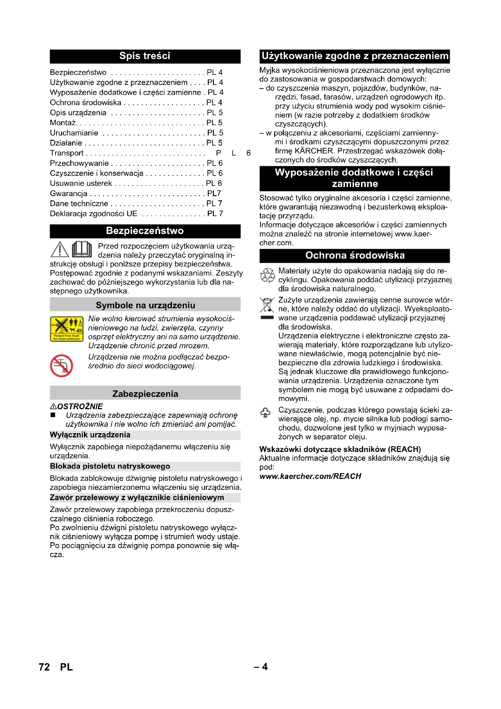 91 dB(A) Izjava EU o skladnosti Proizvod: visokotlačni čistilec Tip: 1.600-xxx Zadevne direktive EU: 2006/42/ES (+2009/127/ES) 2014/30/EU 2011/65/ЕU 2000/14/ES Uporabljeni usklajeni standardi: EN 60335–1 EN 60335–2–79 EN 62233: 2008 EN 55014–1: 2017 EN 55014–2: 2015 EN 61000–3–2: 2014 EN 61000–3–3: 2013 EN 50581 Postopek ocenjevanja skladnosti: 2000/14/ES: Priloga V Raven zvočne moči dB(A) Izmerjeno: 89 Zajamčeno: 91 Winnenden, 2020/08/01 Chairman of the Board of Management Director Regulatory Affairs & Certification 71SL– 4 Przed rozpoczęciem użytkowania urzą- dzenia należy przeczytać oryginalną in- strukcję obsługi i poniższe przepisy bezpieczeństwa. Postępować zgodnie z podanymi wskazaniami. Zeszyty zachować do późniejszego wykorzystania lub dla na- stępnego użytkownika. 몇 OSTROŻNIE Urządzenia zabezpieczające zapewniają ochronę użytkownika i nie wolno ich zmieniać ani pomijać. Wyłącznik zapobiega niepożądanemu włączeniu się urządzenia. Blokada zablokowuje dźwignię pistoletu natryskowego i zapobiega niezamierzonemu włączeniu się urządzenia. Zawór przelewowy zapobiega przekroczeniu dopusz- czalnego ciśnienia roboczego. Po zwolnieniu dźwigni pistoletu natryskowego wyłącz- nik ciśnieniowy wyłącza pompę i strumień wody ustaje. Po pociągnięciu za dźwignię pompa ponownie się włą- cza. Myjka wysokociśnieniowa przeznaczona jest wyłącznie do zastosowania w gospodarstwach domowych: – do czyszczenia maszyn, pojazdów, budynków, na- rzędzi, fasad, tarasów, urządzeń ogrodowych itp. przy użyciu strumienia wody pod wysokim ciśnie- niem (w razie potrzeby z dodatkiem środków czyszczących). – w połączeniu z akcesoriami, częściami zamienny- mi i środkami czyszczącymi dopuszczonymi przez firmę KÄRCHER. Przestrzegać wskazówek dołą- czonych do środków czyszczących. Stosować tylko oryginalne akcesoria i części zamienne, które gwarantują niezawodną i bezusterkową eksploa- tację przyrządu. Informacje dotyczące akcesoriów i części zamiennych można znaleźć na stronie internetowej www.kaer- cher.com. Wskazówki dotyczące składników (REACH) Aktualne informacje dotyczące składników znajdują się pod: www.kaercher.com/REACH Spis treści Bezpieczeństwo . . . . . . . . . . . . . . . . . . . . . . PL 4 Użytkowanie zgodne z przeznaczeniem . . . . PL 4 Wyposażenie dodatkowe i części zamienne . PL 4 Ochrona środowiska . . . . . . . . . . . . . . . . . . . PL 4 Opis urządzenia . . . . . . . . . . . . . . . . . . . . . . PL 5 Montaż. . . . . . . . . . . . . . . . . . . . . . . . . . . . . . PL 5 Uruchamianie . . . . . . . . . . . . . . . . . . . . . . . . PL 5 Działanie . . . . . . . . . . . . . . . . . . . . . . . . . . . . PL 5 Transport . . . . . . . . . . . . . . . . . . . . . . . . . . . .PL6 Przechowywanie . . . . . . . . . . . . . . . . . . . . . . PL 6 Czyszczenie i konserwacja . . . . . . . . . . . . . . PL 6 Usuwanie usterek . . . . . . . . . . . . . . . . . . . . . PL 6 Gwarancja . . . . . . . . . . . . . . . . . . . . . . . . . . . PL7 Dane techniczne . . . . . . . . . . . . . . . . . . . . . . PL 7 Deklaracja zgodności UE . . . . . . . . . . . . . . . PL 7 Bezpieczeństwo Symbole na urządzeniu Nie wolno kierować strumienia wysokociś- nieniowego na ludzi, zwierzęta, czynny osprzęt elektryczny ani na samo urządzenie. Urządzenie chronić przed mrozem. Urządzenia nie można podłączać bezpo- średnio do sieci wodociągowej. Zabezpieczenia Wyłącznik urządzenia Blokada pistoletu natryskowego Zawór przelewowy z wyłącznikie ciśnieniowym Użytkowanie zgodne z przeznaczeniem Wyposażenie dodatkowe i części zamienne Ochrona środowiska Materiały użyte do opakowania nadają się do re- cyklingu. Opakowania poddać utylizacji przyjaznej dla środowiska naturalnego. Zużyte urządzenia zawierają cenne surowce wtór- ne, które należy oddać do utylizacji. Wyeksploato- wane urządzenia poddawać utylizacji przyjaznej dla środowiska. Urządzenia elektryczne i elektroniczne często za- wierają materiały, które rozporządzane lub utylizo- wane niewłaściwie, mogą potencjalnie być nie- bezpieczne dla zdrowia ludzkiego i środowiska. Są jednak kluczowe dla prawidłowego funkcjono- wania urządzenia. Urządzenia oznaczone tym symbolem nie mogą być usuwane z odpadami do- mowymi. Czyszczenie, podczas którego powstają ścieki za- wierające olej, np. mycie silnika lub podłogi samo- chodu, dozwolone jest tylko w myjniach wyposa- żonych w separator oleju. 72 PL– 5 Zakres dostawy urządzenia przedstawiony jest na opa- kowaniu. Podczas rozpakowywania urządzenia należy sprawdzić, czy w opakowaniu znajdują się wszystkie elementy. W przypadku stwierdzenia braków w akcesoriach lub uszkodzeń przy transporcie należy zwrócić się do dys- trybutora. Rysunki patrz strona 2 1 Przyłącze wody z wbudowanym sitem 2 Złączka do przyłącza wody 3 Przyłącze wysokiego ciśnienia 4 Magazyn na akcesoria 5 Uchwyt do noszenia przenoszenia 6 Przewód zasilający z wtyczką 7 Klips kablowy 8 Schowek na przewód zasilający 9 Wyłącznik urządzenia „0/OFF“ / „I/ON“ 10 Pistolet natryskowy 11 Blokada pistoletu natryskowego 12 Klamra na węża wysokociśnieniowego 13 Tuleja zabezpieczająca 14 Przedłużka rury strumieniowej 15 Lanca z regulacją ciśnienia (Vario Power) Ciśnienie robocze można płynnie zwiększać z po- ziomu „SOFT” do „HARD”. W celu dokonania zmia- ny ciśnienia roboczego należy zwolnić dźwignię pistoletu wysokociśnieniowego i ustawić lancę w żądanym położeniu. 16 Wąż wysokociśnieniowy Przed uruchomieniem zamontować luźno dołączone części do urządzenia. Rysunki patrz strona 3 Rysunek Przykręcić dołączoną złączkę do przyłącza wody na urządzeniu. Rysunek Wyjąć klamrę na wąż wysokociśnieniowy z pistole- tu natryskowego. Rysunek Wstawić wąż wysokociśnieniowy do pistoletu na- tryskowego. Wcis