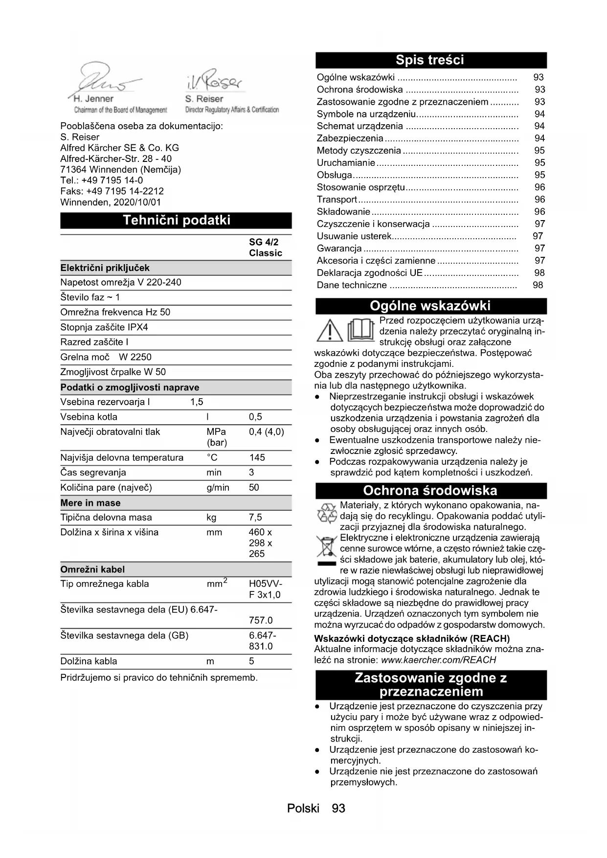 Servisna služba Če motnje ni mogoče odpraviti, mora napravo pregleda- ti servisna služba. Garancija V vsaki državi veljajo garancijski pogoji, ki jih je izdala naša pristojna prodajna družba. V garancijskem roku bodo morebitne motnje v delovanju naprave odpravlje- ne brezplačno, če je njihov vzrok napaka v materialu ali napaka pri proizvodnji. Pri uveljavljenju garancije zago- tovite dokazilo o nakupu in stopite v stik s prodajalcem ali z najbližjo servisno službo. Naslov najdete na hrbtni strani. Pribor in nadomestni deli Uporabljajte samo originalni pribor in originalne nado- mestne dele, ki zagotavljajo varno in nemoteno delova- nje naprave. Informacije o priboru in nadomestnih delih najdete na spletnem naslovu www.kaercher.com. Posebni pribor Uporablja se lahko samo posebni pribor, ki ga je odobril proizvajalec. Izjava EU o skladnosti S tem izjavljamo, da v nadaljevanju navedeni stroj zara- di svoje zasnove in konstrukcije ter v izvedbi, kakršno dajemo na tržišče, ustreza osnovnim zahtevam glede varnosti in varovanja zdravja v skladu z EU-direktivami. V primeru sprememb na stroju brez našega soglasja ta izjava izgubi veljavnost. Izdelek: Parni čistilnik Tip: 1.092-xxx Zadevne EU-direktive 2009/125/ES 2014/30/EU 2014/35/EU Uporabljeni harmonizirani standardi EN 55014-1: 2017 + A11: 2020 EN 55014-2: 2015 EN 60335-1 EN 60335-2-54 EN 61000-3-2: 2014 EN 61000-3-3: 2013 EN 62233: 2008 Uporabljeni nacionalni standardi TRD 801 Podpisniki ravnajo po navodilih in s pooblastilom upra- ve. Ime Številka za naro- čilo Organsko sredstvo za odstranjeva- nje vodnega kamna RM 511 (3 x 100 g prašek) 6.295-987.0 Komplet krp iz bombažnega frotirja 6.370-990.0 Podaljševalna cev za talno šobo (potrebna sta 2 kosa) 4.127-024.0 Talna šoba z lamelami 2.885-465.0 Šoba za nego tekstila 2.863-233.0Polski 93 Pooblaščena oseba za dokumentacijo: S. Reiser Alfred Kärcher SE & Co. KG Alfred-Kärcher-Str. 28 - 40 71364 Winnenden (Nemčija) Tel.: +49 7195 14-0 Faks: +49 7195 14-2212 Winnenden, 2020/10/01 Tehnični podatki Pridržujemo si pravico do tehničnih sprememb. Spis treści Ogólne wskazówki Przed rozpoczęciem użytkowania urzą- dzenia należy przeczytać oryginalną in- strukcję obsługi oraz załączone wskazówki dotyczące bezpieczeństwa. Postępować zgodnie z podanymi instrukcjami. Oba zeszyty przechować do późniejszego wykorzysta- nia lub dla następnego użytkownika. ● Nieprzestrzeganie instrukcji obsługi i wskazówek dotyczących bezpieczeństwa może doprowadzić do uszkodzenia urządzenia i powstania zagrożeń dla osoby obsługującej oraz innych osób. ● Ewentualne uszkodzenia transportowe należy nie- zwłocznie zgłosić sprzedawcy. ● Podczas rozpakowywania urządzenia należy je sprawdzić pod kątem kompletności i uszkodzeń. Ochrona środowiska Materiały, z których wykonano opakowania, na- dają się do recyklingu. Opakowania poddać utyli- zacji przyjaznej dla środowiska naturalnego. Elektryczne i elektroniczne urządzenia zawierają cenne surowce wtórne, a często również takie czę- ści składowe jak baterie, akumulatory lub olej, któ- re w razie niewłaściwej obsługi lub nieprawidłowej utylizacji mogą stanowić potencjalne zagrożenie dla zdrowia ludzkiego i środowiska naturalnego. Jednak te części składowe są niezbędne do prawidłowej pracy urządzenia. Urządzeń oznaczonych tym symbolem nie można wyrzucać do odpadów z gospodarstw domowych. Wskazówki dotyczące składników (REACH) Aktualne informacje dotyczące składników można zna- leźć na stronie: www.kaercher.com/REACH Zastosowanie zgodne z przeznaczeniem ● Urządzenie jest przeznaczone do czyszczenia przy użyciu pary i może być używane wraz z odpowied- nim osprzętem w sposób opisany w niniejszej in- strukcji. ● Urządzenie jest przeznaczone do zastosowań ko- mercyjnych. ● Urządzenie nie jest przeznaczone do zastosowań przemysłowych. SG 4/2 Classic Električni priključek Napetost omrežja V 220-240 Število faz ~ 1 Omrežna frekvenca Hz 50 Stopnja zaščite IPX4 Razred zaščite I Grelna moč W 2250 Zmogljivost črpalke W 50 Podatki o zmogljivosti naprave Vsebina rezervoarja l 1,5 Vsebina kotla l 0,5 Največji obratovalni tlak MPa (bar) 0,4 (4,0) Najvišja delovna temperatura °C 145 Čas segrevanja min 3 Količina pare (največ)g/min50 Mere in mase Tipična delovna masa kg 7,5 Dolžina x širina x višina mm 460 x 298 x