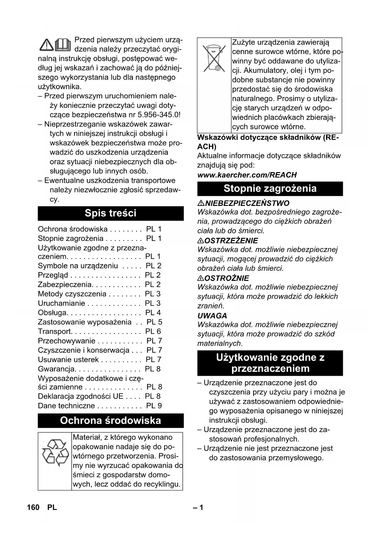 Št. delov Dolžina ka- bla CN 6.650-597.0 7,5 m 159SL– 1 Przed pierwszym użyciem urzą- dzenia należy przeczytać orygi- nalną instrukcję obsługi, postępować we- dług jej wskazań i zachować ją do później- szego wykorzystania lub dla następnego użytkownika. – Przed pierwszym uruchomieniem nale- ży koniecznie przeczytać uwagi doty- czące bezpieczeństwa nr 5.956-345.0! – Nieprzestrzeganie wskazówek zawar- tych w niniejszej instrukcji obsługi i wskazówek bezpieczeństwa może pro- wadzić do uszkodzenia urządzenia oraz sytuacji niebezpiecznych dla ob- sługującego lub innych osób. – Ewentualne uszkodzenia transportowe należy niezwłocznie zgłosić sprzedaw- cy. Wskazówki dotyczące składników (RE- ACH) Aktualne informacje dotyczące składników znajdują się pod: www.kaercher.com/REACH NIEBEZPIECZEŃSTWO Wskazówka dot. bezpośredniego zagroże- nia, prowadzącego do ciężkich obrażeń ciała lub do śmierci. 몇 OSTRZEŻENIE Wskazówka dot. możliwie niebezpiecznej sytuacji, mogącej prowadzić do ciężkich obrażeń ciała lub śmierci. 몇 OSTROŻNIE Wskazówka dot. możliwie niebezpiecznej sytuacji, która może prowadzić do lekkich zranień. UWAGA Wskazówka dot. możliwie niebezpiecznej sytuacji, która może prowadzić do szkód materialnych. – Urządzenie przeznaczone jest do czyszczenia przy użyciu pary i można je używać z zastosowaniem odpowiednie- go wyposażenia opisanego w niniejszej instrukcji obsługi. – Urządzenie przeznaczone jest do za- stosowań profesjonalnych. – Urządzenie nie jest przeznaczone jest do zastosowania przemysłowego. Spis treści Ochrona środowiska . . . . . . . . PL 1 Stopnie zagrożenia . . . . . . . . . PL 1 Użytkowanie zgodne z przezna- czeniem. . . . . . . . . . . . . . . . . . PL 1 Symbole na urządzeniu . . . . . PL 2 Przegląd . . . . . . . . . . . . . . . . . PL 2 Zabezpieczenia. . . . . . . . . . . . PL 2 Metody czyszczenia . . . . . . . . PL 3 Uruchamianie . . . . . . . . . . . . . PL 3 Obsługa. . . . . . . . . . . . . . . . . . PL 4 Zastosowanie wyposażenia . . PL 5 Transport. . . . . . . . . . . . . . . . . PL 6 Przechowywanie . . . . . . . . . . . PL 7 Czyszczenie i konserwacja . . . PL 7 Usuwanie usterek . . . . . . . . . . PL 7 Gwarancja. . . . . . . . . . . . . . . . PL 8 Wyposażenie dodatkowe i czę- ści zamienne . . . . . . . . . . . . . . PL 8 Deklaracja zgodności UE . . . . PL 8 Dane techniczne . . . . . . . . . . . PL 9 Ochrona środowiska Materiał, z którego wykonano opakowanie nadaje się do po- wtórnego przetworzenia. Prosi- my nie wyrzucać opakowania do śmieci z gospodarstw domo- wych, lecz oddać do recyklingu. Zużyte urządzenia zawierają cenne surowce wtórne, które po- winny być oddawane do utyliza- cji. Akumulatory, olej i tym po- dobne substancje nie powinny przedostać się do środowiska naturalnego. Prosimy o utyliza- cję starych urządzeń w odpo- wiednich placówkach zbierają- cych surowce wtórne. Stopnie zagrożenia Użytkowanie zgodne z przeznaczeniem 160 PL– 2 Para UWAGA - niebezpieczeństwo opa- rzenia Rysunek 1 Zamknięcie bezpieczeństwa (kocioł pa- rowy) 2 Pole obsługi 3 wąż pary 4 Przycisk resetu - Odkamienianie 5 Przełącznik pary 6 Magazyn na akcesoria 7 Pokrywa gniazda urządzenia 8 wtyczka przewodu parowego 9 Uchwyt do noszenia 10 Hak kablowy 11 Maska 12 Zamek pojemnika (zbiornik czystej wody) 13 nakładka frotte 14 Lejek do napełniania 15 dysza ręczna 16 Dysza do okien (wyposażenie specjalne) 17 Kabel sieciowy 18 klamry mocujące 19 Dysza podłogowa ze szczeciną 20 Ścierka do podłóg (dysza podłoga ze szczeciną) 21 szczotka okrągła 22 Dysza Power (czerwona) 23 Przedłużka 24 Dysza podłogowa z płytkami 25 Dysza ze strumieniem punktowym (120 mm) 26 Dysza ze strumieniem punktowym (180 mm) 27 Ścierka do podłóg (dysza podłogowa z płytkami) 28 Przycisk blokujący 29 Rura przedłużająca 30 Blokada (zabezpieczenie przed dziećmi) 31 pistolet parowy Rysunek 1 Wyłącznik - pompa zbiornika czystej wody 2 Kontrolka - Grzałka (żółta) 3 Kontrolka - Brak wody w kotle parowym (czerwona) 4 Wskaźnik temperatury 5 Gałka obrotowa do regulacji VAPOHY- DRO 6 Gałka obrotowa do regulacji ilości pary 7 Zakres temperatury roboczej 8 Kontrolka - Odkamienianie (biała) 9 Lampka kontrolna - Brak wody w zbior- niku czystej wody (czerwona) 10 Przełącznik - Grzałka (Zał./Wył.) – Elementy obsługi procesu czyszczenia są żółte. – Elementy obsługi konserwacji i serwisu są jasnoszare. Zabezpieczenia służą ochronie użytkowni- ka i nie mogą być odłączone albo pominięte w swoim działaniu. Podczas pracy regulator ciśnienia utrzymu- je możliwie stałe ciśnienie w kotle. Po osią- gnięciu maksymalnego ciśnienia robocze- go 4 bar w kotle grzałka wyłącza się i włą- cza się ponownie przy spadku ciśnienia w kotle na skutek poboru pary. Gdy woda w kotle kończy się, temperatura przy grzałce wzrasta. Termostat braku wody odłącza grzałkę i zapala się czerwo- na kontrolka „Brak wody“. Ponowne włą- czenie grzałki jest blokowane tak długo, aż kocioł wystygnie lub zostanie napełniony na nowo. Symbole na urządzeniu Niebezpieczeństwo oparzenia przez gorące powierzchnie! Przegląd Elementy urządzenia Pole obsługi Kolor oznaczenia Zabezpieczenia Regulator ciśnienia Termostat braku wody 161PL– 3 – Gdy termostat braku wody ulegnie awa- rii i urządzenie przegrzeje się, to termo- stat bezpieczeństwa wyłącza urządze- nie. – W celu zresetowania termostatu bez- pieczeństwa należy zwrócić się do ser- wisu KÄRCHER. – Zawór bezpieczeństwa stanowi za- mknięcie pozwalające utrzymać ciśnie- nie w kotle. W przypadku uszkodzenia regulatora ciśnienia i wytworzenia się nadciśnienia w kotle, w zamknięciu bezpieczeństwa otwiera się zawór nad- ciśnieniowy i para uchodzi przez za- mknięcie na zewnątrz. – Przed ponownym uruchomieniem urzą- dzenia należy zwrócić się do wła