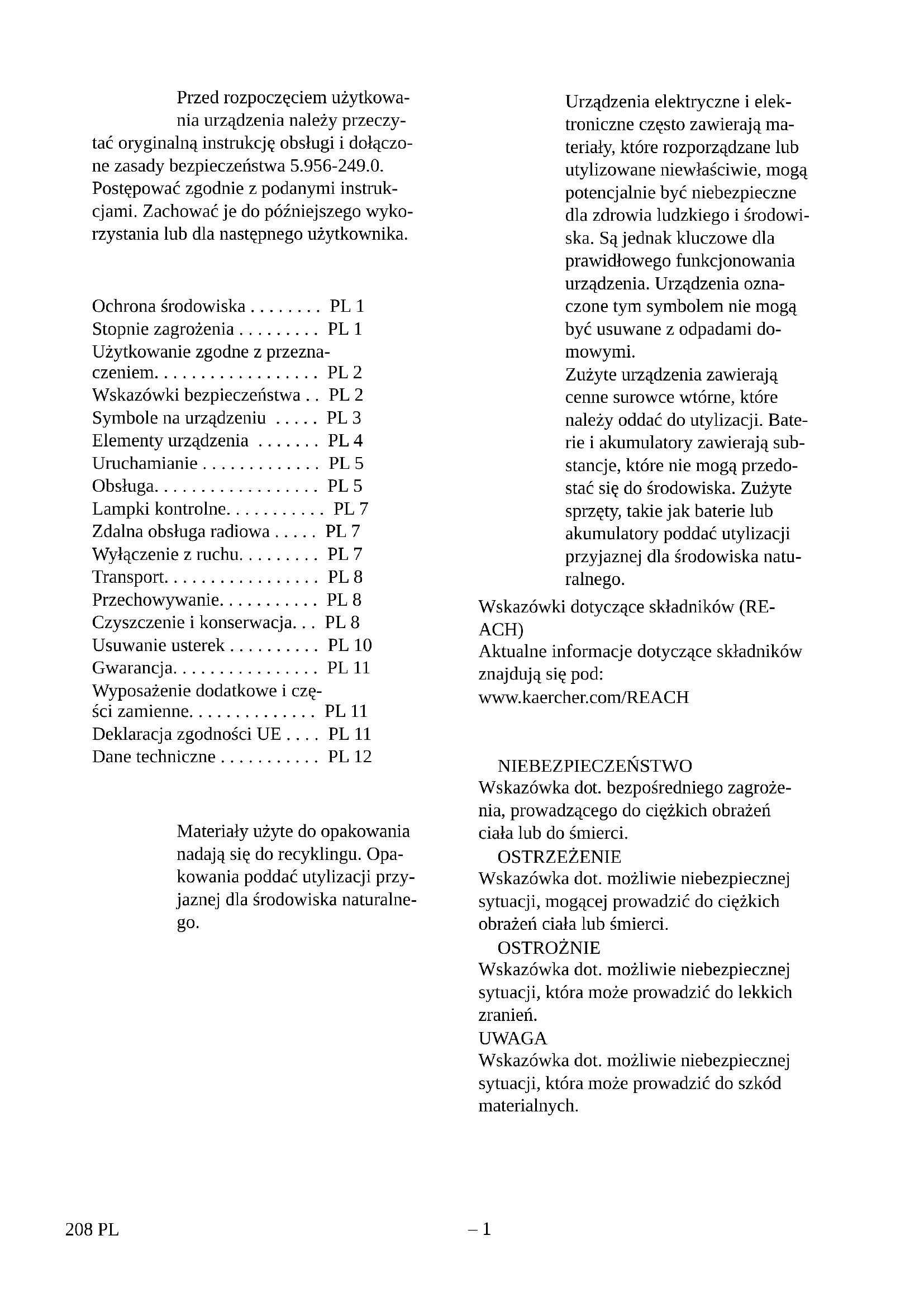 207SL– 1 Przed rozpoczęciem użytkowa- nia urządzenia należy przeczy- tać oryginalną instrukcję obsługi i dołączo- ne zasady bezpieczeństwa 5.956-249.0. Postępować zgodnie z podanymi instruk- cjami. Zachować je do późniejszego wyko- rzystania lub dla następnego użytkownika. Wskazówki dotyczące składników (RE- ACH) Aktualne informacje dotyczące składników znajdują się pod: www.kaercher.com/REACH NIEBEZPIECZEŃSTWO Wskazówka dot. bezpośredniego zagroże- nia, prowadzącego do ciężkich obrażeń ciała lub do śmierci. 몇 OSTRZEŻENIE Wskazówka dot. możliwie niebezpiecznej sytuacji, mogącej prowadzić do ciężkich obrażeń ciała lub śmierci. 몇 OSTROŻNIE Wskazówka dot. możliwie niebezpiecznej sytuacji, która może prowadzić do lekkich zranień. UWAGA Wskazówka dot. możliwie niebezpiecznej sytuacji, która może prowadzić do szkód materialnych. Spis treści Ochrona środowiska . . . . . . . . PL 1 Stopnie zagrożenia . . . . . . . . . PL 1 Użytkowanie zgodne z przezna- czeniem. . . . . . . . . . . . . . . . . . PL 2 Wskazówki bezpieczeństwa . . PL 2 Symbole na urządzeniu . . . . . PL 3 Elementy urządzenia . . . . . . . PL 4 Uruchamianie . . . . . . . . . . . . . PL 5 Obsługa. . . . . . . . . . . . . . . . . . PL 5 Lampki kontrolne. . . . . . . . . . . PL 7 Zdalna obsługa radiowa . . . . . PL 7 Wyłączenie z ruchu. . . . . . . . . PL 7 Transport. . . . . . . . . . . . . . . . . PL 8 Przechowywanie. . . . . . . . . . . PL 8 Czyszczenie i konserwacja. . . PL 8 Usuwanie usterek . . . . . . . . . . PL 10 Gwarancja. . . . . . . . . . . . . . . . PL 11 Wyposażenie dodatkowe i czę- ści zamienne. . . . . . . . . . . . . . PL 11 Deklaracja zgodności UE . . . . PL 11 Dane techniczne . . . . . . . . . . . PL 12 Ochrona środowiska Materiały użyte do opakowania nadają się do recyklingu. Opa- kowania poddać utylizacji przy- jaznej dla środowiska naturalne- go. Urządzenia elektryczne i elek- troniczne często zawierają ma- teriały, które rozporządzane lub utylizowane niewłaściwie, mogą potencjalnie być niebezpieczne dla zdrowia ludzkiego i środowi- ska. Są jednak kluczowe dla prawidłowego funkcjonowania urządzenia. Urządzenia ozna- czone tym symbolem nie mogą być usuwane z odpadami do- mowymi. Zużyte urządzenia zawierają cenne surowce wtórne, które należy oddać do utylizacji. Bate- rie i akumulatory zawierają sub- stancje, które nie mogą przedo- stać się do środowiska. Zużyte sprzęty, takie jak baterie lub akumulatory poddać utylizacji przyjaznej dla środowiska natu- ralnego. Stopnie zagrożenia 208 PL– 2 – Niniejszy odkurzacz przeznaczony jest do czyszczenia mokrych i suchych po- wierzchni podłogowych i ściennych. – Niniejsze urządzenie jest przeznaczo- ne do odkurzania suchych, niepalnych pyłów z maszyn. – Urządzenie jest odpowiednie do odsy- sania wilgotnych i płynnych substancji. – Urządzenie nadaje się do odkurzania suchych, niepalnych i szkodliwych dla zdrowia pyłów; chodzi klasę pyłów M wg EN 60 335–2–69. Ograniczenie: Zabronione jest zasysanie substancji rakotwórczych. – Urządzenie przeznaczone jest do za- stosowań profesjonalnych. – Zakres dostawy nie obejmuje akceso- riów. Akcesoria należy zamówić oddziel- nie w zależności od aplikacji. – Prawidłowe funkcjonowanie urządzenia gwarantują wyłącznie wymiary znamio- nowe węża ssącego EDN42, DN52 i DN