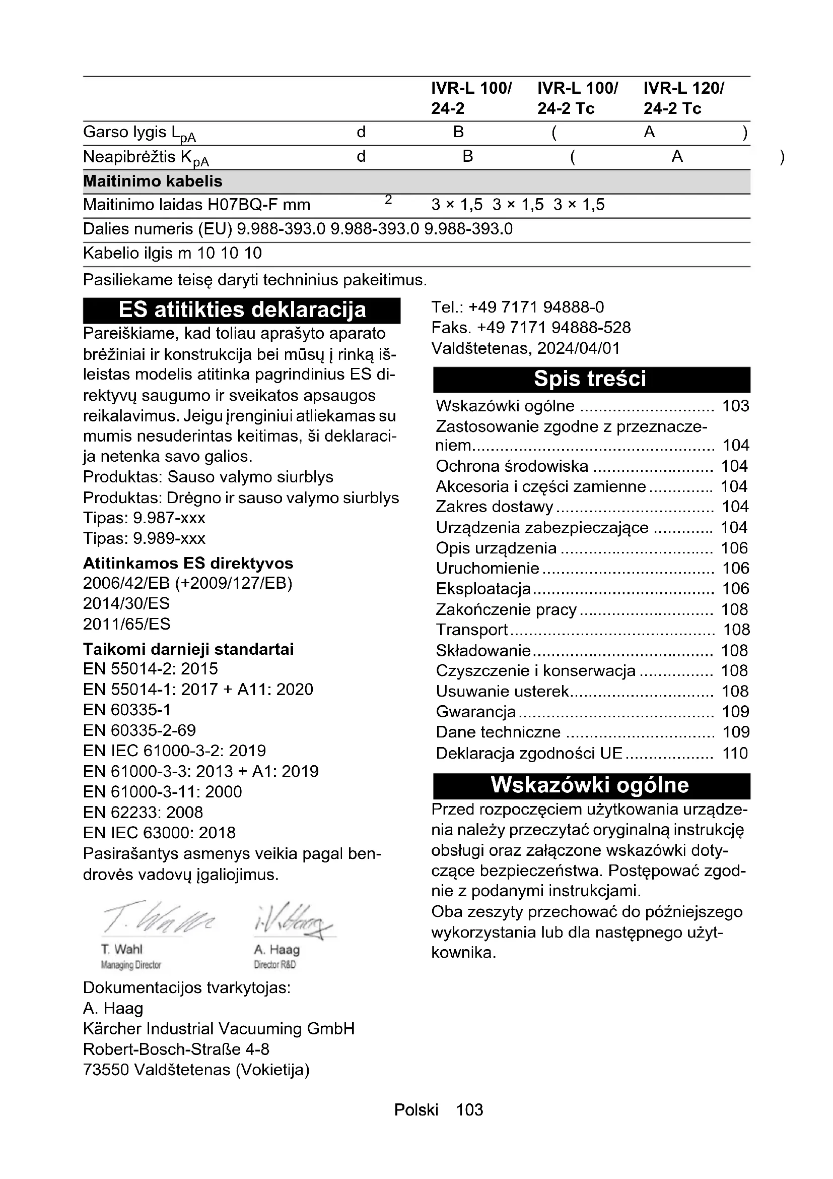 EN 61000-3-3: 2013 + A1: 2019 EN 61000-3-11: 2000 EN 62233: 2008 EN IEC 63000: 2018 Pasirašantys asmenys veikia pagal ben- drovės vadovų įgaliojimus. Dokumentacijos tvarkytojas: A. Haag Kärcher Industrial Vacuuming GmbH Robert-Bosch-Straße 4-8 73550 Valdštetenas (Vokietija) Tel.: +49 7171 94888-0 Faks. +49 7171 94888-528 Valdštetenas, 2024/04/01 Spis treści Wskazówki ogólne Przed rozpoczęciem użytkowania urządze- nia należy przeczytać oryginalną instrukcję obsługi oraz załączone wskazówki doty- czące bezpieczeństwa. Postępować zgod- nie z podanymi instrukcjami. Oba zeszyty przechować do późniejszego wykorzystania lub dla następnego użyt- kownika. Garso lygis L