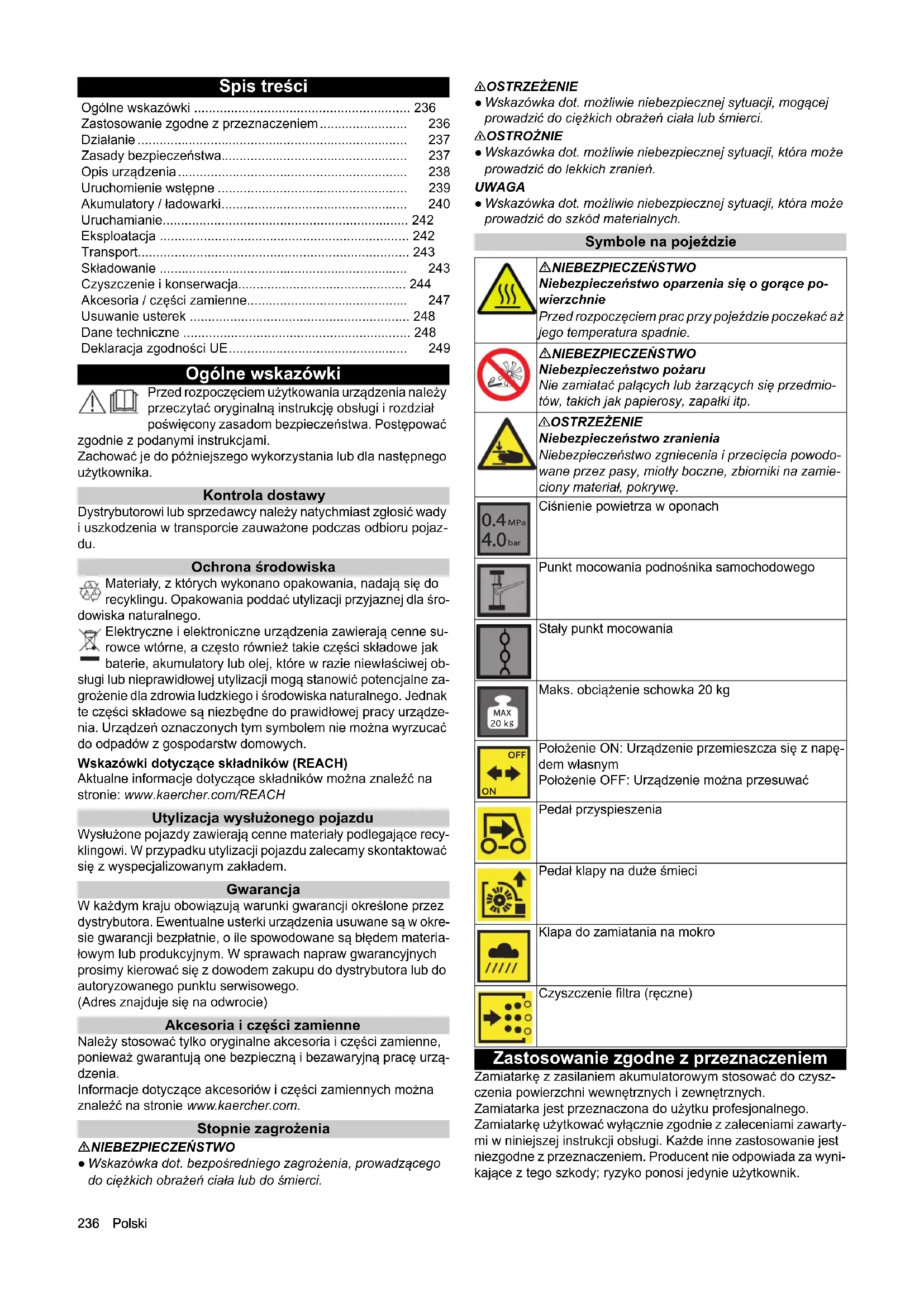 - GSM 824,2–848,8 1510 1850,2–1909,8 870 WLAN 2400–2483 96 Chairman of the Board of Management Director Regulatory Affairs & Certification H. Jenner S. Reiser236 Polski Spis treści Ogólne wskazówki Przed rozpoczęciem użytkowania urządzenia należy przeczytać oryginalną instrukcję obsługi i rozdział poświęcony zasadom bezpieczeństwa. Postępować zgodnie z podanymi instrukcjami. Zachować je do późniejszego wykorzystania lub dla następnego użytkownika. Kontrola dostawy Dystrybutorowi lub sprzedawcy należy natychmiast zgłosić wady i uszkodzenia w transporcie zauważone podczas odbioru pojaz- du. Ochrona środowiska Materiały, z których wykonano opakowania, nadają się do recyklingu. Opakowania poddać utylizacji przyjaznej dla śro- dowiska naturalnego. Elektryczne i elektroniczne urządzenia zawierają cenne su- rowce wtórne, a często również takie części składowe jak baterie, akumulatory lub olej, które w razie niewłaściwej ob- sługi lub nieprawidłowej utylizacji mogą stanowić potencjalne za- grożenie dla zdrowia ludzkiego i środowiska naturalnego. Jednak te części składowe są niezbędne do prawidłowej pracy urządze- nia. Urządzeń oznaczonych tym symbolem nie można wyrzucać do odpadów z gospodarstw domowych. Wskazówki dotyczące składników (REACH) Aktualne informacje dotyczące składników można znaleźć na stronie: www.kaercher.com/REACH Utylizacja wysłużonego pojazdu Wysłużone pojazdy zawierają cenne materiały podlegające recy- klingowi. W przypadku utylizacji pojazdu zalecamy skontaktować się z wyspecjalizowanym zakładem. Gwarancja W każdym kraju obowiązują warunki gwarancji określone przez dystrybutora. Ewentualne usterki urządzenia usuwane są w okre- sie gwarancji bezpłatnie, o ile spowodowane są błędem materia- łowym lub produkcyjnym. W sprawach napraw gwarancyjnych prosimy kierować się z dowodem zakupu do dystrybutora lub do autoryzowanego punktu serwisowego. (Adres znajduje się na odwrocie) Akcesoria i części zamienne Należy stosować tylko oryginalne akcesoria i części zamienne, ponieważ gwarantują one bezpieczną i bezawaryjną pracę urzą- dzenia. Informacje dotyczące akcesoriów i części zamiennych można znaleźć na stronie www.kaercher.com. Stopnie zagrożenia NIEBEZPIECZEŃSTWO ● Wskazówka dot. bezpośredniego zagrożenia, prowadzącego do ciężkich obrażeń ciała lub do śmierci. 몇 OSTRZEŻENIE ● Wskazówka dot. możliwie niebezpiecznej sytuacji, mogącej prowadzić do ciężkich obrażeń ciała lub śmierci. 몇 OSTROŻNIE ● Wskazówka dot. możliwie niebezpiecznej sytuacji, która może prowadzić do lekkich zranień. UWAGA ● Wskazówka dot. możliwie niebezpiecznej sytuacji, która może prowadzić do szkód materialnych. Symbole na pojeździe Zastosowanie zgodne z przeznaczeniem Zamiatarkę z zasilaniem akumulatorowym stosować do czysz- czenia powierzchni wewnętrznych i zewnętrznych. Zamiatarka jest przeznaczona do użytku profesjonalnego. Zamiatarkę użytkować wyłącznie zgodnie z zaleceniami zawarty- mi w niniejszej instrukcji obsługi. Każde inne zastosowanie jest niezgodne z przeznaczeniem. Producent nie odpowiada za wyni- kające z tego szkody; ryzyko ponosi jedynie użytkownik. Ogólne wskazówki p. 236