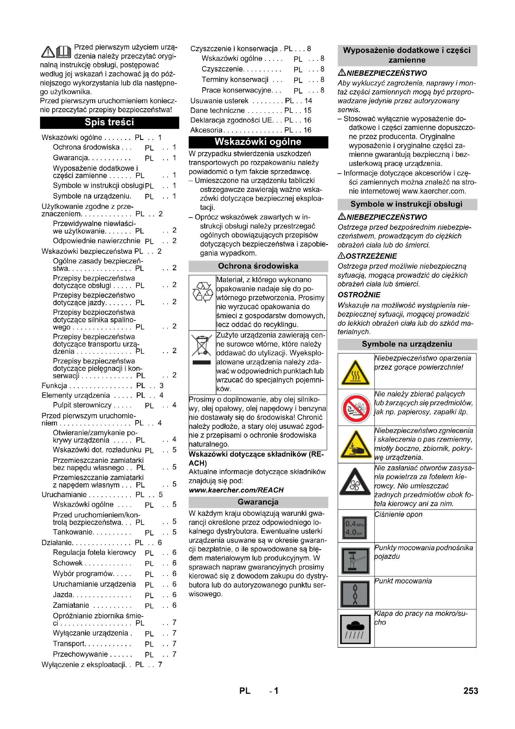 - PL Wskazówki ogólne Ochrona środowiska Materiał, z którego wykonano opakowanie nadaje się do po- wtórnego przetworzenia. Prosimy nie wyrzucać opakowania do śmieci z gospodarstw domowych, lecz oddać do recyklingu. Zużyte urządzenia zawierają cen- ne surowce wtórne, które należy oddawać do utylizacji. Wyeksplo- atowane urządzenia należy zda- wać w odpowiednich punktach lub wrzucać do specjalnych pojemni- ków. Prosimy o dopilnowanie, aby olej silniko- wy, olej opałowy, olej napędowy i benzyna nie dostawały się do środowiska! Chronić należy podłoże, a stary olej usuwać zgod- nie z przepisami o ochronie środowiska naturalnego. Gwarancja Wyposażenie dodatkowe i części zamienne Symbole w instrukcji obsługi Symbole na urządzeniu Niebezpieczeństwo oparzenia przez gorące powierzchnie! Nie należy zbierać palących lub żarzących się przedmiotów, jak np. papierosy, zapałki itp. Niebezpieczeństwo zgniecenia i skaleczenia o pas rzemienny, miotły boczne, zbiornik, pokry- wę urządzenia. Nie zasłaniać otworów zasysa- nia powietrza za fotelem kie- rowcy. Nie umieszczać żadnych przedmiotów obok fo- tela kierowcy ani za nim. Ciśnienie opon Punkty mocowania podnośnika pojazdu Punkt mocowania Klapa do pracy na mokro/su- cho 253PL- 2 Zamiatarkę należy stosować wyłącznie zgodnie z niniejszą instrukcją obsługi. – Zamiatarka jest przeznaczona do za- miatania zanieczyszczonych po- wierzchni zewnętrznych. – Urządzenie nie jest dopuszczone do ot- wartego ruchu drogowego. – Każde inne zastosowanie jest niezgod- ne z przeznaczeniem. Producent nie odpowiada za wynikające z tego szko- dy; ryzyko ponosi jedynie użytkownik. – Eksploatacja urządzenia w pomiesz- czeniach zamkniętych jest zabroniona. – Nie należy dokonywać żadnych modyfi- kacji urządzenia. – Urządzenie jest przeznaczone wyłącz- nie do zastosowania w celach wymie- nionych w instrukcji obsługi. – Urządzenie może pracować wyłącznie na powierzchniach wskazanych przez właściciela lub jego pełnomocnika. – Zasadniczo obowiązuje zasada: nie przechowywać łatwo zapalnych mate- riałów w pobliżu urządzenia (niebezpie- czeństwo wybuchu/pożaru). – Nigdy nie zamiatać i nie zasysać cieczy wybuchowych, gazów palnych ani nie- rozcieńczonych kwasów lub rozpusz- czalników! Zaliczają się do nich benzyna, rozcieńczalniki do farb lub olej opałowy, które w wyniku zmiesza- nia z zasysanym powietrzem mogą tworzyć opary lub mieszanki wybucho- we, ponadto aceton, nierozcieńczone kwasy i rozpuszczalniki, mogące znisz- czyć materiały, z których wykonane jest urządzenie. – Nigdy nie zamiatać/zbierać reaktyw- nych pyłków metalowych (np. alumi- nium, magnezu, cynku), gdyż w połączeniu z mocno alkalicznymi albo kwaśnymi środkami czyszczącymi two- rzą one gazy wybuchowe. – Nie można go stosować do zbierania substancji niebezpiecznych dla zdrowia. – Nie zamiatać i nie zasysać płonących ani żarzących się przedmiotów. – Przebywanie w obszarze zagrożenia jest zabronione. Eksploatacja urządze- nia w pomieszczeniach zagrożonych wybuchem jest zabroniona. – Zabieranie pasażerów jest niedozwolo- ne. – Przesuwanie/przeciąganie i transporto- wanie przedmiotów za pomocą tego urządzenia jest niedozwolone. – asfalt – podłoga przemysłowa – jastrych – beton – kostka brukowa – Przed rozpoczęciem pracy należy sprawdzić urządzenie z wyposażeniem roboczym pod kątem prawidłowego stanu i bezpieczeństwa eksploatacji. Jeżeli nie jest on poprawny, to sprzętu takiego nie wolno używać. – Podczas użytkowania w obszarach za- grożonych (np. na stacjach benzyno- wych) należy przestrzegać stosownych przepisów bezpieczeństwa. Eksploata- cja urządzenia w pomieszczeniach za- grożonych wybuchem jest zabroniona. – Użytkownik ma obowiązek używania urządzenia zgodnie z jego przeznacze- niem. Podczas pracy urządzenia musi on uwzglę dniać warunki panujące w otoczeniu i uważać na inne osoby, zwłaszcza dzieci. – Przed rozpoczęciem prac operator musi się upewnić, że wszystkie urzą- dzenia zabezpieczające są odpowied- nio założone i działają właściwie. – Operator urządzenia jest odpowiedzial- ny za wypadki z udziałem innych osób lub ich własnością. – Operator musi zwrócić uwagę na po- trzebę używania ściśle przylegającej odzieży. Używać mocnego obuwia i unikać luźnych ubrań. – Przed najazdem skontrolować obszar w pobliżu (np. dzieci). Upewnić się, ż p. 16