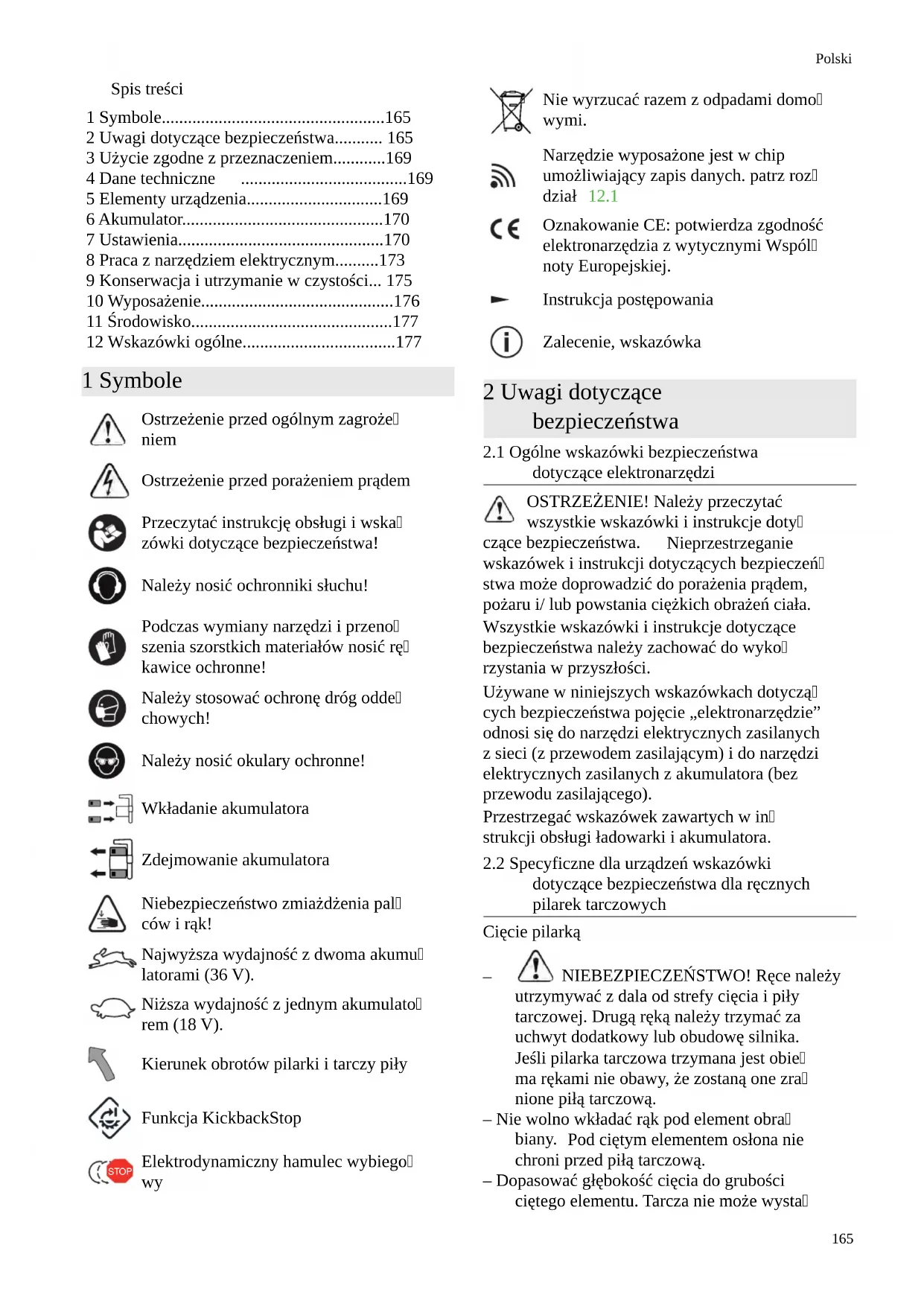 - 12 Wskazówki ogólne 1 Symbole Ostrzeżenie przed ogólnym zagroże niem Ostrzeżenie przed porażeniem prądem Przeczytać instrukcję obsługi i wska zówki dotyczące bezpieczeństwa! Należy nosić ochronniki słuchu! Podczas wymiany narzędzi i przeno szenia szorstkich materiałów nosić rę kawice ochronne! Należy stosować ochronę dróg odde chowych! Należy nosić okulary ochronne! Wkładanie akumulatora Zdejmowanie akumulatora Niebezpieczeństwo zmiażdżenia pal ców i rąk! Najwyższa wydajność z dwoma akumu latorami (36 V). Niższa wydajność z jednym akumulato rem (18 V). Kierunek obrotów pilarki i tarczy piły Funkcja KickbackStop STOP Elektrodynamiczny hamulec wybiego p. 177