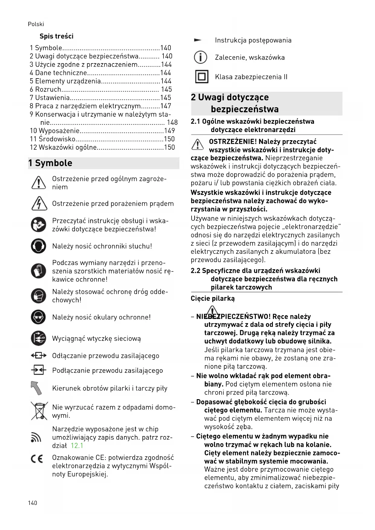- 12 Wskazówki ogólne 1 Symbole Ostrzeżenie przed ogólnym zagroże niem Ostrzeżenie przed porażeniem prądem Przeczytać instrukcję obsługi i wska zówki dotyczące bezpieczeństwa! Należy nosić ochronniki słuchu! Podczas wymiany narzędzi i przeno szenia szorstkich materiałów nosić rę kawice ochronne! Należy stosować ochronę dróg odde chowych! Należy nosić okulary ochronne! Wyciągnąć wtyczkę sieciową Odłączanie przewodu zasilającego Podłączanie przewodu zasilającego Kierunek obrotów pilarki i tarczy piły Nie wyrzucać razem z odpadami domo wymi. Narzędzie wyposażone jest w chip umożliwiający zapis danych. patrz roz dział 12.1 Oznakowanie CE: potwierdza zgodność elektronarzędzia z wytycznymi Wspól noty Europejskiej. Instrukcja postępowania Zalecenie, wskazówka Klasa zabezpieczenia II 2 Uwagi dotyczące bezpieczeństwa p. 150