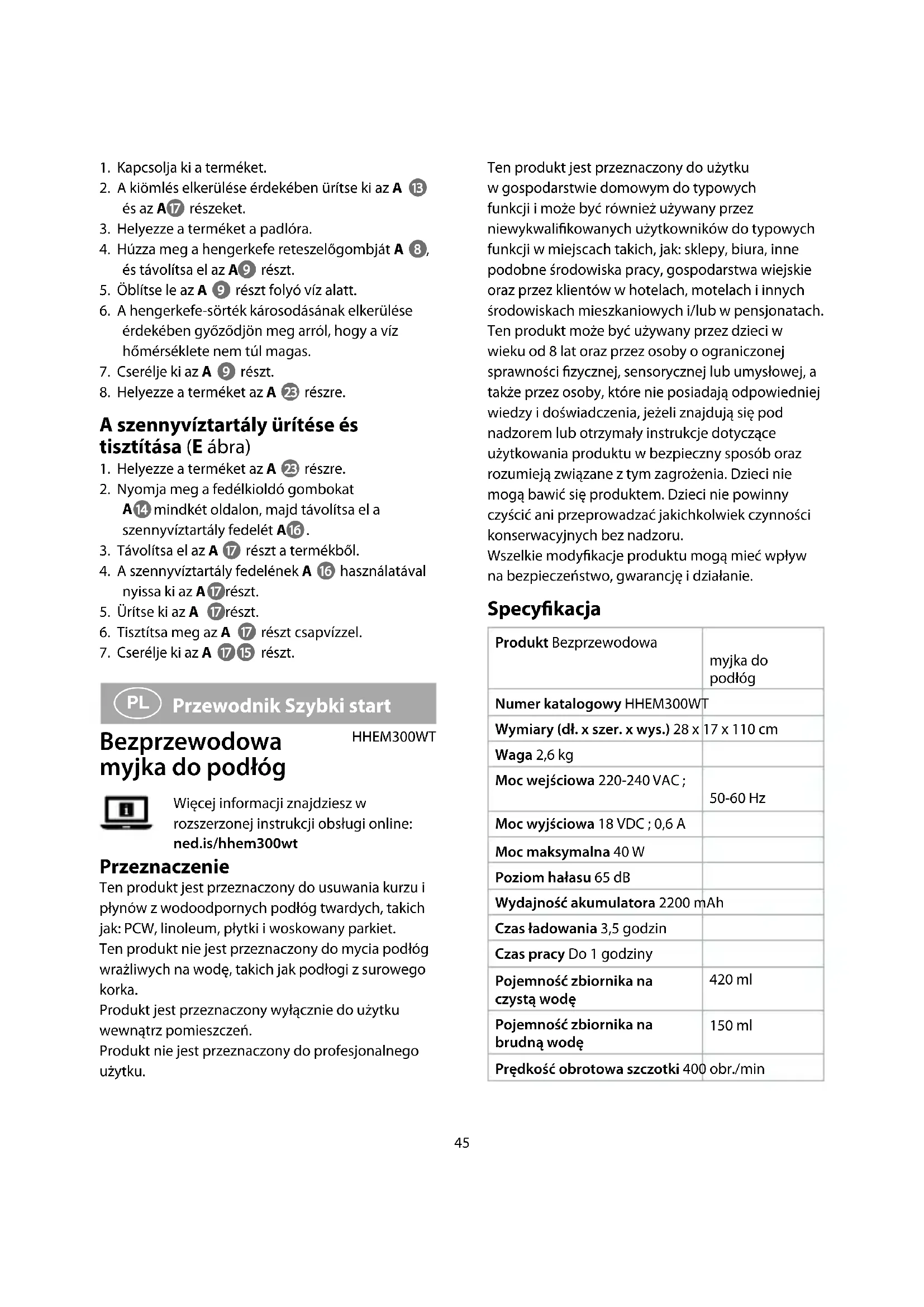 egy porszívóval tisztítsa meg a padlót.45 Ten produkt jest przeznaczony do użytku w gospodarstwie domowym do typowych funkcji i może być również używany przez niewykwalikowanych użytkowników do typowych funkcji w miejscach takich, jak: sklepy, biura, inne podobne środowiska pracy, gospodarstwa wiejskie oraz przez klientów w hotelach, motelach i innych środowiskach mieszkaniowych i/lub w pensjonatach. Ten produkt może być używany przez dzieci w wieku od 8 lat oraz przez osoby o ograniczonej sprawności zycznej, sensorycznej lub umysłowej, a także przez osoby, które nie posiadają odpowiedniej wiedzy i doświadczenia, jeżeli znajdują się pod nadzorem lub otrzymały instrukcje dotyczące użytkowania produktu w bezpieczny sposób oraz rozumieją związane z tym zagrożenia. Dzieci nie mogą bawić się produktem. Dzieci nie powinny czyścić ani przeprowadzać jakichkolwiek czynności konserwacyjnych bez nadzoru. Wszelkie modykacje produktu mogą mieć wpływ na bezpieczeństwo, gwarancję i działanie. Specykacja Produkt Bezprzewodowa myjka do podłóg Numer katalogowy HHEM300WT Wymiary (dł. x szer. x wys.) 28 x 17 x 110 cm Waga 2,6 kg Moc wejściowa 220-240 VAC ; 50-60 Hz Moc wyjściowa 18 VDC ; 0,6 A Moc maksymalna 40 W Poziom hałasu 65 dB Wydajność akumulatora 2200 mAh Czas ładowania 3,5 godzin Czas pracy Do 1 godziny Pojemność zbiornika na czystą wodę 420 ml Pojemność zbiornika na brudną wodę 150 ml Prędkość obrotowa szczotki 400 obr./min