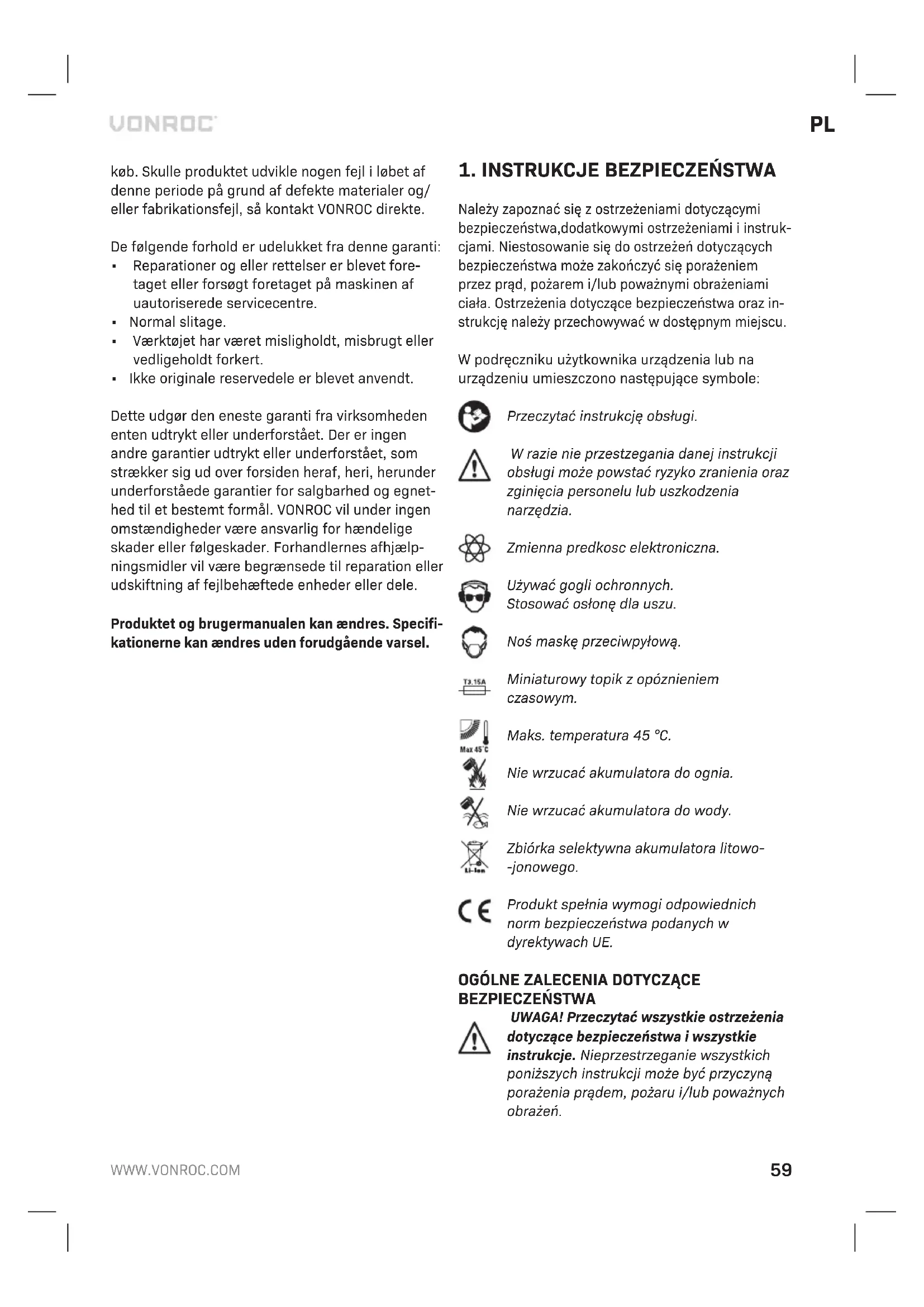 Przed rozpoczeciem czyszczenia i konser- wacji zawsze wylaczac maszyne i wyjmowac z niej akumulator. Czyścić obudowę narzędzia regularnie miękką ściereczką, najlepiej po każdym użyciu. Dopilnować, aby otwory wentylacyjne (3) były wolne od pyłu i zanieczyszczeń. Usuwać uporczywe zanieczyszc- zenia miękką ściereczką, lekko nawilżoną wodą z mydłem. Nie używać żadnych rozpuszczalników, jak benzyna, alkohol, amoniak itp., gdyż tego typu chemikalia powodują uszkodzenia części z tworzyw sztucznych. SRODOWISKO Uszkodzone i/lub niepotrzebne urzadzenia elektryczne lub elektroniczne podlegaja zbiórce w odpowiednich punktach recyklingu. Tylko kraje WE Nie wyrzucac elektronarzedzi wraz z odpadami z gospodarstw domowych. Zgodnie z dyrektywa 2012/19/WE dotyczaca zuzytych urzadzen elek- trycznych i elektronicznych oraz jej wdrozeniem do prawodawstwa krajowego, elektronarzedzia, które juz nie nadaja sie do uzytku, podlegaja oddziel- nej zbiórce oraz utylizacji w sposób przyjazny dla srodowiska. GWARANCJA Produkty VONROC są wytwarzane zgodnie z naj- wyższymi standardami jakości i producent udziela gwarancji na wady materiałowe i wady wykonania na okres wymagany prawem, licząc od dnia zaku- pu. Jeśli wystąpi usterka produktu w tym okresie spowodowana wadą materiałową i/lub wadą wykonania, proszę bezpośrednio skontaktować się ze sprzedawcą VONROC. Następujące okoliczności powodują unieważnienie gwarancji:
