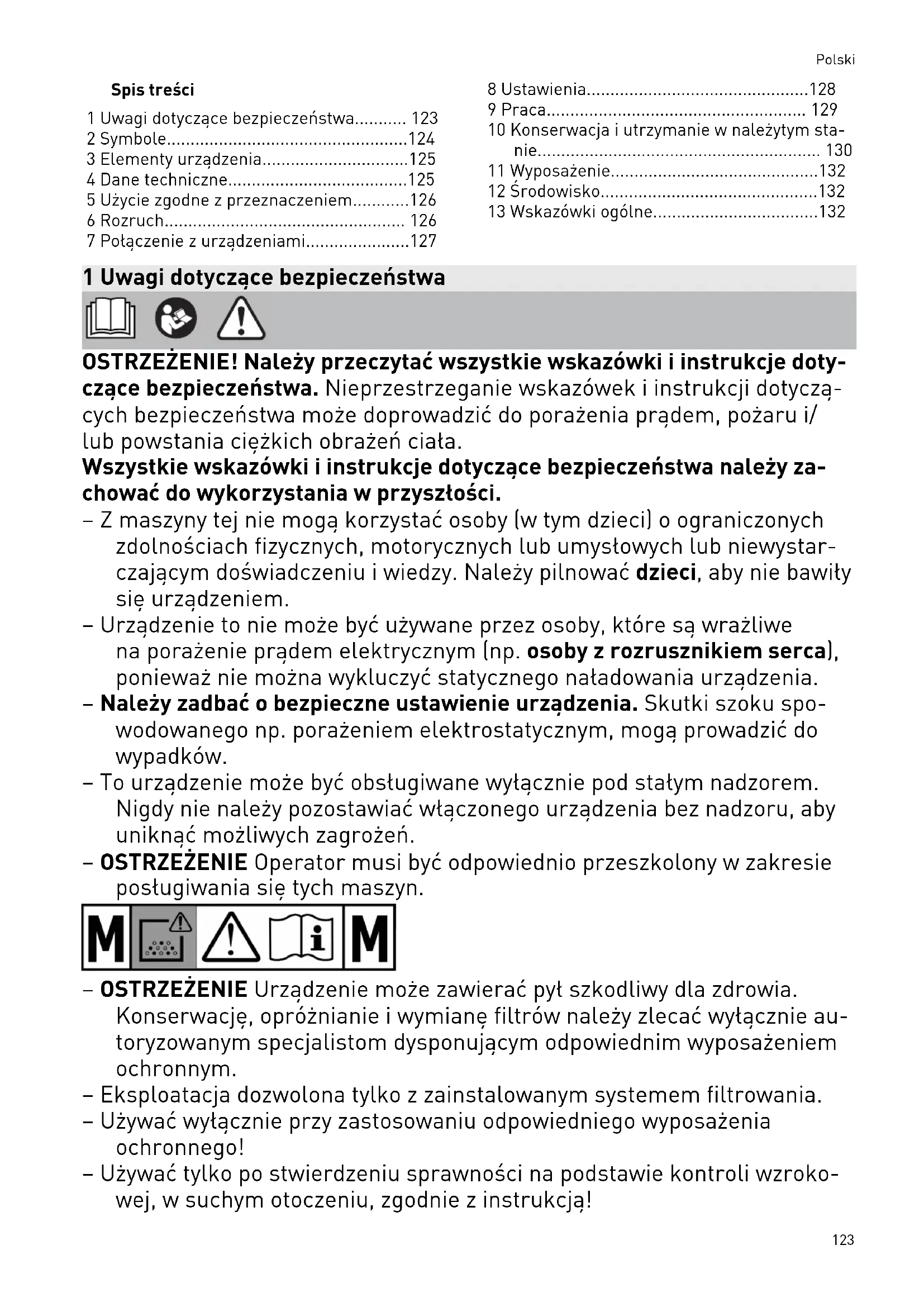 - 13 Wskazówki ogólne 1 Uwagi dotyczące bezpieczeństwa OSTRZEŻENIE! Należy przeczytać wszystkie wskazówki i instrukcje doty czące bezpieczeństwa. Nieprzestrzeganie wskazówek i instrukcji dotyczą cych bezpieczeństwa może doprowadzić do porażenia prądem, pożaru i/ lub powstania ciężkich obrażeń ciała. Wszystkie wskazówki i instrukcje dotyczące bezpieczeństwa należy za chować do wykorzystania w przyszłości. – Zmaszyny tej nie mogą korzystać osoby (wtym dzieci) oograniczonych zdolnościach fizycznych, motorycznych lub umysłowych lub niewystar czającym doświadczeniu iwiedzy. Należy pilnować dzieci, aby nie bawiły się urządzeniem. – Urządzenie to nie może być używane przez osoby, które są wrażliwe na porażenie prądem elektrycznym (np. osoby z rozrusznikiem serca), ponieważ nie można wykluczyć statycznego naładowania urządzenia. – Należy zadbać o bezpieczne ustawienie urządzenia. Skutki szoku spo wodowanego np. porażeniem elektrostatycznym, mogą prowadzić do wypadków. – To urządzenie może być obsługiwane wyłącznie pod stałym nadzorem. Nigdy nie należy pozostawiać włączonego urządzenia bez nadzoru, aby uniknąć możliwych zagrożeń. – OSTRZEŻENIE Operator musi być odpowiednio przeszkolony w zakresie posługiwania się tych maszyn. – OSTRZEŻENIE Urządzenie może zawierać pył szkodliwy dla zdrowia. Konserwację, opróżnianie i wymianę filtrów należy zlecać wyłącznie au toryzowanym specjalistom dysponującym odpowiednim wyposażeniem ochronnym. – Eksploatacja dozwolona tylko z zainstalowanym systemem filtrowania. – Używać wyłącznie przy zastosowaniu odpowiedniego wyposażenia ochronnego! – Używać tylko po stwierdzeniu sprawności na podstawie kontroli wzroko wej, w suchym otoczeniu, zgodnie z instrukcją! Polski 123– Niebezpieczeństwo wybuchu i pożaru! Nie wolno zasysać: – iskier, części żarzących się lub gorących pyłów; – substancji palnych lub wybuchowych (np. magnezu, aluminium, benzy ny, rozcieńczalników); – substancji o agresywnych właściwościach (np. kwasów, zasad, roz puszczalników); – wchodzących w reakcje chemiczne substancji, które prowadzą do wy dzielania ciepła, kwasów/zasad, gazów itp. (np. wchodzących w reak cje materiałów 2K, aluminium i wody). – Przestrzegać obowiązujących na terenie danego kraju przepisów bez pieczeństwa i stosować się do zaleceń producenta obrabianego mate riału! p. 132