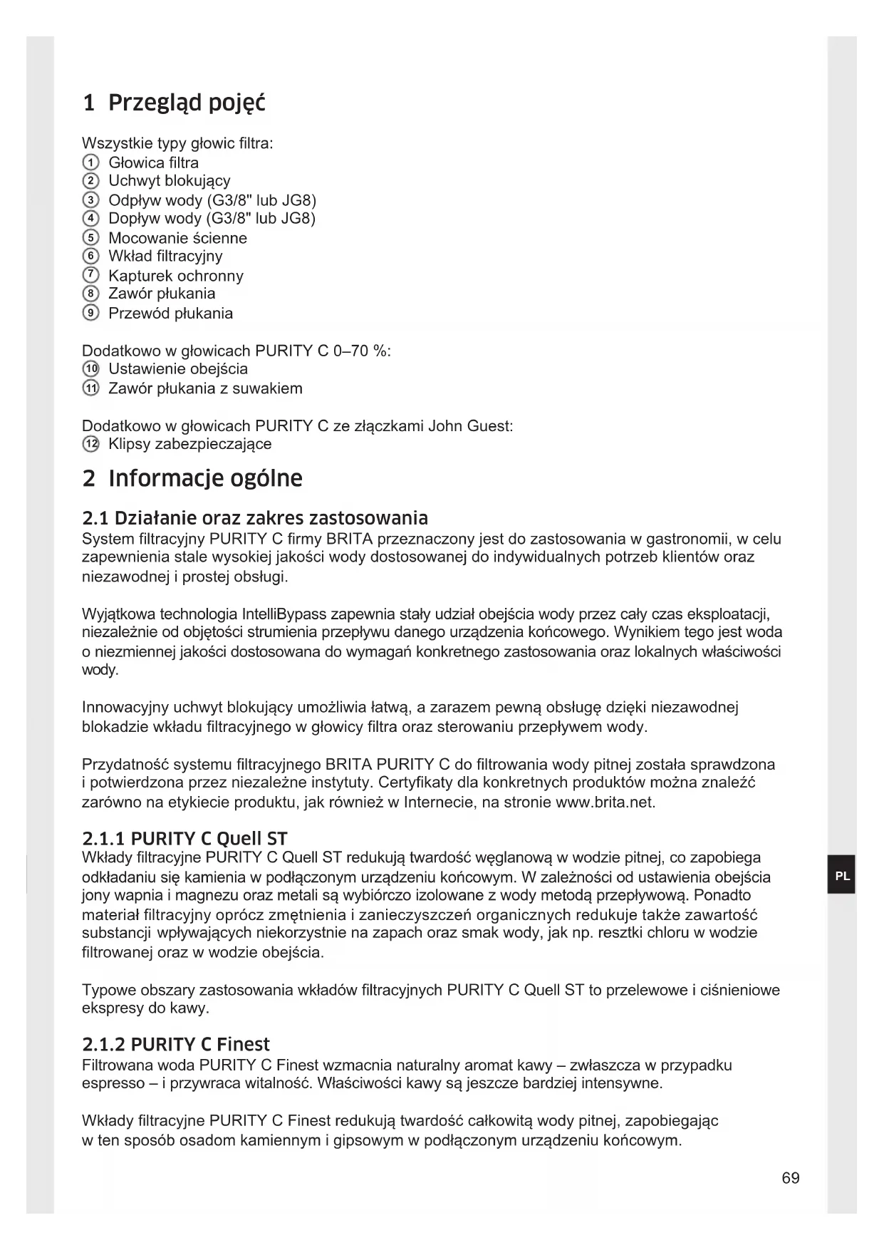 System ltracyjny PURITY C rmy BRITA przeznaczony jest do zastosowania w gastronomii, w celu zapewnienia stale wysokiej jakości wody dostosowanej do indywidualnych potrzeb klientów oraz niezawodnej i prostej obsługi. Wyjątkowa technologia IntelliBypass zapewnia stały udział obejścia wody przez cały czas eksploatacji, niezależnie od objętości strumienia przepływu danego urządzenia końcowego. Wynikiem tego jest woda o niezmiennej jakości dostosowana do wymagań konkretnego zastosowania oraz lokalnych właściwości wody. Innowacyjny uchwyt blokujący umożliwia łatwą, a zarazem pewną obsługę dzięki niezawodnej blokadzie wkładu ltracyjnego w głowicy ltra oraz sterowaniu przepływem wody. Przydatność systemu ltracyjnego BRITA PURITY C do ltrowania wody pitnej została sprawdzona i potwierdzona przez niezależne instytuty. Certykaty dla konkretnych produktów można znaleźć zarówno na etykiecie produktu, jak również w Internecie, na stronie www.brita.net.