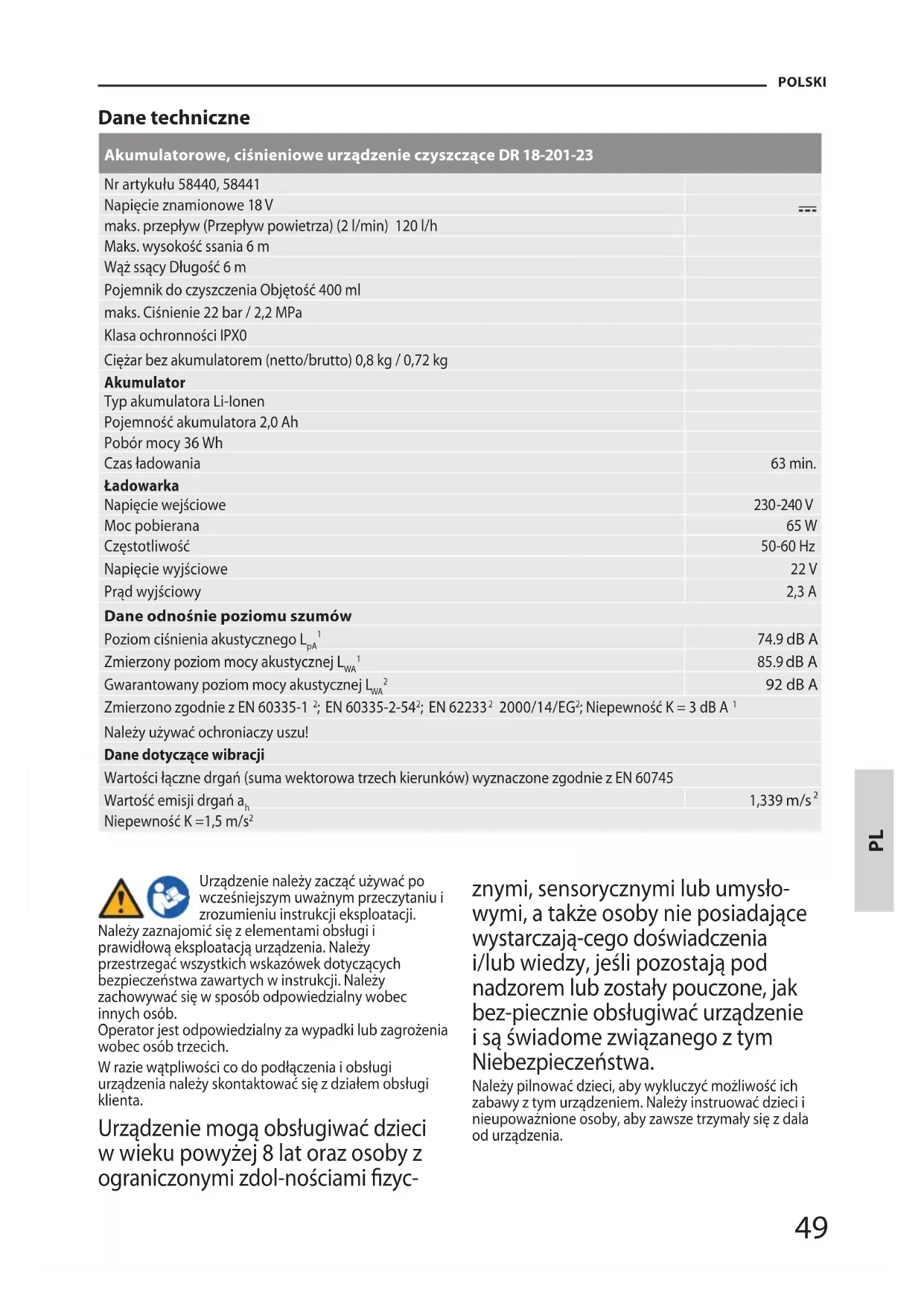 Urządzenie należy zacząć używać po wcześniejszym uważnym przeczytaniu i zrozumieniu instrukcji eksploatacji. Należy zaznajomić się z elementami obsługi i prawidłową eksploatacją urządzenia. Należy przestrzegać wszystkich wskazówek dotyczących bezpieczeństwa zawartych w instrukcji. Należy zachowywać się w sposób odpowiedzialny wobec innych osób. Operator jest odpowiedzialny za wypadki lub zagrożenia wobec osób trzecich. W razie wątpliwości co do podłączenia i obsługi urządzenia należy skontaktować się z działem obsługi klienta. Urządzenie mogą obsługiwać dzieci w wieku powyżej 8 lat oraz osoby z ograniczonymi zdol-nościami zyc- znymi, sensorycznymi lub umysło- wymi, a także osoby nie posiadające wystarczają-cego doświadczenia i/lub wiedzy, jeśli pozostają pod nadzorem lub zostały pouczone, jak bez-piecznie obsługiwać urządzenie i są świadome związanego z tym Niebezpieczeństwa. Należy pilnować dzieci, aby wykluczyć możliwość ich zabawy z tym urządzeniem. Należy instruować dzieci i nieupoważnione osoby, aby zawsze trzymały się z dala od urządzenia. PL50 POLSKI Warunki użytkowania Akumulatorowe, ciśnieniowe urządzenie czyszczące nadaje się do prac związanych z czyszczeniem i nawad- nianiem. Produkt można użytkować wyłącznie zgodnie z jego normalnym przeznaczeniem. Za szkody powstałe w wyniku nieprzestrzegania postanowień wynikających z ogólnie obowiązujących przepisów, a także postanowień wynikających z niniejszej instrukcji, producent nie odpowiada. Zagrożenia resztkowe Nawet przy prawidłowym stosowaniu i zachowaniu przepisów bezpieczeństwa może powstać ryzyko resztkowe. Pomimo przestrzegania instrukcji obsługi istnieje również nieprzewidywalne ryzyko resztkowe. Symbole Ostrzeżenie / Uwaga! Przeczytać instrukcję obsługi Przed rozpoczęciem prac związanych z regulacją, czyszczeniem i konserwacją mas- zyny należy wyjąć wymienny akumulator. Para, Mgła natryskowa Należy nosić odzież ochronną. Należy nosić okulary ochronne. Nosić rękawice ochronne. Zastosuj siłę Zabrania się przebywania w medium tłoczonym Chronić przed wilgocią. Chronić maszynę przed deszczem. Dzieci nie mogą zbliżać się do urządzenia. Chronić przed niską temperaturą Klasa ochronności III Znak zgodności CE Uszkodzony i/lub przeznaczony do usunięcia sprzęt elektryczny lub elektroniczny musi zostać przekazany w punktach zbiórki w celu recyklingu. Akumulator Przeczytać instrukcję obsługi Chronić akumulator przed temperaturami powyżej 40°C Chronić akumulator przed gorącem i ogniem. Chroń baterię przed wodą i wilgocią Li-Ion Nie wyrzucać akumulatorów z odpadami gospodarstwa domowego Baterie należy utylizować w punkcie zbiórki zużytych baterii, gdzie są one poddawa- ne recyklingowi w sposób przyjazny dla środowiska. Ładowarka Ostrzeżenie / Uwaga! Przeczytać instrukcję obsługi Ładowarki używać wyłącznie we wnętrzach Rozładowany akumulator Bateria naładowana Polaryzacja Klasa ochronności II Znak zgodności CE Uszkodzony i/lub przeznaczony do usunięcia sprzęt elektryczny lub elek- troniczny musi zostać przekazany w punktach zbiórki w celu recyklingu. Orientacja paczki u góry PL51 POLSKI Wskazówki bezpieczeństwa dla akumulatorowego, ciśnieniowego urządzenia czyszczącego Nie należy kierować urządzenia w kierunku własnym lub osób znajdujących się w pobliżu. Nosić okulary ochronne i odpowiednią odzież ochronną, aby chronić się przed rozbryzgami wody i zanieczyszczeń. Podczas pracy z urządzeniem osoby znajdujące się w jego zasięgu muszą nosić odzież ochronną. Podczas użytkowania urządzenia zwrócić uwagę na to, aby dzieci i inne osoby postronne znajdowały się w bezpiecznej odległości. Nie używać urządzenia w bliskiej stree od cieczy lub gazów palnych. W razie zwarcia powstaje zagrożenie pożarowe lub wybuchu. Nie rozpylać płynów łatwopalnych. Istnieje ryzyko wybuchu. Nie kierować strumienia urządzenia na sprzęt z elemen