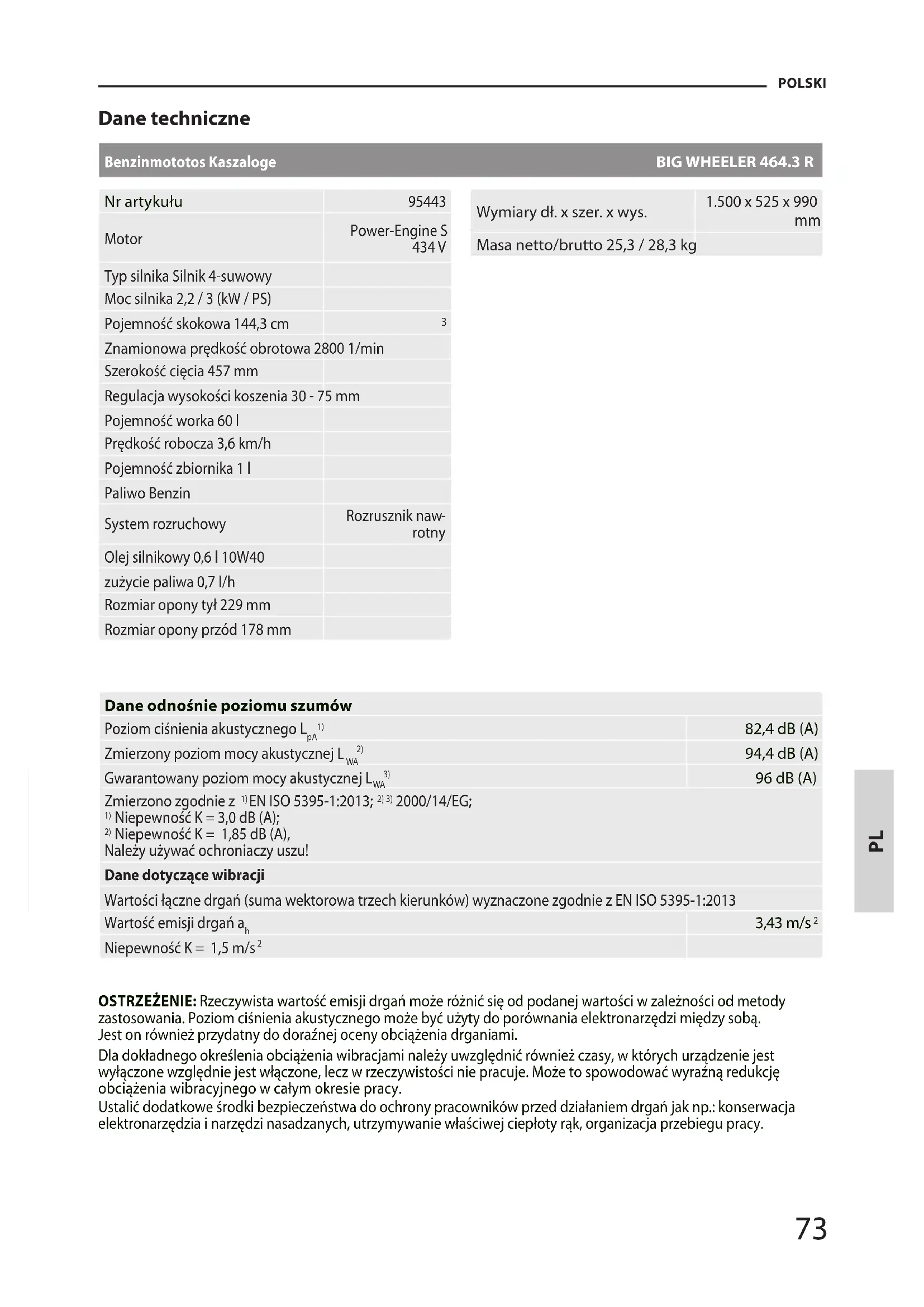 Niepewność K = 1,85 dB (A), Należy używać ochroniaczy uszu! Dane dotyczące wibracji Wartości łączne drgań (suma wektorowa trzech kierunków) wyznaczone zgodnie z EN ISO 5395-1:2013 Wartość emisji drgań a