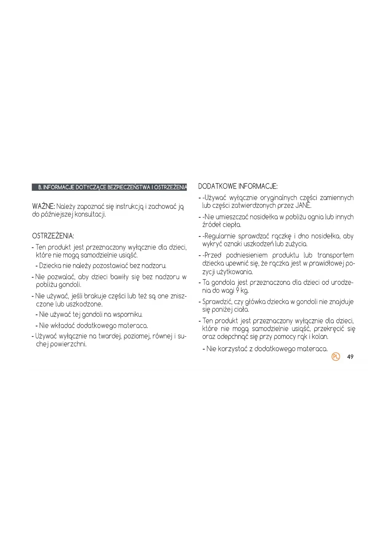 INFORMACJE DOTYCZĄCE BEZPIECZEŃSTWA I OSTRZEŻENIA WAŻNE: Należy zapoznać się instrukcją i zachować ją do późniejszej konsultacji. OSTRZEŻENIA: - Ten produkt jest przeznaczony wyłącznie dla dzieci, które nie mogą samodzielnie usiąść. - Dziecka nie należy pozostawiać bez nadzoru. - Nie pozwalać, aby dzieci bawiły się bez nadzoru w pobliżu gondoli. - Nie używać, jeśli brakuje części lub też są one znisz- czone lub uszkodzone. - Nie używać tej gondoli na wsporniku. - Nie wkładać dodatkowego materaca. - Używać wyłącznie na twardej, poziomej, równej i su- chej powierzchni. DODATKOWE INFORMACJE: - -Używać wyłącznie oryginalnych części zamiennych lub części zatwierdzonych przez JANÉ. - -Nie umieszczać nosidełka w pobliżu ognia lub innych źródeł ciepła. - -Regularnie sprawdzać rączkę i dno nosidełka, aby wykryć oznaki uszkodzeń lub zużycia. - -Przed podniesieniem produktu lub transportem dziecka upewnić się, że rączka jest w prawidłowej po- zycji użytkowania. - Ta gondola jest przeznaczona dla dzieci od urodze- nia do wagi 9 kg. - Sprawdzić, czy główka dziecka w gondoli nie znajduje się poniżej ciała. - Ten produkt jest przeznaczony wyłącznie dla dzieci, które nie mogą samodzielnie usiąść, przekręcić się oraz odepchnąć się przy pomocy rąk i kolan. - Nie korzystać z dodatkowego materaca.PL