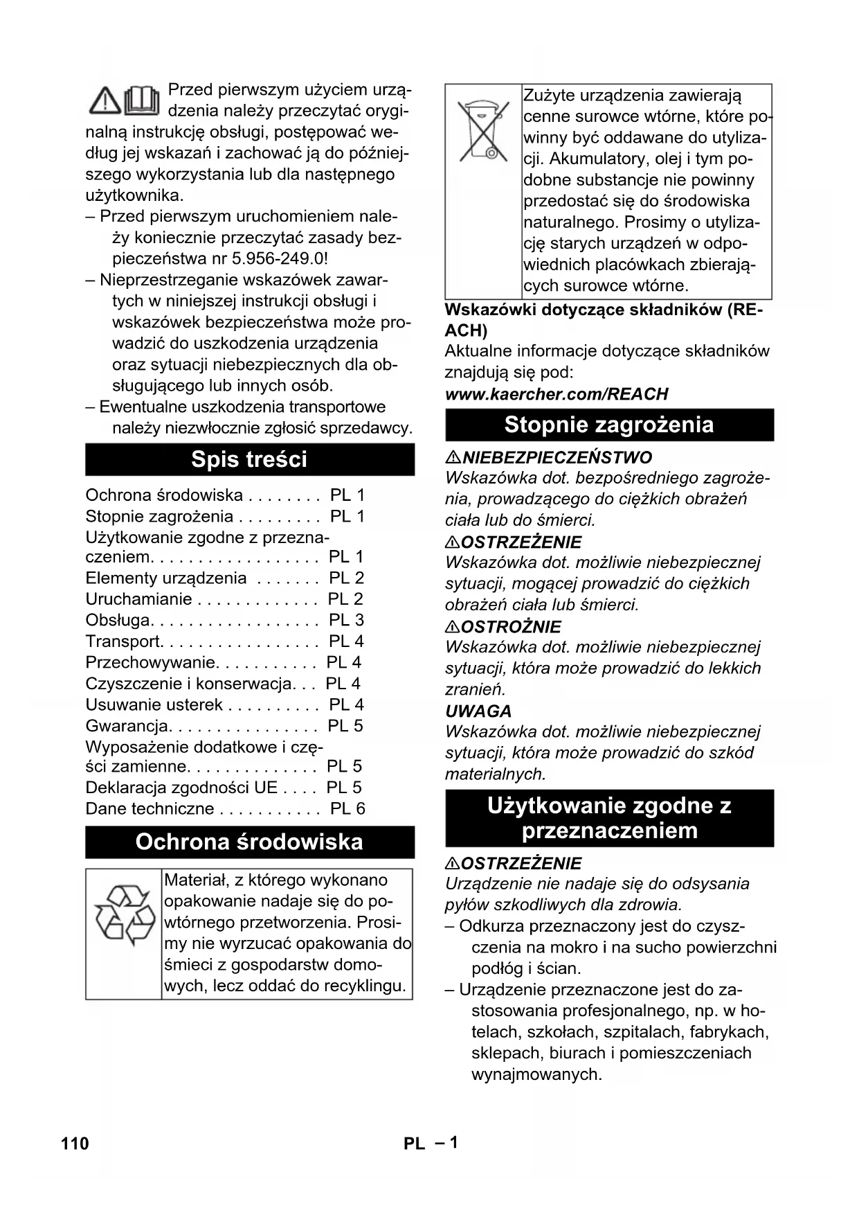 Št. delov Dolžina ka- bla EU 6.649-915.0 10 m GB 6.650-151.0 10 m CH 6.650-292.0 10 m AU 6.650-166.0 10 m 109SL– 1 Przed pierwszym użyciem urzą- dzenia należy przeczytać orygi- nalną instrukcję obsługi, postępować we- dług jej wskazań i zachować ją do później- szego wykorzystania lub dla następnego użytkownika. – Przed pierwszym uruchomieniem nale- ży koniecznie przeczytać zasady bez- pieczeństwa nr 5.956-249.0! – Nieprzestrzeganie wskazówek zawar- tych w niniejszej instrukcji obsługi i wskazówek bezpieczeństwa może pro- wadzić do uszkodzenia urządzenia oraz sytuacji niebezpiecznych dla ob- sługującego lub innych osób. – Ewentualne uszkodzenia transportowe należy niezwłocznie zgłosić sprzedawcy. Wskazówki dotyczące składników (RE- ACH) Aktualne informacje dotyczące składników znajdują się pod: www.kaercher.com/REACH NIEBEZPIECZEŃSTWO Wskazówka dot. bezpośredniego zagroże- nia, prowadzącego do ciężkich obrażeń ciała lub do śmierci. 몇 OSTRZEŻENIE Wskazówka dot. możliwie niebezpiecznej sytuacji, mogącej prowadzić do ciężkich obrażeń ciała lub śmierci. 몇 OSTROŻNIE Wskazówka dot. możliwie niebezpiecznej sytuacji, która może prowadzić do lekkich zranień. UWAGA Wskazówka dot. możliwie niebezpiecznej sytuacji, która może prowadzić do szkód materialnych. 몇 OSTRZEŻENIE Urz ądzenie nie nadaje się do odsysania pyłów szkodliwych dla zdrowia. – Odkurza przeznaczony jest do czysz- czenia na mokro i na sucho powierzchni podłóg i ścian. – Urządzenie przeznaczone jest do za- stosowania profesjonalnego, np. w ho- telach, szkołach, szpitalach, fabrykach, sklepach, biurach i pomieszczeniach wynajmowanych. Spis treści Ochrona środowiska . . . . . . . . PL 1 Stopnie zagrożenia . . . . . . . . . PL 1 Użytkowanie zgodne z przezna- czeniem. . . . . . . . . . . . . . . . . . PL 1 Elementy urządzenia . . . . . . . PL 2 Uruchamianie . . . . . . . . . . . . . PL 2 Obsługa. . . . . . . . . . . . . . . . . . PL 3 Transport. . . . . . . . . . . . . . . . . PL 4 Przechowywanie. . . . . . . . . . . PL 4 Czyszczenie i konserwacja. . . PL 4 Usuwanie usterek . . . . . . . . . . PL 4 Gwarancja. . . . . . . . . . . . . . . . PL 5 Wyposażenie dodatkowe i czę- ści zamienne. . . . . . . . . . . . . . PL 5 Deklaracja zgodności UE . . . . PL 5 Dane techniczne . . . . . . . . . . . PL 6 Ochrona środowiska Materiał, z którego wykonano opakowanie nadaje się do po- wtórnego przetworzenia. Prosi- my nie wyrzucać opakowania do śmieci z gospodarstw domo- wych, lecz oddać do recyklingu. Zużyte urządzenia zawierają cenne surowce wtórne, które po- winny być oddawane do utyliza- cji. Akumulatory, olej i tym po- dobne substancje nie powinny przedostać się do środowiska naturalnego. Prosimy o utyliza- cję starych urządzeń w odpo- wiednich placówkach zbierają- cych surowce wtórne. Stopnie zagrożenia Użytkowanie zgodne z przeznaczeniem 110 PL– 2 1 Elektrody 2 Wąż ssący 3 Pałąk przesuwny, regulowany 4 Ryglowanie głowicy ssącej 5 Zbiornik na zanieczyszczenia 6 Głowica ssąca 7 Kółko skrętne 8 Podwozie 9 Króciec ssący 10 Uchwyt podwozia 11 Ssawka podłogowa 12 Rura ssąca 13 Uchwyt do noszenia 14 Hak na węża i na kabel 15 Pokrywa filtra 16 Krzywak 17 Pokrętło 18 Schowek na dyszę podłogową 19 Wywrotka 20 Tabliczka identyfikacyjna 21 Wąż spustowy 22 Uchwyt na rury ssące 23 Kabel sieciowy 24 Śruba mocująca pałąka przesuwnego 25 Płaski filtr falisty 26 Czyszczenie filtra – Elementy obsługi procesu czyszczenia są żółte. – Elementy obsługi konserwacji i serwisu są jasnoszare. UWAGA Podczas odkurzania nigdy nie wyjmować płaskiego filtra falistego. – Przy odsysaniu drobnego kurzu można dodatkowo używać papierowego wkła- du filtra, worka włókninowego (wyposa- żenie specjalne) lub filtra membrano- wego (wyposażenie specjalne). Rysunek Odblokować i zdjąć głowicę ssącą. Nałożyć papierowy wkład filtra, worek włókninowy (wyposażenie specjalne) lub filtr membranowy (wyposażenie specjalne). Nałożyć i zablokować głowicę ssącą. UWAGA W przypadku przejścia od odkurzania na mokro do odkurzania na sucho: Odkurzanie suchego pyłu, gdy filtr jest mo- kry, może spowodować jego zapchanie i uszkodzenie. Mokry filtr należy przed użyciem dobrze wysuszyć lub wymienić na suchy. W razie potrzeby wymienić filtr, patrz punkt „Czyszczenie i konserwacja”. Wskazówka: W przypadku ciągłego stoso- wania odkurzania na mokro, zaleca się używanie płaskiego filtra falistego PES (patrz systemy filtracyjne). Rysunek Wymontować listwę szczotkową. Zamontować ściągacz. Wskazówka: Karbowana strona ściągacza powinna być skierowana na zewnątrz. – Przy odkurzaniu mokrych zabrudzeń należy zawsze wyjąć papierowy wkład filtra, worek włókninowy (wyposażenie specjalne) wzgl. filtr membranowy (wy- posażenie specjalne). – Zalecane jest stosowanie specjalnego wkładu filtracyjnego (na mokro) (patrz systemy filtracyjne). Elementy urządzenia Kolor oznaczenia Uruchamianie Odkurzanie na sucho Zakładanie papierowego wkładu filtra/ worka włókninowego Przejście z odkurzania na mokro do odkurzania sucho Odkurzanie na mokro Zakładanie listew gumowych Wymiana worka papierowego/worka włókninowego 111PL– 3 몇 OSTROŻNIE Przestrzegać miejscowych przepisów doty- czących postępowania ze ściekami. Urządzenie ze zbiornikiem metalowym: Rysunek Urządzenie ze zbiornikiem z tworzywa sztucznego: Rysunek Usunąć brudną wodę za pomocą węża spustowego. – Podczas zasysania mokrych zanie- czyszczeń dyszą do tapicerki lub do szczelin, ewentualnie gdy do zbiornika zasysana jest przede wszystkim woda, zalecane jest wyłączenie funkcji "Auto- matyczne oczyszczanie filtra". – Po osiągnięciu maksymalnego pozio- mu cieczy urządzenie wyłącza się sa- moczynnie. – W przypadku cieczy nieprzewodzą- cych (np. emulsji wiertniczej, olejów i smarów) po