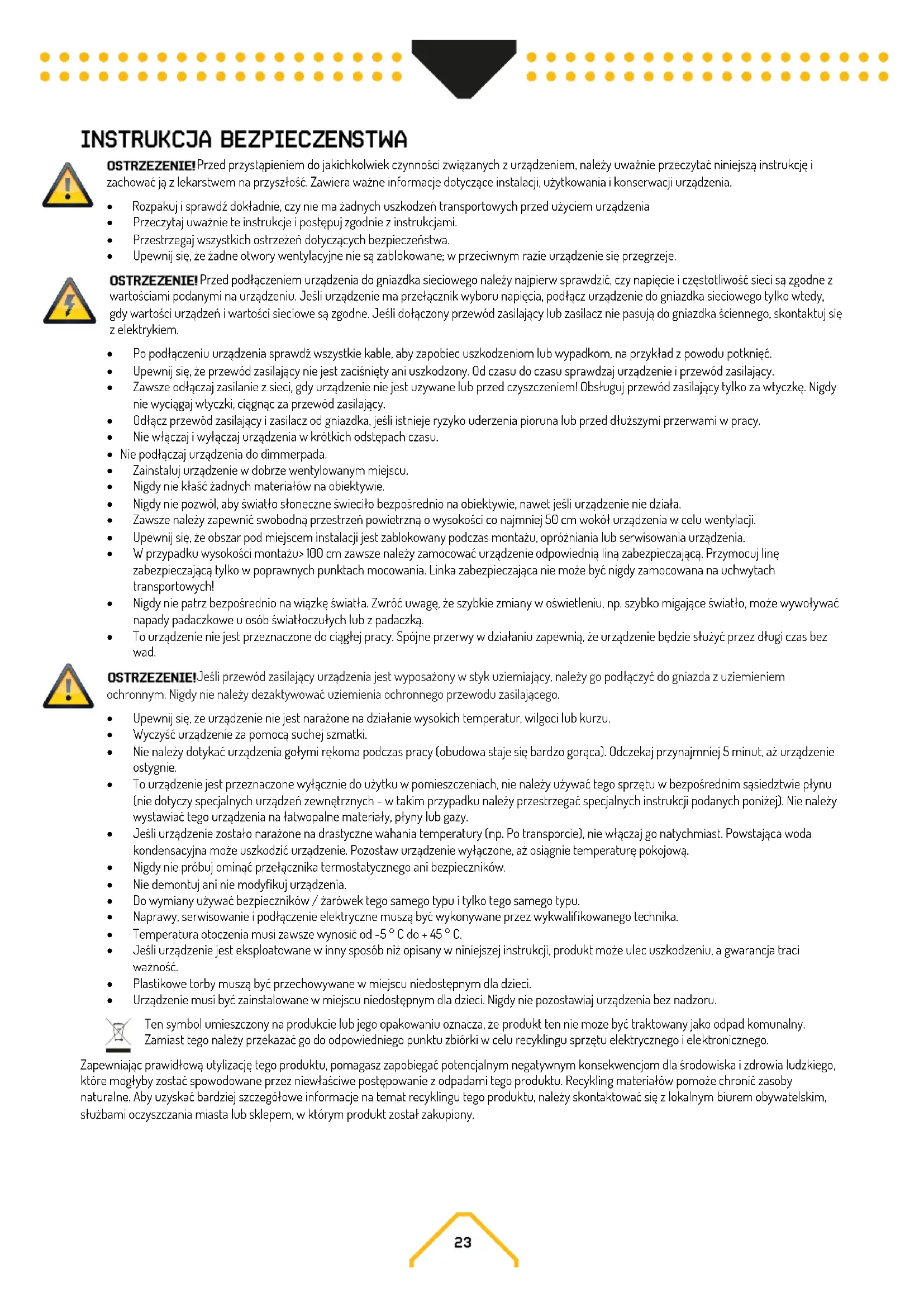 - Urządzenie musi być zainstalowane w miejscu niedostępnym dla dzieci. Nigdy nie pozostawiaj urządzenia bez nadzoru. Ten symbol umieszczony na produkcie lub jego opakowaniu oznacza, że produkt ten nie może być traktowany jako odpad komunalny. Zamiast tego należy przekazać go do odpowiedniego punktu zbiórki w celu recyklingu sprzętu elektrycznego i elektronicznego. Zapewniając prawidłową utylizację tego produktu, pomagasz zapobiegać potencjalnym negatywnym konsekwencjom dla środowiska i zdrowia ludzkiego, które mogłyby zostać spowodowane przez niewłaściwe postępowanie z odpadami tego produktu. Recykling materiałów pomoże chronić zasoby naturalne. Aby uzyskać bardziej szczegółowe informacje na temat recyklingu tego produktu, należy skontaktować się z lokalnym biurem obywatelskim, służbami oczyszczania miasta lub sklepem, w którym produkt został zakupiony.Natychmiast po otrzymaniu produktu ostrożnie rozpakuj karton, sprawdź zawartość, aby upewnić się, że wszystkie części są obecne i zostały odebrane w dobrym stanie. Natychmiast powiadomić dostawcę i zachować materiał do pakowania w celu sprawdzenia, czy jakakolwiek część wygląda na uszkodzoną przez przesyłkę lub samo opakowanie wykazuje oznaki niewłaściwego postępowania. Zapisz pakiet i wszystkie materiały do pakowania. W przypadku, gdy produkt musi zostać zwrócony do fabryki, ważne jest, aby produkt został zwrócony w oryginalnym opakowaniu fabrycznym i opakowaniu. Jeśli urządzenie zostało wystawione na drastyczne wahania temperatury (np. Po transporcie), nie włączaj go natychmiast. Powstająca woda kondensacyjna może uszkodzić twoje urządzenie. Pozostaw urządzenie wyłączone, aż osiągnie temperaturę pokojową. Na etykiecie z tyłu produktu jest wskazany jakiego typu zasilacz musi być podłączony. Sprawdź, czy napięcie w sieci jest właściwe do użytego zasilacza. Każde inne napięcie niż podane, może sprawić nieodwracalne uszkodzenie oświetlenia. Produkt musi być również bezpośrednio podłączony do sieci zasilającej i wtedy dopiero może być używany. Brak ściemniacza lub regulowany zasilacz. Zawsze podłączaj urządzenie do zabezpieczonego obwodu (wyłącznik lub bezpiecznik). Upewnij się, że urządzenie ma odpowiednie uziemienie elektryczne, aby uniknąć ryzyka porażenia prądem lub pożaru. Oprawa powinna być ustawiona na stabilnej i równej powierzchni. Za pomocą elementów mocujących płyty podstawowej, urządzenie można również zamontować do góry nogami do kratownicy, patrz poniższy rysunek. Do zamocowania wymagane są certyfikowane zaciski o prawidłowym obciążeniu roboczym. Miejsce montażu musi mieć wystarczającą stabilność i być w stanie utrzymać ciężar 10-krotności wagi urządzenia. Zabezpiecz urządzenie za pomocą linki zabezpieczającej, aby nie spadło. Podczas wykonywania jakiejkolwiek instalacji należy zawsze przestrzegać europejskich i krajowych wytycznych dotyczących olinowania, wiązarów i wszystkich innych kwestii związanych z bezpieczeństwem. Zawsze pozwól, aby instalacja została sprawdzona przez autoryzowanego dealera!Możesz sterować tym urządzeniem bez użycia kontrolera, ponieważ funkcja ta zapewnia tryb automatyczny i aktywowany dźwiękiem. : Oprzyrządowanie pokazuje program wstępnie ustawiony. : Urządzenie reaguje na rytm muzyki. Włącz muzykę i wyreguluj pokrętło czułości mikrofonu, aż produkt będzie reagował na rytm muzyki. Nagromadzenie kurzu, brudu i innych cząstek unoszących się w powietrzu zmniejszy moc świetlną urządzenia. Uniemożliwi to również prawidłowe chłodzenie urządzenia, co skróci żywotność urządzenia. Szybkość gromadzenia się zanieczyszczeń będzie się różnić w zależności od czynników środowiskowych, takich jak pył unoszący się w powietrzu, użycie maszyn do dymu, przepływ powietrza z systemów wentylacyjnych itp. Wentylatory chłodzące urządzenia przyspieszą gromadzenie się, a wszelkie cząstki dymu obecne w atmosferze zwiększą tendencję aby brud się zatkał. Aby uzyskać najlepszą wydajność i żywotność urządzenia, należy go regularnie sprawdzać i czyścić, gdy tylko pojawią się oznaki gromadzenia się brudu. Oceniaj środowisko operacyjne za każdym razem, gdy zaczniesz korzystać z urządzenia. W warunkach dużego zapylenia lub zadymienia, sprawdzaj urządzenie po kilku godzinach i sprawdzaj często, czy urządzenie może przyciągnąć brud szybciej, niż się spodziewasz. Sporządź harmonogram czyszczenia, który zapewni, że brud zostanie usunięty, zanim zacznie się gromadzić. Skorzystaj z następujących wskazówek: