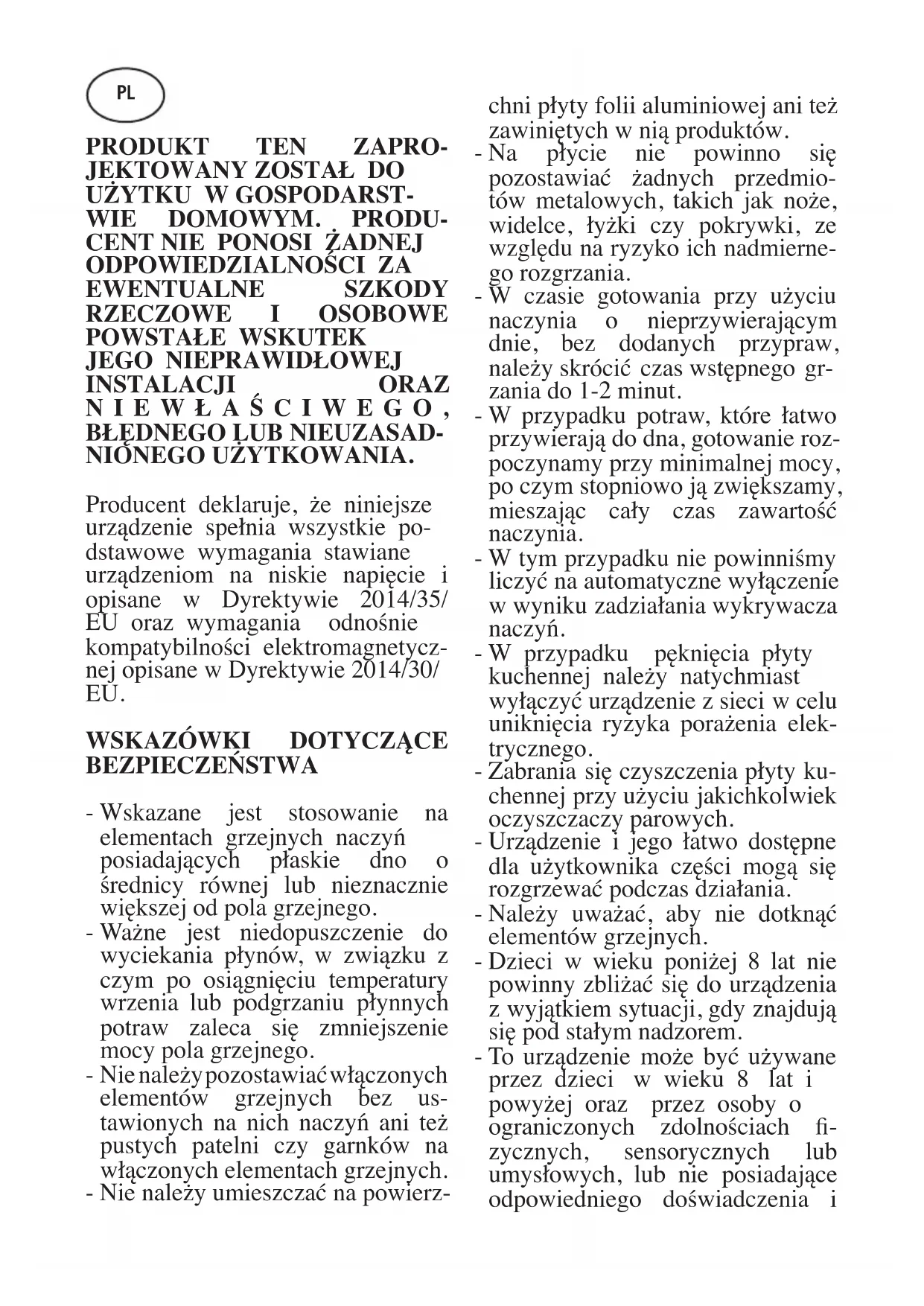 BEZPIECZEŃSTWA - Wskazane jest stosowanie na elementach grzejnych naczyń posiadających płaskie dno o średnicy równej lub nieznacznie większej od pola grzejnego. - Ważne jest niedopuszczenie do wyciekania płynów, w związku z czym po osiągnięciu temperatury wrzenia lub podgrzaniu płynnych potraw zaleca się zmniejszenie mocy pola grzejnego. - Nie należy pozostawiać włączonych elementów grzejnych bez us- tawionych na nich naczyń ani też pustych patelni czy garnków na włączonych elementach grzejnych. - Nie należy umieszczać na powierz- chni płyty folii aluminiowej ani też zawiniętych w nią produktów. - Na płycie nie powinno się pozostawiać żadnych przedmio- tów metalowych, takich jak noże, widelce, łyżki czy pokrywki, ze względu na ryzyko ich nadmierne- go rozgrzania. - W czasie gotowania przy użyciu naczynia o nieprzywierającym dnie, bez dodanych przypraw, należy skrócić czas wstępnego gr- zania do 1-2 minut. - W przypadku potraw, które łatwo przywierają do dna, gotowanie roz- poczynamy przy minimalnej mocy, po czym stopniowo ją zwiększamy, mieszając cały czas zawartość naczynia. - W tym przypadku nie powinniśmy liczyć na automatyczne wyłączenie w wyniku zadziałania wykrywacza naczyń. - W przypadku pęknięcia płyty kuchennej należy natychmiast wyłączyć urządzenie z sieci w celu uniknięcia ryzyka porażenia elek- trycznego. - Zabrania się czyszczenia płyty ku- chennej przy użyciu jakichkolwiek oczyszczaczy parowych. - Urządzenie i jego łatwo dostępne dla użytkownika części mogą się rozgrzewać podczas działania. - Należy uważać, aby nie dotknąć elementów grzejnych. - Dzieci w wieku poniżej 8 lat nie powinny zbliżać się do urządzenia z wyjątkiem sytuacji, gdy znajdują się pod stałym nadzorem. - To urządzenie może być używane przez dzieci w wieku 8 lat i powyżej oraz przez osoby o ograniczonych zdolnościach - zycznych, sensorycznych lub umysłowych, lub nie posiadające odpowiedniego doświadczenia i PLwiedzy pod warunkiem, że odb- ywa się to pod nadzorem lub że osoby te zostały odpowiednio przeszkolone w zakresie bezpie- cznego użytkowania urządzenia i rozumieją związane z tym ryzyko. Nie należy pozwalać dzieciom na zabawę urządzeniem. Czyszczenie i konserwacja wykonywane przez użytkownika nie powinny być zle- cane dzieciom, jeśli nie zapewni się odpowiedniego nadzoru. - Gotowanie z użyciem tłuszczów lub oleju może być niebezpieczne, gdy jest wykonywane bez nadzo- ru, gdyż może dojść do zapłonu. NIGDY nie należy próbować gasić ognia za pomocą wody. Należy wyłączyć urządzenie i nakryć płomienie, na przykład, pokrywką lub kocem gaśniczym. - Proces gotowania musi być nadzo- rowany. Krótki proces gotowania musi być nadzorowany nieustan- nie. - Gotowanie bez nadzoru na płycie grzejnej na tłuszczu lub oleju może być niebezpieczne oraz może spowodować pożar. - Ryzyko zapłonu: nie gromadzić przedmiotów na powierzchni służącej do gotowania. - Używać wyłącznie elementów zabezpieczających kuchenkę za- projektowanych przez produ- centa kuchenki lub wskazanych przez producenta jako odpowied- nie w instrukcji, lub elementów zabezpieczających kuchenkę wbudowanych w urządzenie. Użycie nieodpowiednich ele- mentów zabezpieczających może spowodować wypadek. Wprowadź do elektrycznej ins- talacji stałej medium odłączające urządzenie od sieci elektrycznej, posiadające oddzielenie styków na wszystkich biegunach, któ- re umożliwia pełne odłączenie w przypadku przepięcia kategorii III, zgodnie z zasadami prowadzenia przewodów instalacji elektrycznej. Nale y zapewni łatwy dost p do wtyczki lub przeł cznika wielobie- gunowego po zamontowaniu urz dzenia. Urządzenie nie ejst przystosowa- ne do użytku przez zewnętrzny wyłącznik czasowy lub system zdal- nego sterowania. Producent zrzeka si wszelkiej od