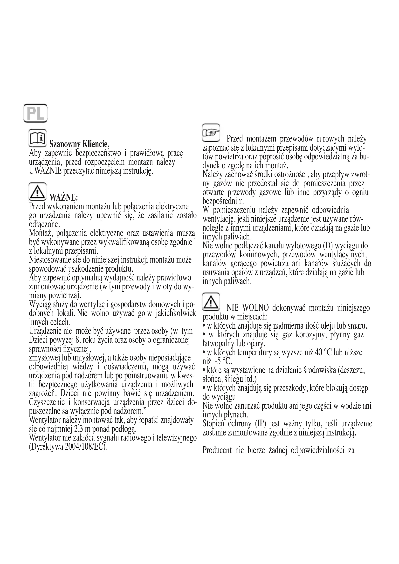 - w których znajdują się przeszkody, które blokują dostęp do wyciągu. Nie wolno zanurzać produktu ani jego części w wodzie ani innych płynach. Stopień ochrony (IP) jest ważny tylko, jeśli urządzenie zostanie zamontowane zgodnie z niniejszą instrukcją. Producent nie bierze żadnej odpowiedzialności za Szanowny Kliencie, Aby zapewnić bezpieczeństwo i prawidłową pracę urządzenia, przed rozpoczęciem montażu należy UWAŻNIE przeczytać niniejszą instrukcję. WAŻNE: Przed wykonaniem montażu lub połączenia elektryczne- go urządzenia należy upewnić się, że zasilanie zostało odłączone. Montaż, połączenia elektryczne oraz ustawienia muszą być wykonywane przez wykwalikowaną osobę zgodnie z lokalnymi przepisami. Niestosowanie się do niniejszej instrukcji montażu może spowodować uszkodzenie produktu. Aby zapewnić optymalną wydajność należy prawidłowo zamontować urządzenie (w tym przewody i wloty do wy- miany powietrza). Wyciąg służy do wentylacji gospodarstw domowych i po- dobnych lokali. Nie wolno używać go w jakichkolwiek innych celach. Urządzenie nie może być używane przez osoby (w tym Dzieci powyżej 8. roku życia oraz osoby o ograniczonej sprawności zycznej, zmysłowej lub umysłowej, a także osoby nieposiadające odpowiedniej wiedzy i doświadczenia, mogą używać urządzenia pod nadzorem lub po poinstruowaniu w kwes- tii bezpiecznego użytkowania urządzenia i możliwych zagrożeń. Dzieci nie powinny bawić się urządzeniem. Czyszczenie i konserwacja urządzenia przez dzieci do- puszczalne są wyłącznie pod nadzorem.” Wentylator należy montować tak, aby łopatki znajdowały się co najmniej 2,3 m ponad podłogą. Wentylator nie zakłóca sygnału radiowego i telewizyjnego (Dyrektywa 2004/108/EC). PLobrażenia odniesione przez ludzi i zwierzęta ani za uszkodzenie przedmiotów spowodowane niewłaściwym użytkowaniem urządzenia oraz niestosowaniem się do ostrzeżeń dotyczących montażu, użytkowania oraz kon- serwacji, które zostały opisane w niniejszej instrukcji obsługi. Po zakończeniu montażu należy przekazać niniejszą instrukcję właścicielowi/użytkownikowi urządzenia. Urządzenie należy zamontować tak, aby możliwe było odłączenie go od sieci elektrycznej. W tym celu należy umożliwić dostęp do wtyczki sieciowej lub zamontować w instalacji stałej wyłącznik zgodny z lokalnymi normami dotyczącymi instalacji elektrycznych. MONTAŻ: Przed rozpoczęciem montażu należy sprawdzić, czy wirnik wentylatora nie jest uszkodzony lub odkształcony, czy swobodnie się obraca, oraz czy w obudowie zewnętrznej nie znajdują się ciała obce. Podczas montażu należy stosować się do dołączonej dokumentacji gracznej. Urządzenie można zamontować na ścianie lub sucie, z bezpośrednim wylotem wentylacyjnym do oddzielnego przewo- du wentylacyjnego (patrz rys. 1A) W celu zamontowania, wykonać okrągły otwór o średnicy odpowiadającej instalowanemu modelowi (100mm; 120mm lub 150mm) w ścianie lub w dachu, gdzie będzie montowane urządzenie, a także wykonać otwory służące do jego zamocowania (patrz rys. 2). Należy zdjąć pokrywę zgodnie z rys. 1B Przeprowadzić kable zasilające przez część “PC” oraz kanał w urządzeniu (patrz rys. 3A). Należy podłączyć urządzenie zgodnie z opisem w części “POŁĄCZENIE ELEKTRYCZNE” W przypadku wykonywania montażu przy użyciu oddzielnego przewodu wylotowego, przewód o średnicy należy umieścić w otworze przygotowanym dla wyciągu powietrza. Niezależnie od tego, czy montaż jest wykonywany przy użyciu oddzielnego przewodu wylotowego, czy przy użyciu wylotu bezpośredniego, należy zamontować kratę wylotu powietrza, która spełnia krajowe wymogi bezpieczeństwa dotyczące zapobiegania dostępowi do łopatek wyciągu (patrz rys. 1A) Należy upewnić się, że żadne przeszkody nie blokują przepływu powietrza. Do przymocowania podstawy obudowy należy użyć kołków i śrub dostarczonych przez producenta. POŁĄCZENIE ELEKTRYCZNE: Należy upewnić się, że wartości napięcia (V) oraz częstotliwości (Hz) zasilania odpowiadają wartościom wskazanym na tabliczce znamionowej urządzenia. Urządzenie należy podłączyć na stałe do instalacji elektrycznej, umieszczanej w ścianie i podłączanej z tyłu urządzenia. (Przewód sztywny lub z końcówką sztywną, 2 lub 3 kierowców minimalny przekrój 1 mm