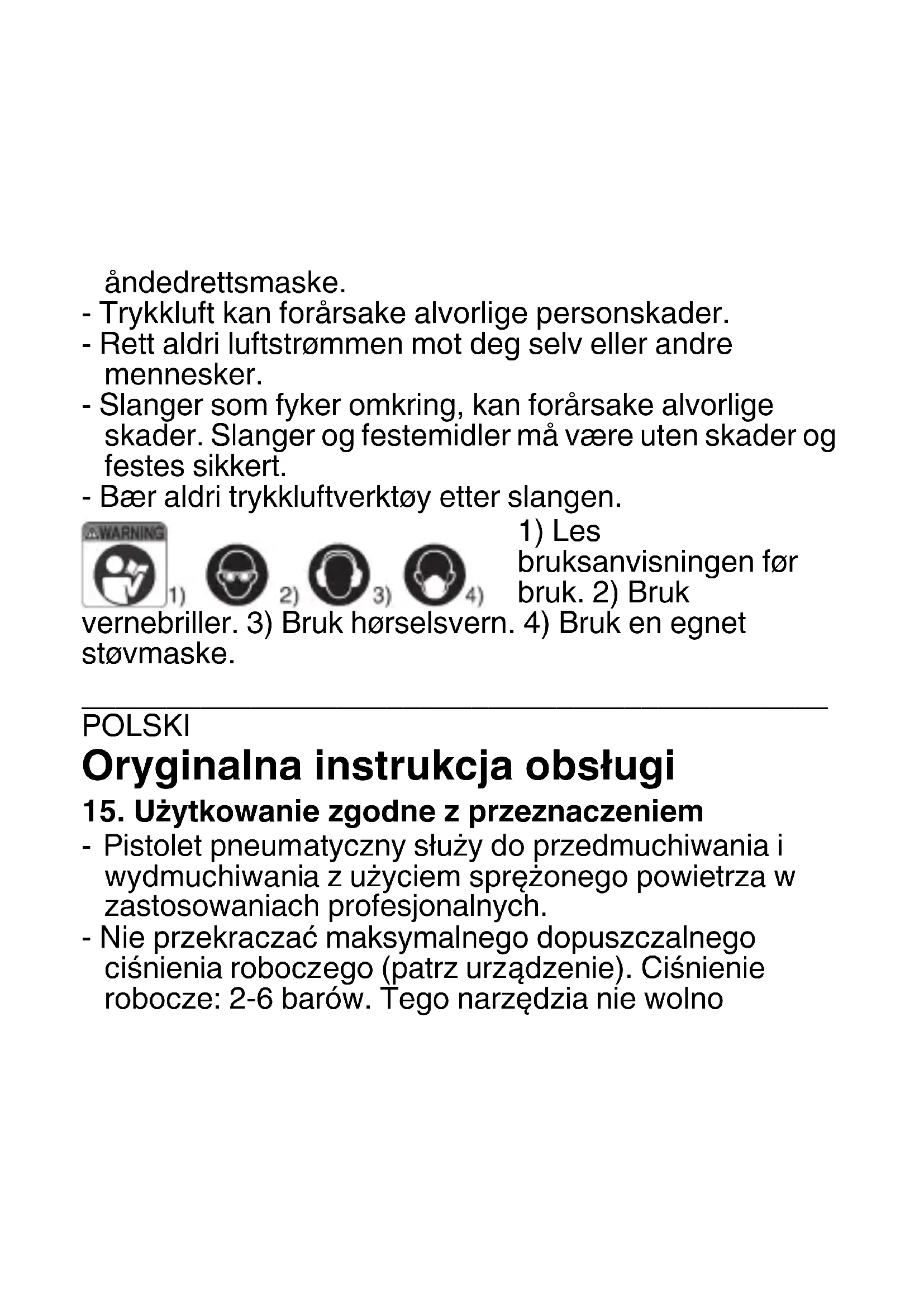 UWAGA Przed uruchomieniem przeczytać i zrozumieć wszystkie instrukcje oraz wskazówki bezpieczeństwa i przestrzegać ich. Podczas pracy dokumenty przechowywać w łatwo dostępnym miejscu. -Urządzenie mogą obsługiwać wyłącznie wykwalifikowani i przeszkoleni operatorzy. -Nie wprowadzać zmian w konstrukcji urządzenia pneumatycznego. Nie przekraczać maksymalnego dopuszczalnego ciśnienia roboczego (patrz urządzenie). Ciśnienie robocze: 2-6 barów. Przechowywać w miejscu niedostępnym dla dzieci.-Urządzenie regularnie poddawać konserwacji i kontroli. Zlecać naprawę albo wymianę uszkodzonych lub niesprawnych części. -Upewnić się, że detal jest bezpiecznie zamontowany i że żadne elementy nie zostaną zdmuchnięte przez strumień powietrza. -Upewnić się, czy w stosunku do innych osób również nie występuje zagrożenie. -Stosować środki ochrony osobistej i zawsze używać okularów ochronnych, środków ochrony dróg oddechowych i ochronników słuchu. -Zagrożenia przez pyły i opary: Podczas pracy z materiałami potencjalnie niebezpiecznymi dla zdrowia nosić odzież ochronną i stosować ochronę dróg oddechowych. -Sprężone powietrze może powodować poważne obrażenia. - Nigdy nie wolno kierować strumienia powietrza na siebie ani inne osoby. -Poruszające się węże pneumatyczne mogą powodować poważne obrażenia. Węże pneumatyczne i elementy mocujące nie mogą być uszkodzone i muszą być pewnie zamocowane. -Nigdy nie przenosić narzędzia pneumatycznegotrzymając za wąż pneumatyczny.