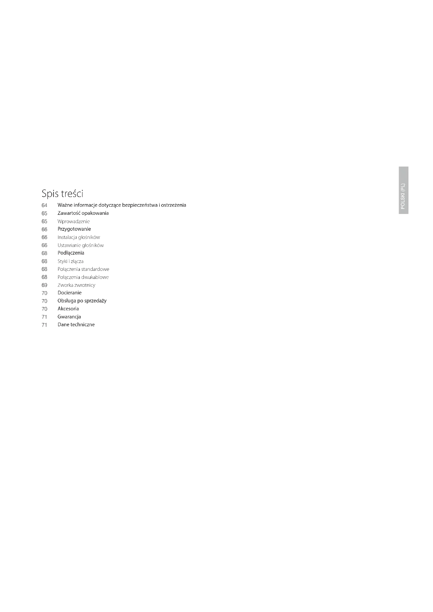 POLSKI (PL) Ważne informacje dotyczące bezpieczeństwa i ostrzeżenia Zawartość opakowania Wprowadzenie Przygotowanie Instalacja głośników Ustawianie głośników Podłączenia Styki i złącza Połączenia standardowe Połączenia dwukablowe Zworka zwrotnicy Docieranie Obsługa po sprzedaży Akcesoria Gwarancja Dane techniczne Spis treści