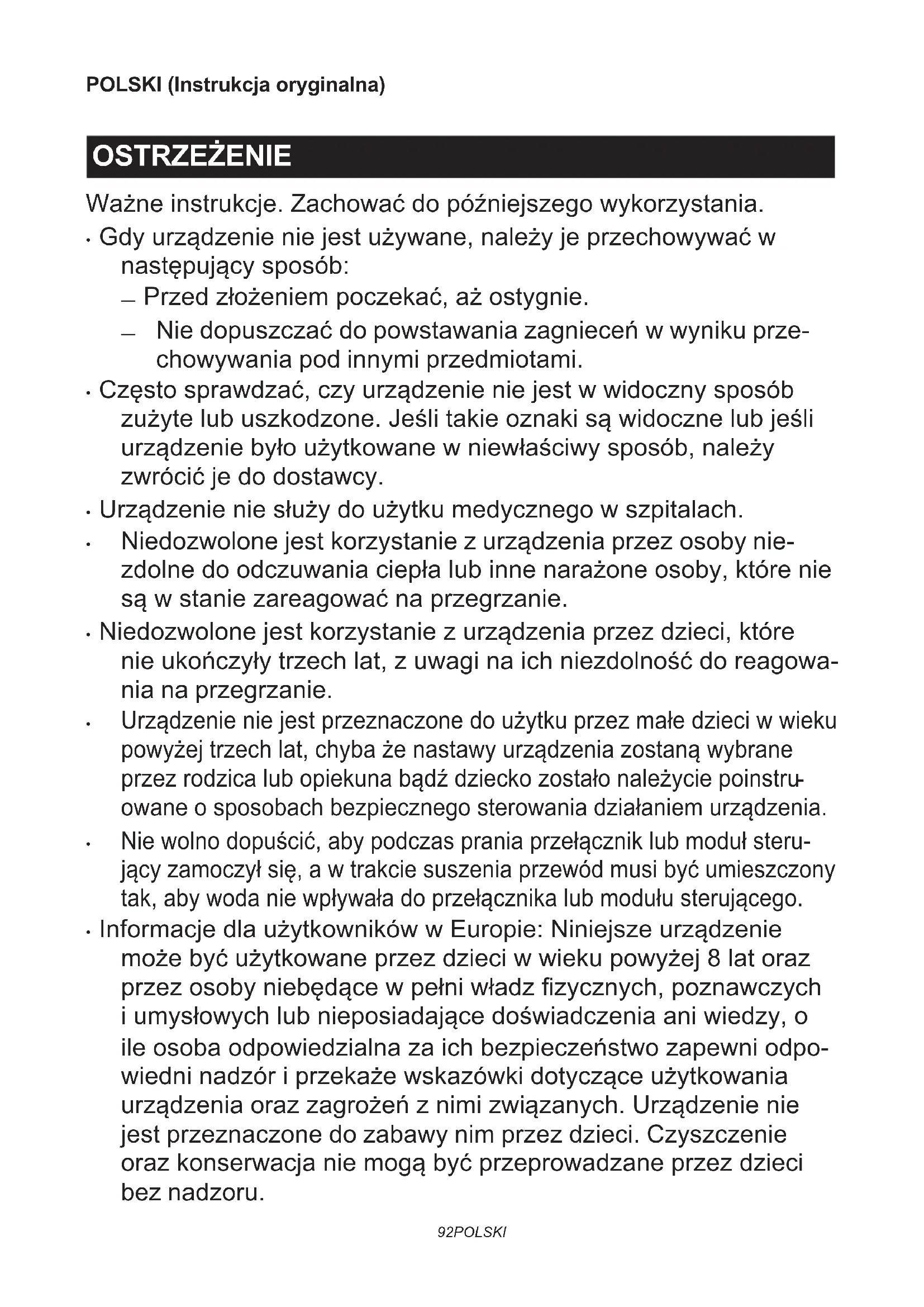 - Niedozwolone jest korzystanie z urządzenia przez osoby nie- zdolne do odczuwania ciepła lub inne narażone osoby, które nie są w stanie zareagować na przegrzanie.