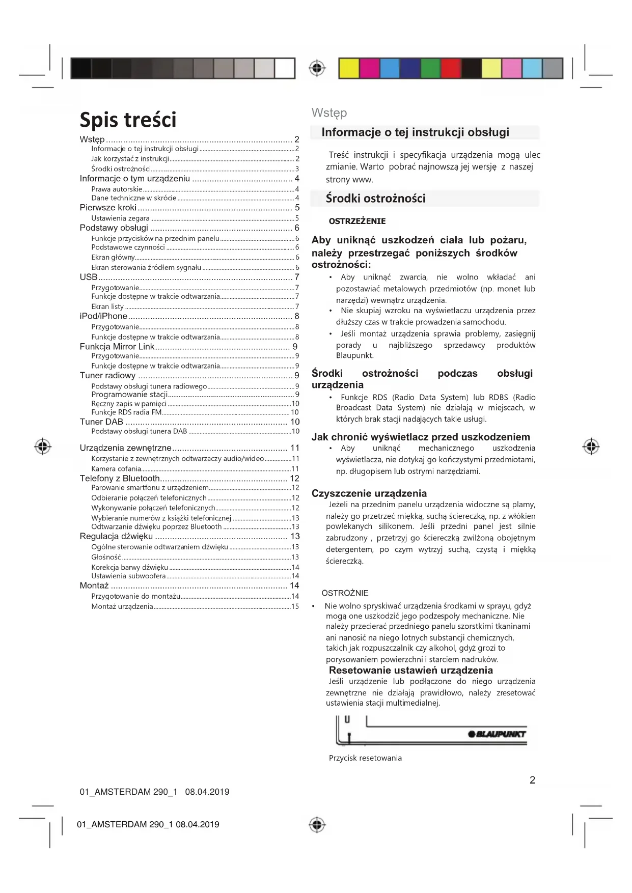 with 6.75 inch TFT panel Enjoy it. en Operating and installation instructions Subject to change and technical modication01_AMSTERDAM 290_1 08.04.2019 01_AMSTERDAM 290_1 08.04.2019 Deklaracja zgodności Blaupunkt Competence Center Car Multimedia-Evo Sales GmbH oświadcza niniejszym, że przedmiotowe urządzenie spełnia podstawowe wymagania i inne stosowne przepisy dyrektywy 2014/53/UE. Deklarację zgodności można znaleźć na stronie www.blaupunkt.com. Uwagi dotyczące czyszczenia urządzenia Rozpuszczalniki, środki czyszczące oraz ścierne, a także spraye do czyszczenia kokpitów i środki do pielęgnacji tworzyw sztucznych mogą zawierać składniki mogące uszkodzić powierzchnię urządzenia. ♦ Do czyszczenia urządzenia należy używać wyłącznie suchej lub lekko zwilżonej ściereczki. ♦ W razie potrzeby należy wyczyścić styki panelu sterowania za pomocą miękkiej ściereczki nasączonej detergentem na bazie alkoholu. Utylizacja urządzenia Nie wolno wyrzucać zużytego urządzenia wraz z odpadami z gospodarstwa domowego! Zużyte urządzenie należy zutylizować przekazując je do punktu zbiórki odpadów elektrycznych i elektronicznych. Informacje o tym urządzeniu Prawa autorskie