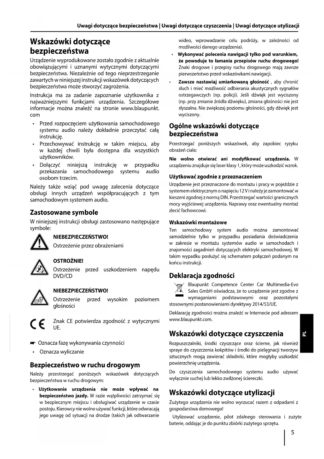 - Zawsze nastawiaj umiarkowaną głośność , aby chronić słuch i mieć możliwość odbierania akustycznych sygnałów ostrzegawczych (np. policji). Jeśli dźwięk jest wyciszony (np. przy zmianie źródła dźwięku), zmiana głośności nie jest słyszalna. Nie zwiększaj poziomu głośności, gdy dźwięk jest wyciszony. Ogólne wskazówki dotyczące bezpieczeństwa Przestrzegać poniższych wskazówek, aby zapobiec ryzyku obrażeń ciała:Nie wolno otwierać ani modykować urządzenia. W urządzeniu znajduje się laser klasy 1, który może uszkodzić wzrok. Użytkować zgodnie z przeznaczeniem Urządzenie jest przeznaczone do montażu i pracy w pojeździe z systemem elektrycznym o napięciu 12 V i należy je zamontować w kieszeni zgodnej z normą DIN. Przestrzegać wartości granicznych mocy wyjściowej urządzenia. Naprawy oraz ewentualny montaż zlecić fachowcowi. Wskazówki montażowe Ten samochodowy system audio można zamontować samodzielnie tylko w przypadku posiadania doświadczenia w zakresie w montażu systemów audio w samochodach i znajomości zagadnień dotyczących elektryki samochodowej. W takim wypadku posłużyć się schematem połączeń podanym na końcu instrukcji. Deklaracja zgodności Blaupunkt Competence Center Car Multimedia-Evo Sales GmbH oświadcza, że to urządzenie jest zgodne z wymaganiami podstawowymi oraz pozostałymi stosownymi postanowieniami dyrektywy 2014/53/UE.Deklarację zgodności można znaleźć w Internecie pod adresem www.blaupunkt.com. Wskazówki dotyczące czyszczenia Rozpuszczalniki, środki czyszczące oraz ścierne, jak również spraye do czyszczenia kokpitów i środki do pielęgnacji tworzyw sztucznych mogą zawierać składniki, które mogłyby uszkodzić powierzchnię urządzenia.Do czyszczenia samochodowego systemu audio używać wyłącznie suchej lub lekko zwilżonej ściereczki. Wskazówki dotyczące utylizacji Zużytego urządzenia nie wolno wyrzucać razem z odpadami z gospodarstwa domowego! Utylizować urządzenie, pilot zdalnego sterowania i zużyte baterie, oddając je do punktu zbiórki zużytego sprzętu. PL6 Ostrzeżenie Nie połykać baterii (dostarczane w zestawie z pilotem) - zagrożenie chemiczne. Produkt zawiera baterię pastylkową. W przypadku połknięcia baterii pastylkowej w ciągu zaledwie 2 godzin może dojść do poważnego oparzenia wewnętrznego, co może prowadzić do śmierci. Przechowywać nowe i używane baterie poza zasięgiem dzieci. Jeśli komora baterii nie domyka się właściwie, nie używać produktu i trzymać go poza zasięgiem dzieci. Natychmiast zasięgnąć pomocy medycznej w przypadku podejrzenia, że baterie mogły zostać połknięte lub znalazły się w ciele. Zakres dostawy Zakres dostawy obejmuje: