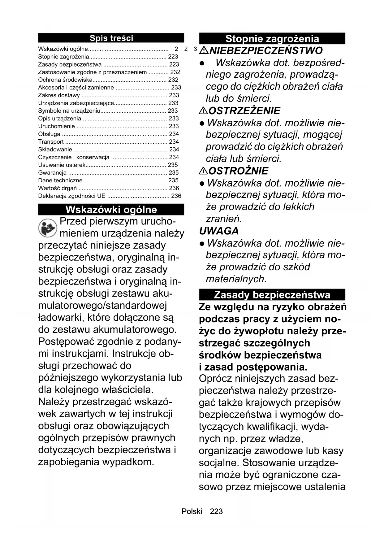 - Dolžina rezila mm 500 Teža (brez paketa akumulatorskih baterij) kg 2,7 Chairman of the Board of ManagementDirector Regulatory Affairs & Certification H. Jenner S. ReiserPolski 223 Spis treści Wskazówki ogólne Przed pierwszym urucho- mieniem urządzenia należy przeczytać niniejsze zasady bezpieczeństwa, oryginalną in- strukcję obsługi oraz zasady bezpieczeństwa i oryginalną in- strukcję obsługi zestawu aku- mulatorowego/standardowej ładowarki, które dołączone są do zestawu akumulatorowego. Postępować zgodnie z podany- mi instrukcjami. Instrukcje ob- sługi przechować do późniejszego wykorzystania lub dla kolejnego właściciela. Należy przestrzegać wskazó- wek zawartych w tej instrukcji obsługi oraz obowiązujących ogólnych przepisów prawnych dotyczących bezpieczeństwa i zapobiegania wypadkom. Stopnie zagrożenia NIEBEZPIECZEŃSTWO ● Wskazówka dot. bezpośred- niego zagrożenia, prowadzą- cego do ciężkich obrażeń ciała lub do śmierci. 몇 OSTRZEŻENIE ● Wskazówka dot. możliwie nie- bezpiecznej sytuacji, mogącej prowadzić do ciężkich obrażeń ciała lub śmierci. 몇 OSTROŻNIE ● Wskazówka dot. możliwie nie- bezpiecznej sytuacji, która mo- że prowadzić do lekkich zranień. UWAGA ● Wskazówka dot. możliwie nie- bezpiecznej sytuacji, która mo- że prowadzić do szkód materialnych. Zasady bezpieczeństwa Ze względu na ryzyko obrażeń podczas pracy z użyciem no- życ do żywopłotu należy prze- strzegać szczególnych środków bezpieczeństwa i zasad postępowania. Oprócz niniejszych zasad bez- pieczeństwa należy przestrze- gać także krajowych przepisów bezpieczeństwa i wymogów do- tyczących kwalifikacji, wyda- nych np. przez władze, organizacje zawodowe lub kasy socjalne. Stosowanie urządze- nia może być ograniczone cza- sowo przez miejscowe ustalenia Wskazówki ogólne p. 223