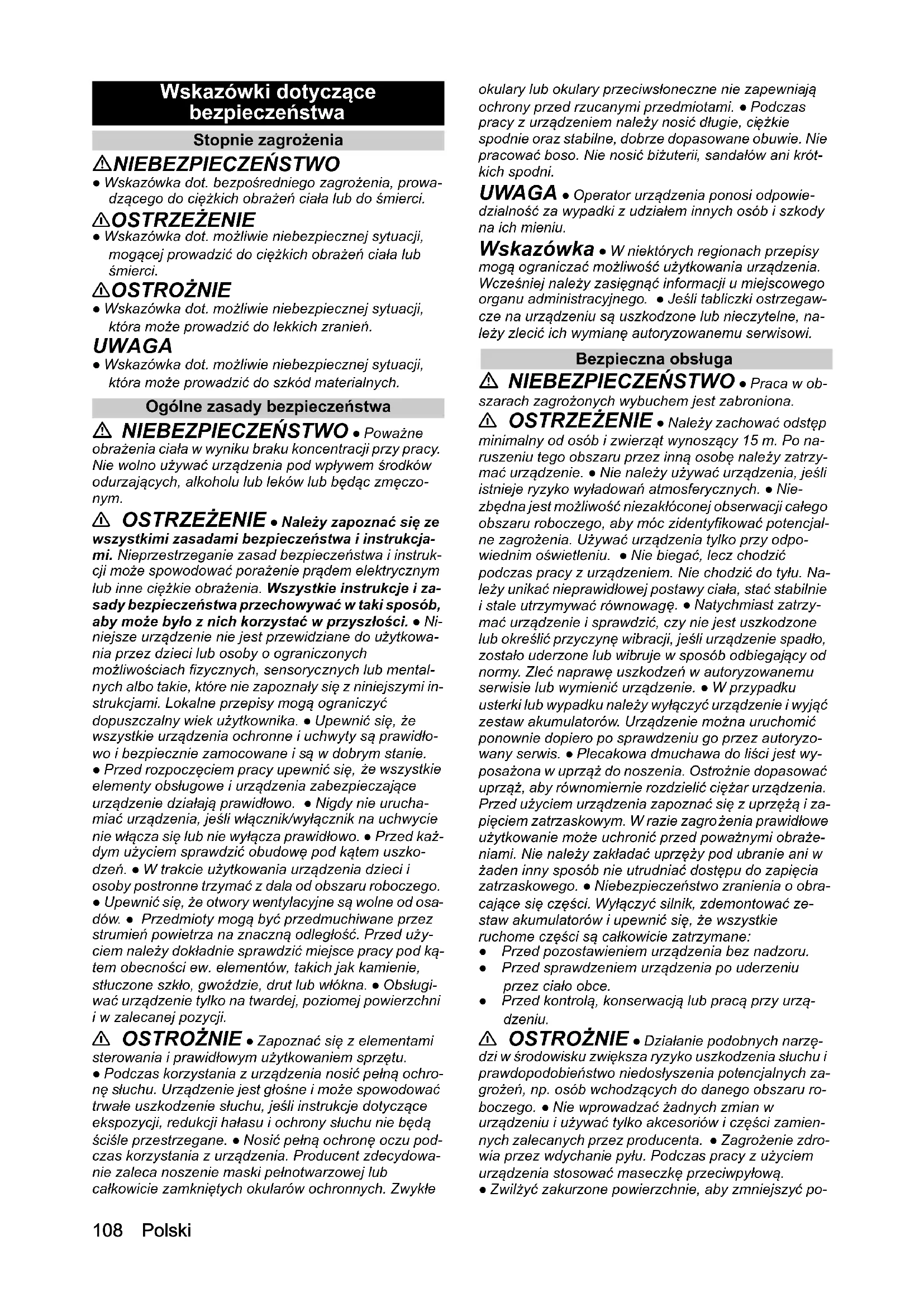 - Deklaracja zgodności UE Chairman of the Board of ManagementDirector Regulatory Affairs & Certification H. Jenner S. Reiser108 Polski Wskazówki dotyczące bezpieczeństwa Stopnie zagrożenia NIEBEZPIECZEŃSTWO ● Wskazówka dot. bezpośredniego zagrożenia, prowa- dzącego do ciężkich obrażeń ciała lub do śmierci. 몇 OSTRZEŻENIE ● Wskazówka dot. możliwie niebezpiecznej sytuacji, mogącej prowadzić do ciężkich obrażeń ciała lub śmierci. 몇 OSTROŻNIE ● Wskazówka dot. możliwie niebezpiecznej sytuacji, która może prowadzić do lekkich zranień. UWAGA ● Wskazówka dot. możliwie niebezpiecznej sytuacji, która może prowadzić do szkód materialnych. Ogólne zasady bezpieczeństwa NIEBEZPIECZEŃSTWO ● Poważne obrażenia ciała w wyniku braku koncentracji przy pracy. Nie wolno używać urządzenia pod wpływem środków odurzających, alkoholu lub leków lub będąc zmęczo- nym. 몇 OSTRZEŻENIE ● Należy zapoznać się ze wszystkimi zasadami bezpieczeństwa i instrukcja- mi. Nieprzestrzeganie zasad bezpieczeństwa i instruk- cji może spowodować porażenie prądem elektrycznym lub inne ciężkie obrażenia. Wszystkie instrukcje i za- sady bezpieczeństwa przechowywać w taki sposób, aby może było z nich korzystać w przyszłości. ● Ni- niejsze urządzenie nie jest przewidziane do użytkowa- nia przez dzieci lub osoby o ograniczonych możliwościach fizycznych, sensorycznych lub mental- nych albo takie, które nie zapoznały się z niniejszymi in- strukcjami. Lokalne przepisy mogą ograniczyć dopuszczalny wiek użytkownika. ● Upewnić się, że wszystkie urządzenia ochronne i uchwyty są prawidło- wo i bezpiecznie zamocowane i są w dobrym stanie. ● Przed rozpoczęciem pracy upewnić się, że wszystkie elementy obsługowe i urządzenia zabezpieczające urządzenie działają prawidłowo. ● Nigdy nie urucha- miać urządzenia, jeśli włącznik/wyłącznik na uchwycie nie włącza się lub nie wyłącza prawidłowo. ● Przed każ- dym użyciem sprawdzić obudowę pod kątem uszko- dzeń. ● W trakcie użytkowania urządzenia dzieci i osoby postronne trzymać z dala od obszaru roboczego. ● Upewnić się, że otwory wentylacyjne są wolne od osa- dów. ● Przedmioty mogą być przedmuchiwane przez strumień powietrza na znaczną odległość. Przed uży- ciem należy dok ładnie sprawdzić miejsce pracy pod ką- tem obecności ew. elementów, takich jak kamienie, stłuczone szkło, gwoździe, drut lub włókna. ● Obsługi- wać urządzenie tylko na twardej, poziomej powierzchni i w zalecanej pozycji. 몇 OSTROŻNIE ● Zapoznać się z elementami sterowania i prawidłowym użytkowaniem sprzętu. ● Podczas korzystania z urządzenia nosić pełną ochro- nę słuchu. Urządzenie jest głośne i może spowodować trwałe uszkodzenie słuchu, jeśli instrukcje dotyczące ekspozycji, redukcji hałasu i ochrony słuchu nie będą ściśle przestrzegane. ● Nosić pełną ochronę oczu pod- czas korzystania z urządzenia. Producent zdecydowa- nie zaleca noszenie maski pełnotwarzowej lub całkowicie zamkniętych okularów ochronnych. Zwykłe okulary lub okulary przeciwsłoneczne nie zapewniają ochrony przed rzucanymi przedmiotami. ● Podczas pracy z urządzeniem należy nosić długie, ciężkie spodnie oraz stabilne, dobrze dopasowane obuwie. Nie pracować boso. Nie nosić biżuterii, sandałów ani krót- kich spodni. UWAGA ● Operator urządzenia ponosi odpowie- dzialność za wypadki z udziałem innych osób i szkody na ich mieniu. Wskazówka ● W niektórych regionach przepisy mogą ograniczać możliwość użytkowania urządzenia. Wcześniej należy zasięgnąć informacji u miejscowego organu administracyjnego. ● Jeśli tabliczki ostrzegaw- cze na urządzeniu są uszkodzone lub nieczytelne, na- leży zlecić ich wymianę autoryzowanemu serwisowi. Bezpieczna obsługa NIEBEZPIECZEŃSTWO ● Praca w ob- szarach zagrożonych wybuchem jest zabroniona. 몇 OSTRZEŻENIE ● Należy zachować odstęp minimalny od osób i zwierząt wynoszący 15 m. Po na- ruszeniu tego obszaru przez inną osobę należy zatrzy- mać urządzenie. ● Nie należy używać urządzenia, jeśli istnieje ryzyko wyładowań atmosferycznych. ● Nie- zbędna jest możliwość niezakłóconej obserwacji całego obszaru roboczego, aby móc zidentyfikować potencjal- ne zagrożenia. Używać urządzenia tylko przy odpo- wiednim oświetleniu. ● Nie biegać, lecz chodzić podczas pracy z urządzeniem. Nie chodzić do tyłu. Na- leży unikać nieprawidłowej postawy ciała, stać stabilnie i stale utrzymywać równowag ę. ● Natychmiast zatrzy- mać urządzenie i sprawdzić, czy nie jest uszkodzone lub określić przyczynę wibracji, jeśli urządzenie spadło, zostało uderzone lub wibruje w sposób odbiegający od normy. Zleć naprawę uszkodzeń w autoryzowanemu serwisie lub wymienić urządzenie. ● W przypadku usterki lub wypadku należy wyłączyć urządzenie i wyjąć zestaw akumulatorów. Urządzenie można uruchomić ponownie dopiero po sprawdzeniu go przez autoryzo- wany serwis. ● Plecakowa dmuchawa do liści jest wy- posażona w uprząż do noszenia. Ostrożnie dopasować uprząż, aby równomiernie rozdzielić ciężar urządzenia. Przed użyciem urządzenia zapoznać się z uprzężą i za- pięciem zatrzaskowym. W razie zagro żenia prawidłowe użytkowanie może uchronić przed poważnymi obraże- niami. Nie należy zakładać uprzęży pod ubranie ani w żaden inny sposób nie utrudniać dostępu do zapięcia zatrzaskowego. ● Niebezpieczeństwo zranienia o obra- cające się części. Wyłączyć silnik, zdemontować ze- staw akumulatorów i upewnić się, że wszystkie ruchome części są całkowicie zatrzymane: ● Przed pozostawieniem urządzenia bez nadzoru. ● Przed sprawdzeniem urządzenia po uderzeniu przez ciało obce. ● Przed kontrolą, konserwacją lub pracą przy urzą- dzeniu. 몇 OSTROŻNIE ● Działanie podobnych narzę