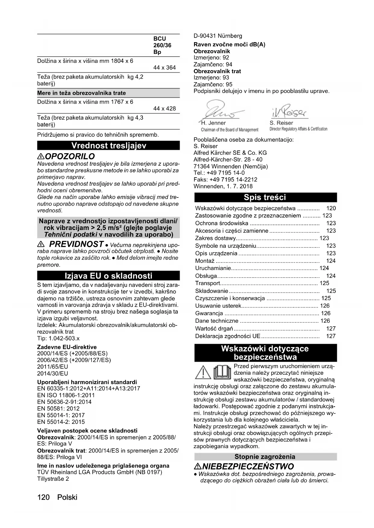 EN 50636-2-91:2014 EN 50581: 2012 EN 55014-1: 2017 EN 55014-2: 2015 Veljaven postopek ocene skladnosti Obrezovalnik: 2000/14/ES in spremenjen z 2005/88/ ES: Priloga V Obrezovalnik trat: 2000/14/ES in spremenjen z 2005/ 88/ES: Priloga VI Ime in naslov udeleženega priglašenega organa TÜV Rheinland LGA Products GmbH (NB 0197) Tillystraße 2 D-90431 Nürnberg Raven zvočne moči dB(A) Obrezovalnik Izmerjeno: 92 Zajamčeno: 94 Obrezovalnik trat Izmerjeno: 93 Zajamčeno: 95 Podpisniki delujejo v imenu in po pooblastilu uprave. Pooblaščena oseba za dokumentacijo: S. Reiser Alfred Kärcher SE & Co. KG Alfred-Kärcher-Str. 28 - 40 71364 Winnenden (Nemčija) Tel.: +49 7195 14-0 Faks: +49 7195 14-2212 Winnenden, 1. 7. 2018 Spis treści Wskazówki dotyczące bezpieczeństwa Przed pierwszym uruchomieniem urzą- dzenia należy przeczytać niniejsze wskazówki bezpieczeństwa, oryginalną instrukcję obsługi oraz załączone do zestawu akumula- torów wskazówki bezpieczeństwa oraz oryginalną in- strukcję obsługi zestawu akumulatorów / standardowej ładowarki. Postępować zgodnie z podanymi instrukcja- mi. Instrukcje obsługi przechować do późniejszego wy- korzystania lub dla kolejnego właściciela. Należy przestrzegać wskazówek zawartych w tej in- strukcji obsługi oraz obowiązujących ogólnych przepi- sów prawnych dotyczących bezpieczeństwa i zapobiegania wypadkom. Stopnie zagrożenia NIEBEZPIECZEŃSTWO ● Wskazówka dot. bezpośredniego zagrożenia, prowa- dzącego do ciężkich obrażeń ciała lub do śmierci. Dolžina x širina x višina mm 1804 x 6 44 x 364 Teža (brez paketa akumulatorskih baterij) kg 4,2 Mere in teža obrezovalnika trate Dolžina x širina x višina mm 1767 x 6 44 x 428 Teža (brez paketa akumulatorskih baterij) kg 4,3 BCU 260/36