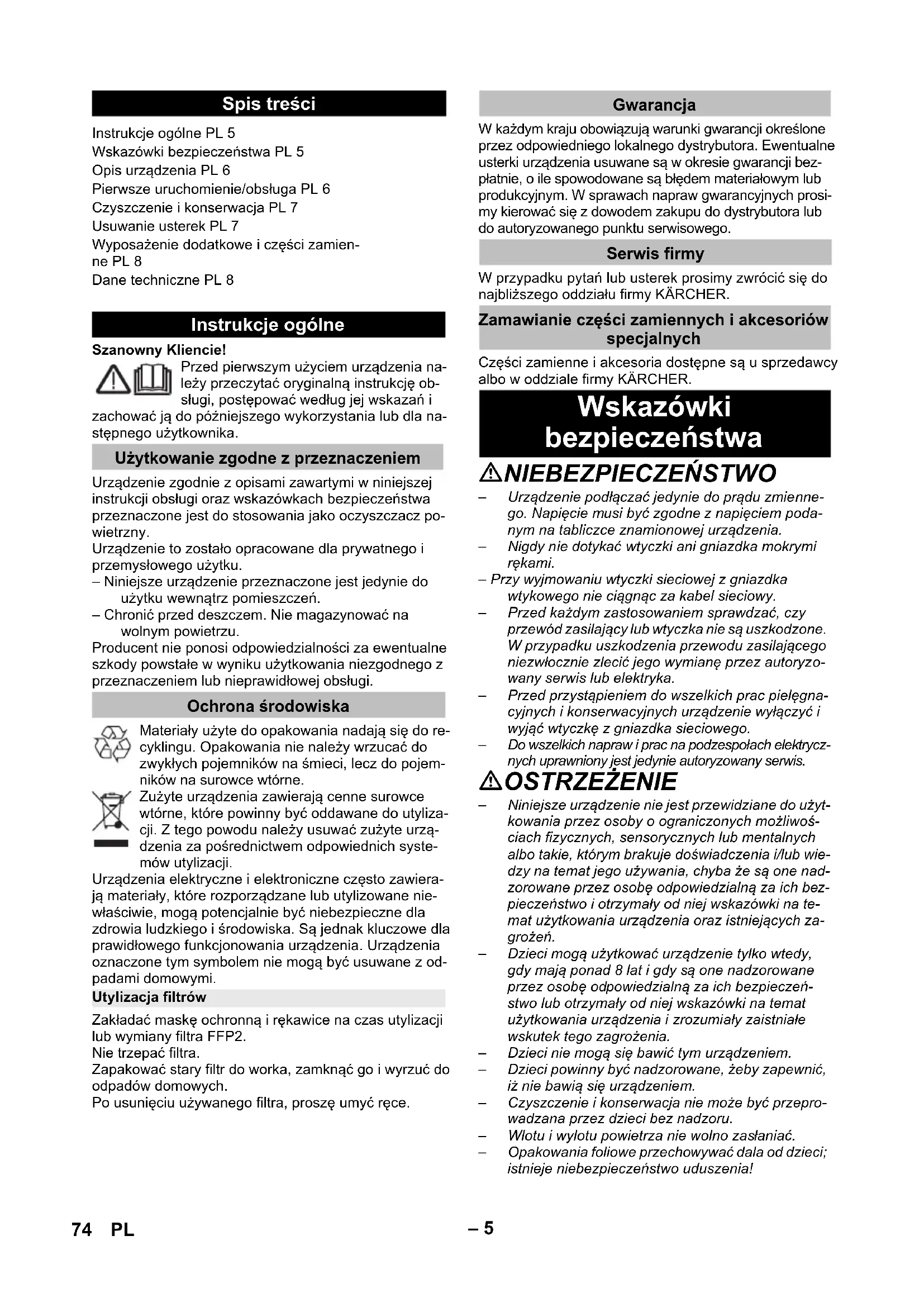 nie bawią się urządzeniem. – Czyszczenie i konserwacja nie może być przepro- wadzana przez dzieci bez nadzoru. – Wlotu i wylotu powietrza nie wolno zasłaniać. – Opakowania foliowe przechowywać dala od dzieci; istnieje niebezpieczeństwo uduszenia! Spis treści Instrukcje ogólne PL 5 Wskazówki bezpieczeństwa PL 5 Opis urządzenia PL 6 Pierwsze uruchomienie/obsługa PL 6 Czyszczenie i konserwacja PL 7 Usuwanie usterek PL 7 Wyposażenie dodatkowe i części zamien- ne PL 8 Dane techniczne PL 8 Instrukcje ogólne Użytkowanie zgodne z przeznaczeniem Ochrona środowiska Utylizacja filtrów Gwarancja Serwis firmy Zamawianie części zamiennych i akcesoriów specjalnych Wskazówki bezpieczeństwa 74 PL– 6 – Po każdym użyciu i przed każdym czyszczeniem/ konserwacją urządzenie należy wyłączyć. – Eksploatacja urządzenia w miejscach zagrożonych wybuchem jest zabroniona. – Nie ustawiać urządzenia w pobliżu źródła ciepła. OSTROŻNIE – Urządzenie nie zastępuje odpowiedniego wietrze- nia. – Ustawić urządzenie na równym podłożu. – Należy korzystać wyłącznie z oryginalnych części zamiennych KÄRCHER. – Nie należy korzystać z urządzenia w wilgotnym otoczeniu bądź pomieszczeniach o wysokich tem- peraturach otoczenia, np. w łazience, kuchni. NIEBEZPIECZEŃSTWO Wskazówka dot. bezpośredniego zagrożenia, prowa- dzącego do ciężkich obrażeń ciała lub do śmierci. 몇 OSTRZEŻENIE Wskazówka dot. możliwie niebezpiecznej sytuacji, mo- gącej prowadzić do ciężkich obrażeń ciała lub śmierci. 몇 OSTROŻNIE Wskazówka dot. możliwie niebezpiecznej sytuacji, która może prowadzić do lekkich zranień. UWAGA Wskazówka dot. możliwie niebezpiecznej sytuacji, która może prowadzić do szkód materialnych. Podczas rozpakowywania urządzenia należy spraw- dzić, czy w opakowaniu znajdują się wszystkie elemen- ty i czy nic nie jest uszkodzone. W przypadku stwierdze- nia uszkodzeń w transporcie należy zwrócić się do dys- trybutora. Ilustracje, patrz strony rozkładane! 1 Pokrywa filtra, przednia 2 Filtr wstępny 3 Filtr główny 4 Pokrywa filtra, tylna 5 Wylot powietrza 6 Wyświetlacz cyfrowy 7 Pole obsługi 8 Wskazanie jakości powietrza 9 Rączka pokrywy filtra 10 Pokryw czujnika jakości powietrza 11 Przyłącze sieciowe 12 Przycisk WŁ/WYŁ 13 Przycisk Tryb manualny 14 Przycisk Tryb automatyczny 15 Przycisk Tryb nocny 16 Wskaźnik wymiany filtra UWAGA Urządzenie może pracować zawsze wyłącznie z zasto- sowanymi filtrami wstępnym i drobnosiatkowym. Rysunek Przed pierwszym uruchomieniem należy rozpako- wać zastosowany już urządzeniu filtr dokładny. Przewód zasilania podłączyć do urządzenia Wprowadzić wtyczkę do gniazda. Na krótko zapalą się wszystkie przyciski obsługo- we na pulpicie oraz wskazanie jakości powietrze, później zgasną. Użyć przycisku Wł/wył, aby włączyć urządzenie. Wskazówka – Jeżeli urządzenie zostanie włączone, to zintegro- wany czujnik jakości powietrza automatycznie sprawdzić jakość powietrza w pomieszczeniu. – Ustawić wymagany tryb poprzez przycisk obsługo- wy na pulpicie. Gdy aktywowany jest tryb automatyczny, to urządzenie wybiera odpowiednią prędkość nadmuchu zmierzonej jakości powietrza. Użyć przycisku Wł/wył, aby włączyć urządzenie. Użyć przycisku Tryb automatyczny. Podświetli się odpowiedni przycisk. Wskazówka – Zintegrowany czujnik jakości powietrza zmierzy ja- kość powietrza i wybierze automatycznie popraw- ny stropień prędkości, aby zagwarantować możli- wie najlepszą jakość powietrza w pomieszczeniu. – Jak tylko powietrze będzie czyste, urządzenie przełączy się na niższą prędkość wentylatora. Gdy aktywowany jest tryb manualny, to prędkość wen- tylatora można ustawiać ręcznie. Użyć przycisku Wł/wył, aby włączyć urządzenie. Użyć przycisku Tryb manualny. Podświetli się odpowiedni przycisk. Wskazówka – Poprzez parokrotne użycie można ustawiać 3 stop- nie prędkości wentylatora. Gdy jest włączony tryb nocny, wyłączone zostają ele- menty panelu obsługi oraz wskaźniki. Urządzenie nadal pracuje, a prędkość wentylatora prze- łącza się na najniższy stopień. Poprzez dotknięcie panelu oświetlenie urządzenia jest ponownie aktywowane. Użyć przycisku Wł/wył, aby włączyć urządzenie. Użyć przycisk Tryb nocny. Podświetli się odpowiedni przycisk. Elementy panelu obsługi i wskaźniki wyłączają się z opóźnieniem. Stopnie zagrożenia Opis urządzenia Pierwsze uruchomienie/obsługa Pierwsze uruchomienie Uruchomienie Pole obsługi Tryb automatyczny Tryb manualny Wskazanie Prędkość wentylatora jedna łopatka wentyla- tora mała dwie łopatki wentylato-