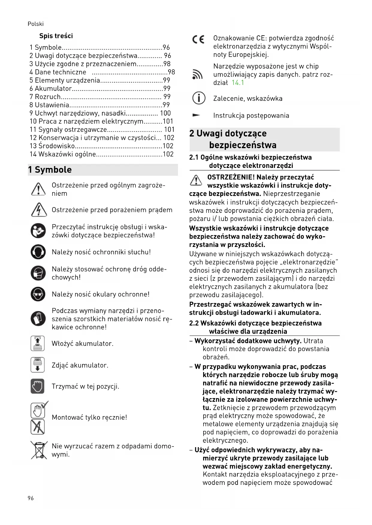 - 14 Wskazówki ogólne 1 Symbole Ostrzeżenie przed ogólnym zagroże niem Ostrzeżenie przed porażeniem prądem Przeczytać instrukcję obsługi i wska zówki dotyczące bezpieczeństwa! Należy nosić ochronniki słuchu! Należy stosować ochronę dróg odde chowych! Należy nosić okulary ochronne! Podczas wymiany narzędzi i przeno szenia szorstkich materiałów nosić rę kawice ochronne! Włożyć akumulator. Zdjąć akumulator. Trzymać w tej pozycji. Montować tylko ręcznie! Nie wyrzucać razem z odpadami domo wymi. Oznakowanie CE: potwierdza zgodność elektronarzędzia z wytycznymi Wspól noty Europejskiej. Narzędzie wyposażone jest w chip umożliwiający zapis danych. patrz roz dział p. 102