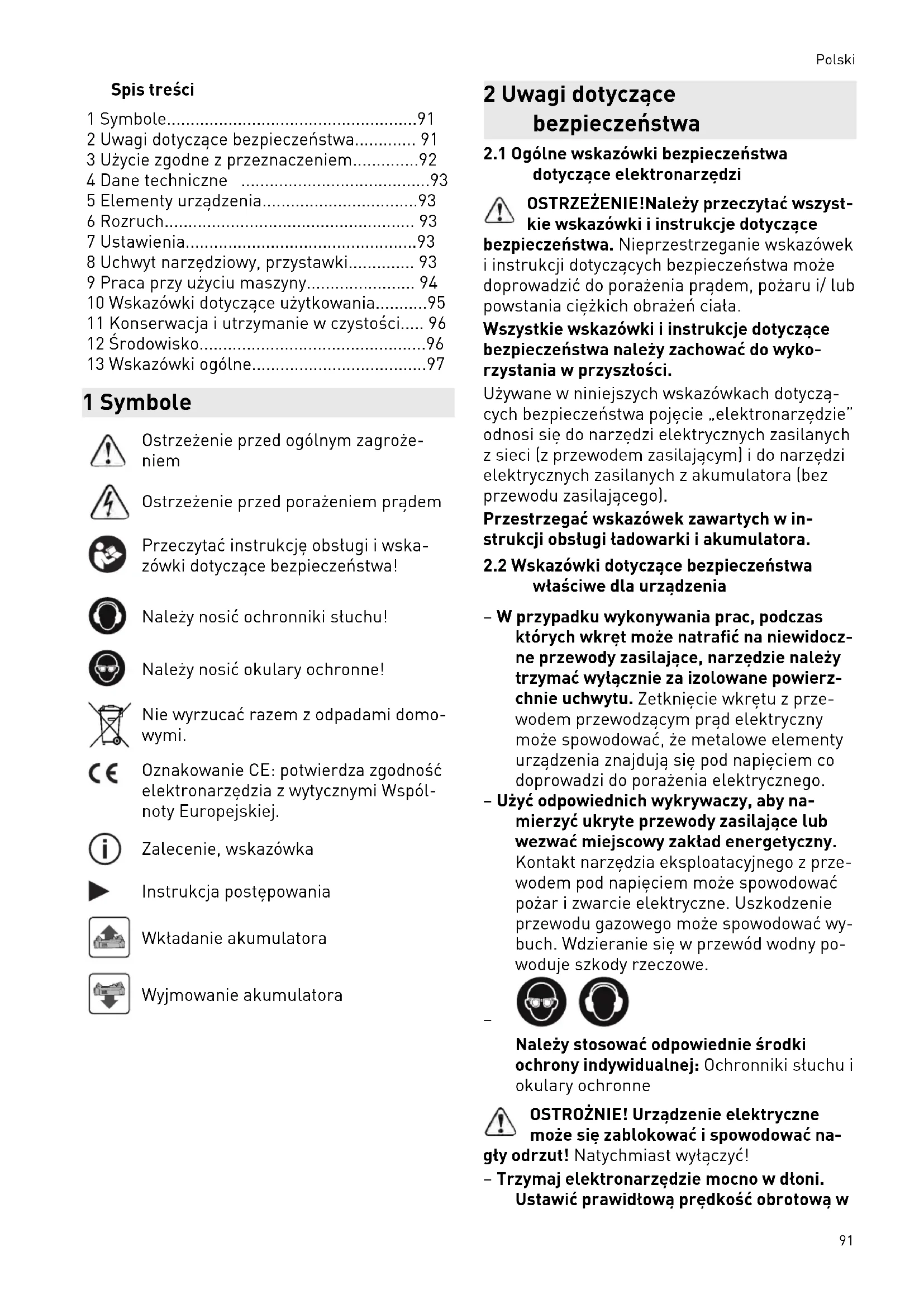 - 13 Wskazówki ogólne 1 Symbole Ostrzeżenie przed ogólnym zagroże niem Ostrzeżenie przed porażeniem prądem Przeczytać instrukcję obsługi i wska zówki dotyczące bezpieczeństwa! Należy nosić ochronniki słuchu! Należy nosić okulary ochronne! Nie wyrzucać razem z odpadami domo wymi. Oznakowanie CE: potwierdza zgodność elektronarzędzia z wytycznymi Wspól noty Europejskiej. Zalecenie, wskazówka Instrukcja postępowania Wkładanie akumulatora Wyjmowanie akumulatora 2 Uwagi dotyczące bezpieczeństwa p. 97