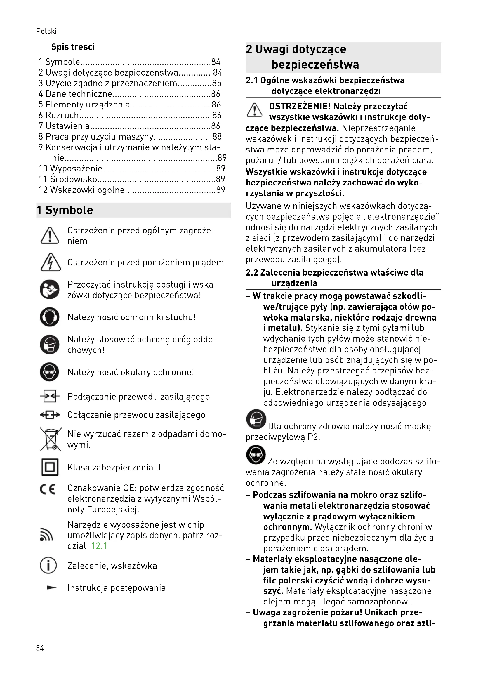 - 12 Wskazówki ogólne 1 Symbole Ostrzeżenie przed ogólnym zagroże niem Ostrzeżenie przed porażeniem prądem Przeczytać instrukcję obsługi i wska zówki dotyczące bezpieczeństwa! Należy nosić ochronniki słuchu! Należy stosować ochronę dróg odde chowych! Należy nosić okulary ochronne! Podłączanie przewodu zasilającego Odłączanie przewodu zasilającego Nie wyrzucać razem z odpadami domo wymi. Klasa zabezpieczenia II Oznakowanie CE: potwierdza zgodność elektronarzędzia z wytycznymi Wspól noty Europejskiej. Narzędzie wyposażone jest w chip umożliwiający zapis danych. patrz roz dział 12.1 Zalecenie, wskazówka Instrukcja postępowania 2 Uwagi dotyczące bezpieczeństwa p. 89