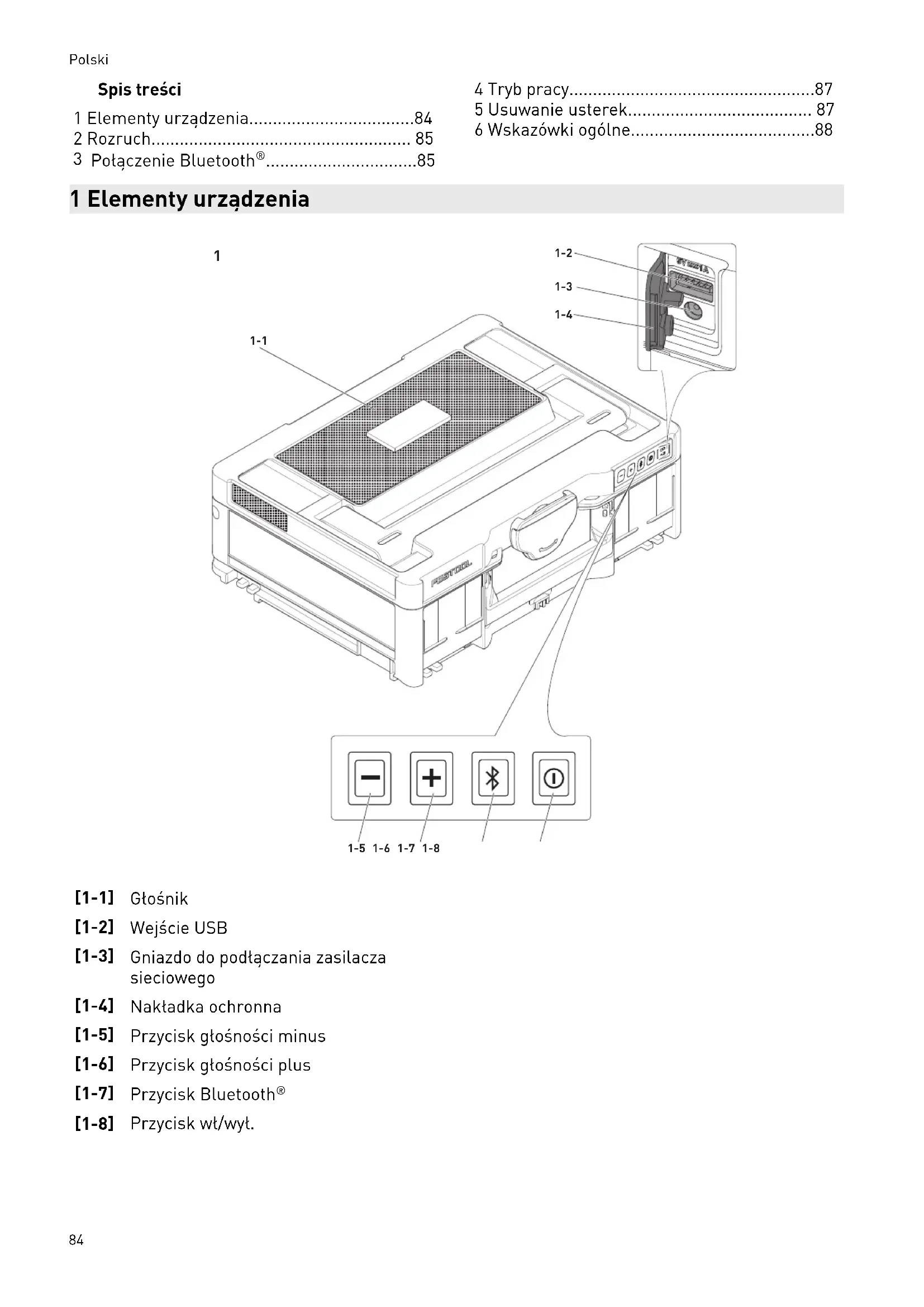 Nacisnac przycisk wt./wyt. [1-8] i przytrzymac dtluzej niz jeder sekunde, az diodaLED przycisku Bluetooth [1-7] zaczniemigać na niebiesko.
