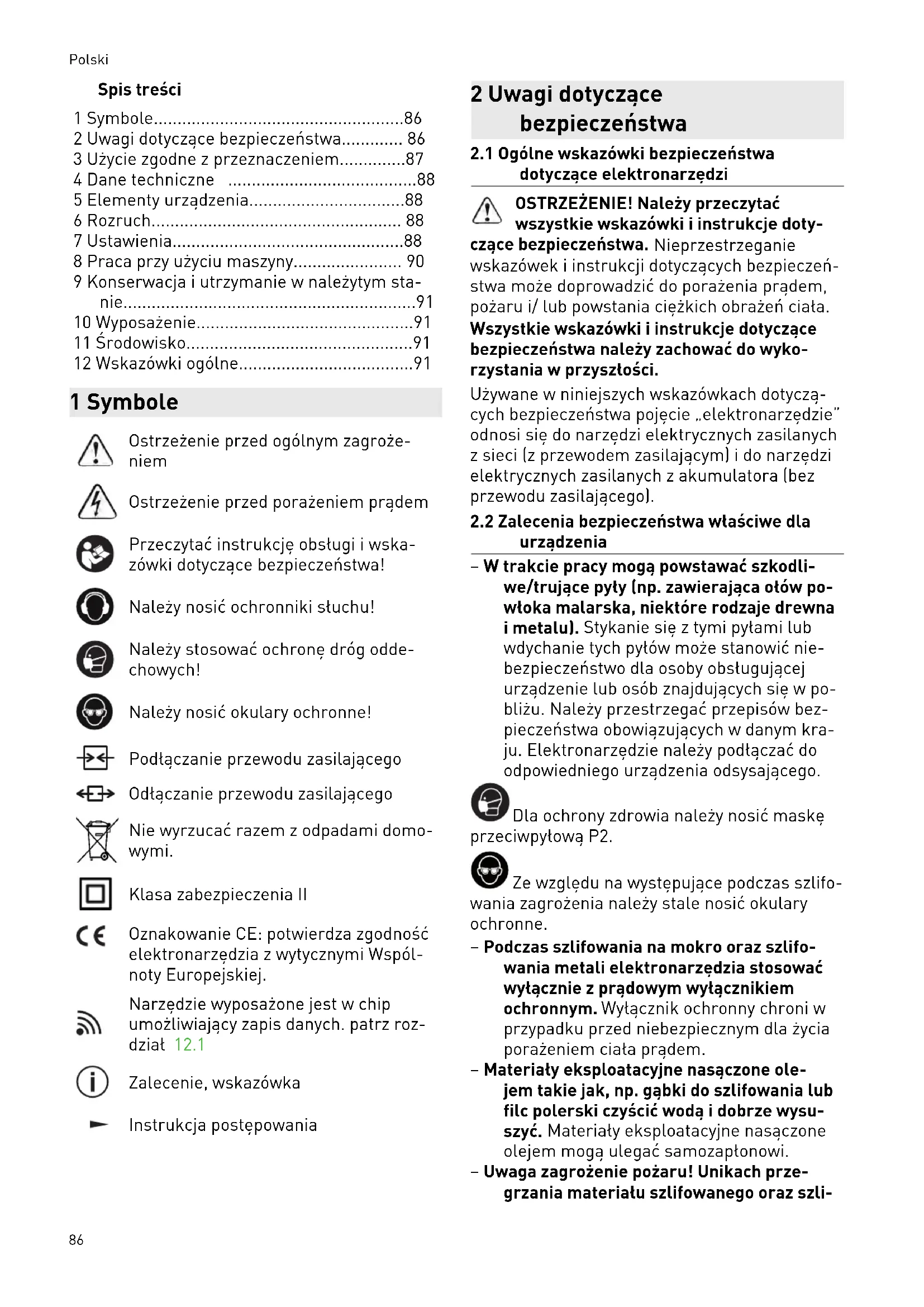 - 12 Wskazówki ogólne 1 Symbole Ostrzeżenie przed ogólnym zagroże niem Ostrzeżenie przed porażeniem prądem Przeczytać instrukcję obsługi i wska zówki dotyczące bezpieczeństwa! Należy nosić ochronniki słuchu! Należy stosować ochronę dróg odde chowych! Należy nosić okulary ochronne! Podłączanie przewodu zasilającego Odłączanie przewodu zasilającego Nie wyrzucać razem z odpadami domo wymi. Klasa zabezpieczenia II Oznakowanie CE: potwierdza zgodność elektronarzędzia z wytycznymi Wspól noty Europejskiej. Narzędzie wyposażone jest w chip umożliwiający zapis danych. patrz roz dział p. 91