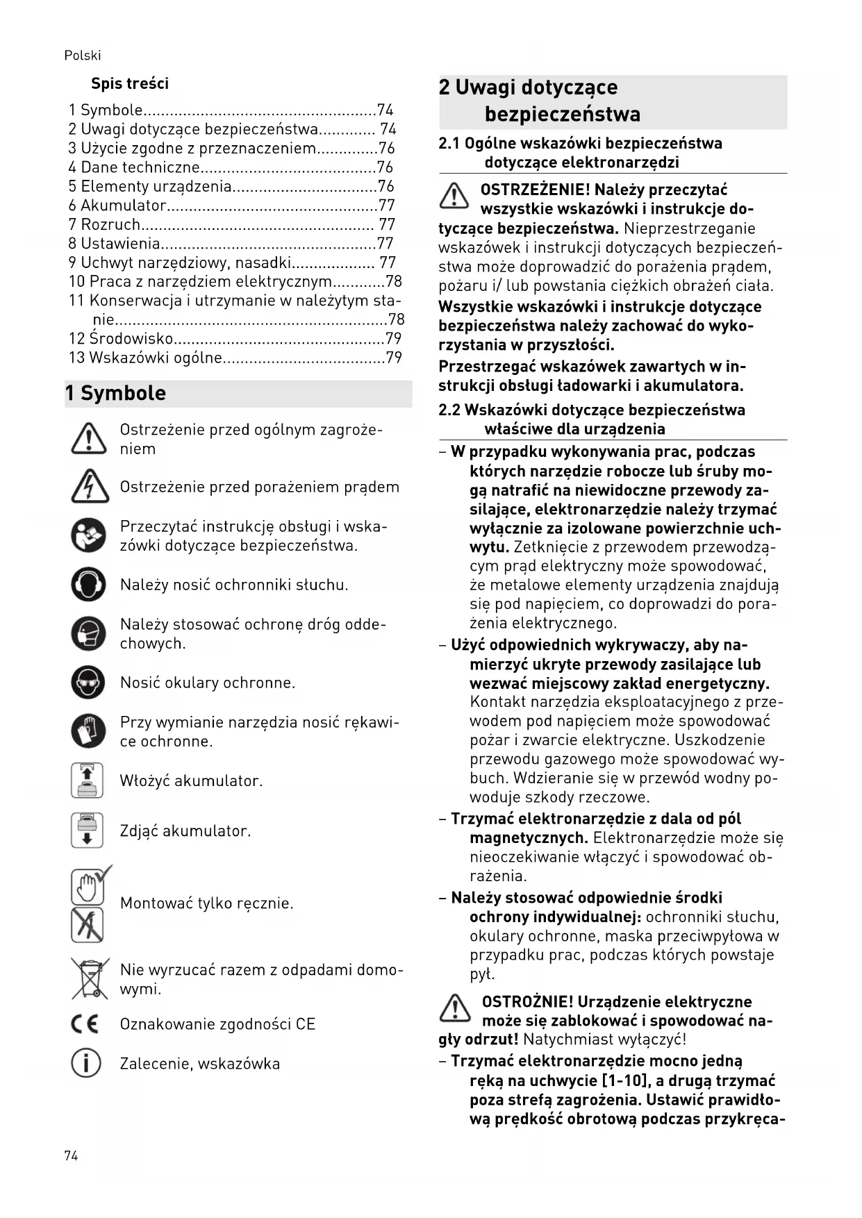 - 13 Wskazówki ogólne 1 Symbole Ostrzeżenie przed ogólnym zagroże niem Ostrzeżenie przed porażeniem prądem Przeczytać instrukcję obsługi iwska zówki dotyczące bezpieczeństwa. Należy nosić ochronniki słuchu. Należy stosować ochronę dróg odde chowych. Nosić okulary ochronne. Przy wymianie narzędzia nosić rękawi ce ochronne. Włożyć akumulator. Zdjąć akumulator. Montować tylko ręcznie. Nie wyrzucać razem z odpadami domo wymi. Oznakowanie zgodności CE Zalecenie, wskazówka 2 Uwagi dotyczące bezpieczeństwa p. 79