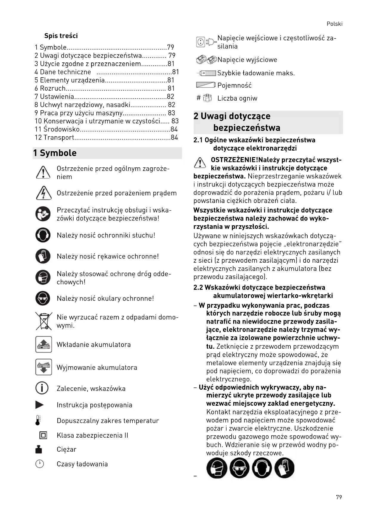 - 12 Transport 1 Symbole Ostrzeżenie przed ogólnym zagroże niem Ostrzeżenie przed porażeniem prądem Przeczytać instrukcję obsługi i wska zówki dotyczące bezpieczeństwa! Należy nosić ochronniki słuchu! Należy nosić rękawice ochronne! Należy stosować ochronę dróg odde chowych! Należy nosić okulary ochronne! Nie wyrzucać razem z odpadami domo wymi. Wkładanie akumulatora Wyjmowanie akumulatora Zalecenie, wskazówka Instrukcja postępowania Dopuszczalny zakres temperatur Klasa zabezpieczenia II Ciężar Czasy ładowania Napięcie wejściowe i częstotliwość za silania Napięcie wyjściowe Szybkie ładowanie maks. Pojemność p. 84