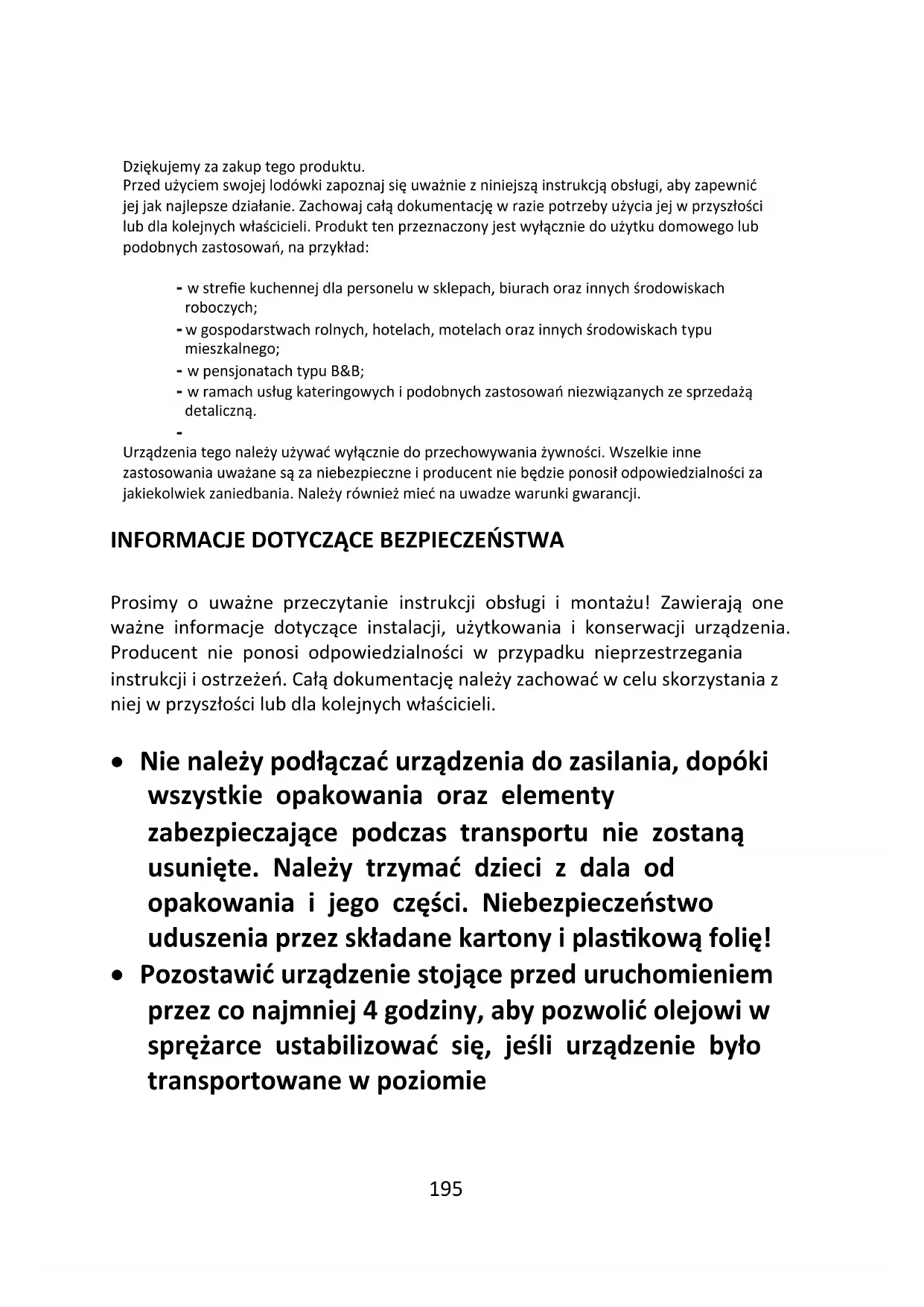 - Pomoc techniczna 95 Dziękujemy za zakup tego produktu. Przed użyciem swojej lodówki zapoznaj się uważnie z niniejszą instrukcją obsługi, aby zapewnić jej jak najlepsze działanie. Zachowaj całą dokumentację w razie potrzeby użycia jej w przyszłości lub dla kolejnych właścicieli. Produkt ten przeznaczony jest wyłącznie do użytku domowego lub podobnych zastosowań, na przykład: - w strefie kuchennej dla personelu w sklepach, biurach oraz innych środowiskach roboczych; - w gospodarstwach rolnych, hotelach, motelach oraz innych środowiskach typu mieszkalnego; - w pensjonatach typu B&B; - w ramach usług kateringowych i podobnych zastosowań niezwiązanych ze sprzedażą detaliczną. Urządzenia tego należy używać wyłącznie do przechowywania żywności. Wszelkie inne zastosowania uważane są za niebezpieczne i producent nie będzie ponosił odpowiedzialności za jakiekolwiek zaniedbania. Należy również mieć na uwadze warunki gwarancji. p. 2151