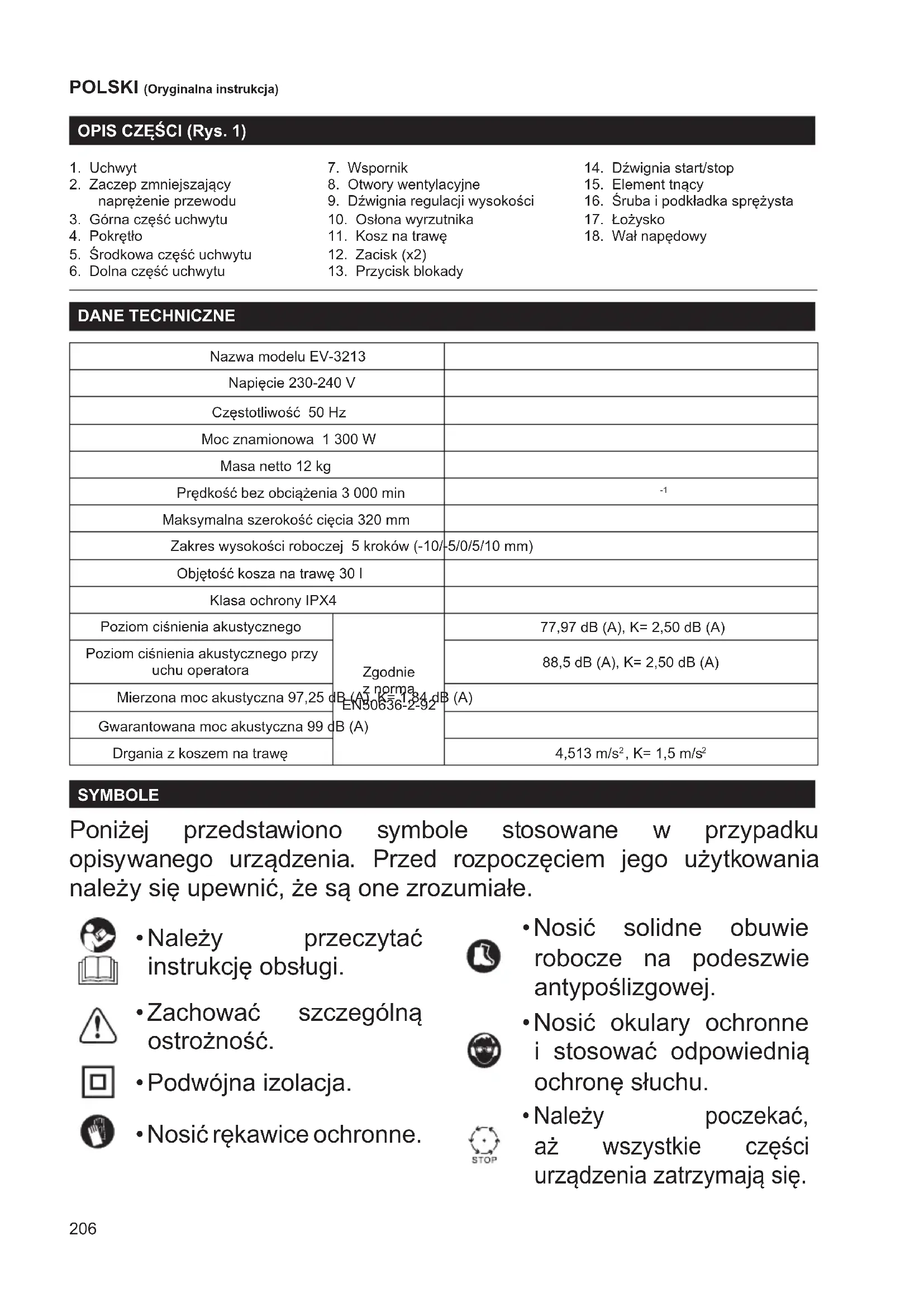 Maksymalna szerokość cięcia 320 mm Zakres wysokości roboczej 5 kroków (-10/-5/0/5/10 mm) Objętość kosza na trawę 30 l Klasa ochrony IPX4 Poziom ciśnienia akustycznego Zgodnie z normą EN50636-2-92 77,97 dB (A), K= 2,50 dB (A) Poziom ciśnienia akustycznego przy uchu operatora 88,5 dB (A), K= 2,50 dB (A) Mierzona moc akustyczna 97,25 dB (A), K= 1,84 dB (A) Gwarantowana moc akustyczna 99 dB (A) Drgania z koszem na trawę 4,513 m/s