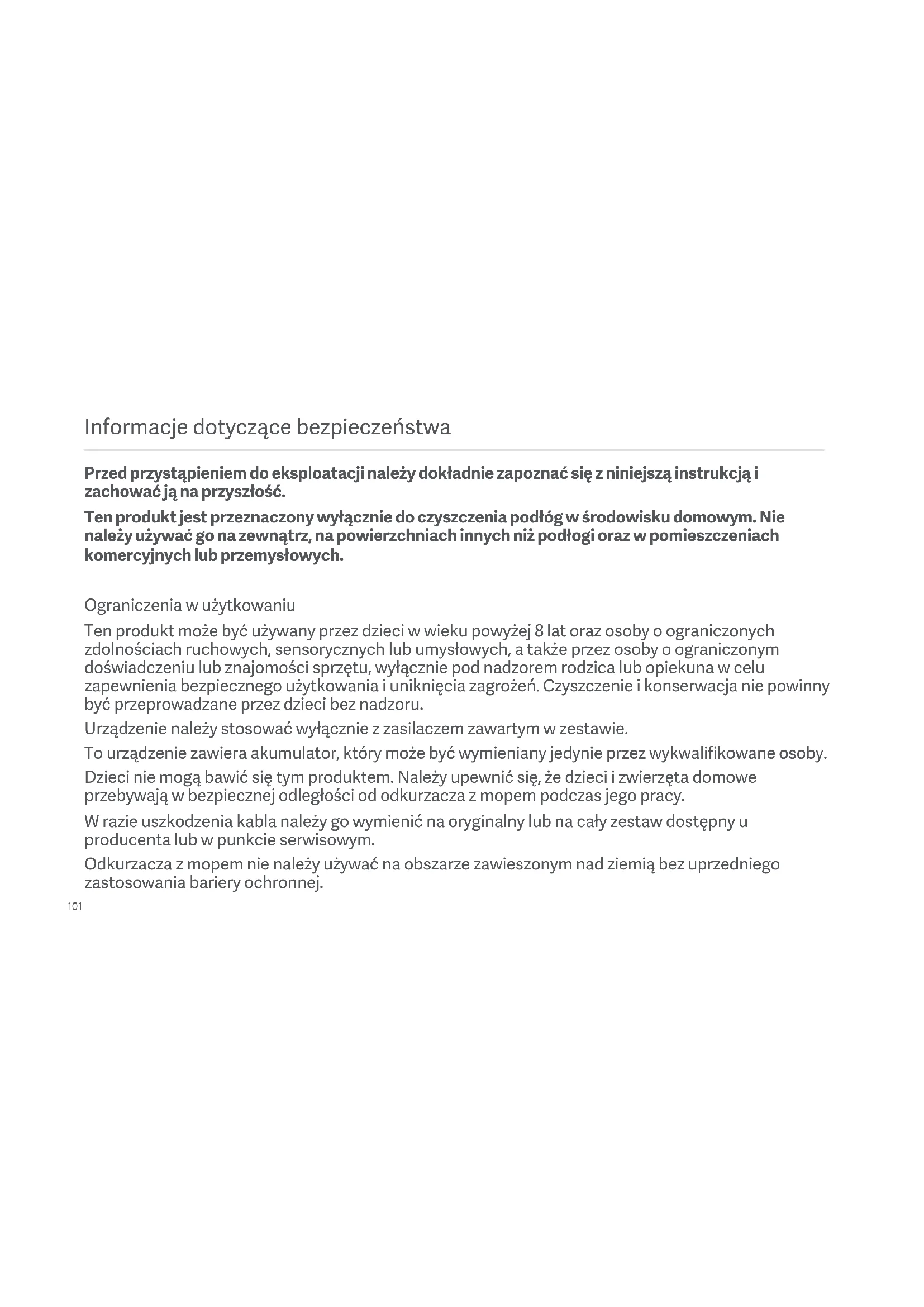 Ten produit jest przyznaczenia węȩcznych do czyszczenia podłóg w sądowisku domowym. Nie sązy uzywać go na zewatraz, na powierzchniach innych nig podlogi oraz w pomieszczeniach komercyjniych lub przyemysłowych.