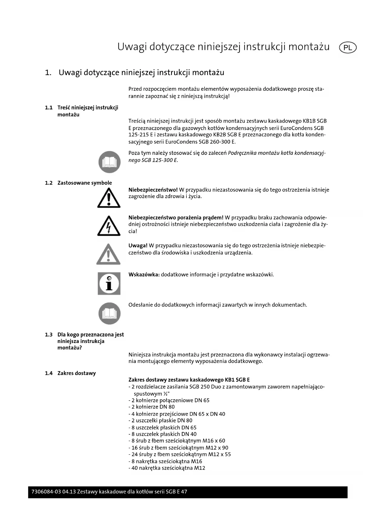 Zakres dostawy zestawu kaskadowego KB1 SGB E - 2 rozdzielacze zasilania SGB 250 Duo z zamontowanym zaworem napełniająco- spustowym ½" - 2 kołnierze połączeniowe DN 65 - 2 kołnierze DN 80 - 4 kołnierze przejściowe DN 65 x DN 40 - 2 uszczelki płaskie DN 80 - 8 uszczelek płaskich DN 65 - 8 uszczelek płaskich DN 40 - 8 śrub z łbem sześciokątnym M16 x 60 - 16 śrub z łbem sześciokątnym M12 x 90 - 24 śruby z łbem sześciokątnym M12 x 55 - 8 nakrętka sześciokątna M16 - 40 nakrętka sześciokątna M12 Uwagi dotyczące niniejszej instrukcji montażu 7306084-03 04.13 Zestawy kaskadowe dla kotłów serii SGB E 47 PL- 8 podkładek B17 - 80 podkładek B13 - 4 uszczelki gumowe - instrukcja montażu Zakres dostawy zestawu kaskadowego KB2 SGB E - 2 rozdzielacze zasilania SGB 600 Duo z zamontowanym zaworem napełniająco- spustowym ½" - 2 kołnierze połączeniowe DN 65 - 2 kołnierze DN 100 - 2 uszczelki płaskie DN 100 - 6 uszczelek płaskich DN 65 - 4 uszczelki płaskie DN 50 - 8 śrub z łbem sześciokątnym M16 x 60 - 8 śrub z łbem sześciokątnym M12 x 100 - 40 śrub z łbem sześciokątnym M12 x 60 - 8 nakrętek sześciokątnych M16 - 48 nakrętek sześciokątnych M12 - 16 podkładek B17 - 96 podkładek B13 - 4 uszczelki gumowe - instrukcja montażu Uwagi dotyczące niniejszej instrukcji montażu 48 Zestawy kaskadowe dla kotłów serii SGB E 7306084-03 04.13 PL2. Bezpieczeństwo Niebezpieczeństwo! Należy stosować się do poniższych wskazówek dotyczących bezpieczeństwa! W przeciwnym razie stwarzają Państwo zagrożenie dla siebie i in- nych.