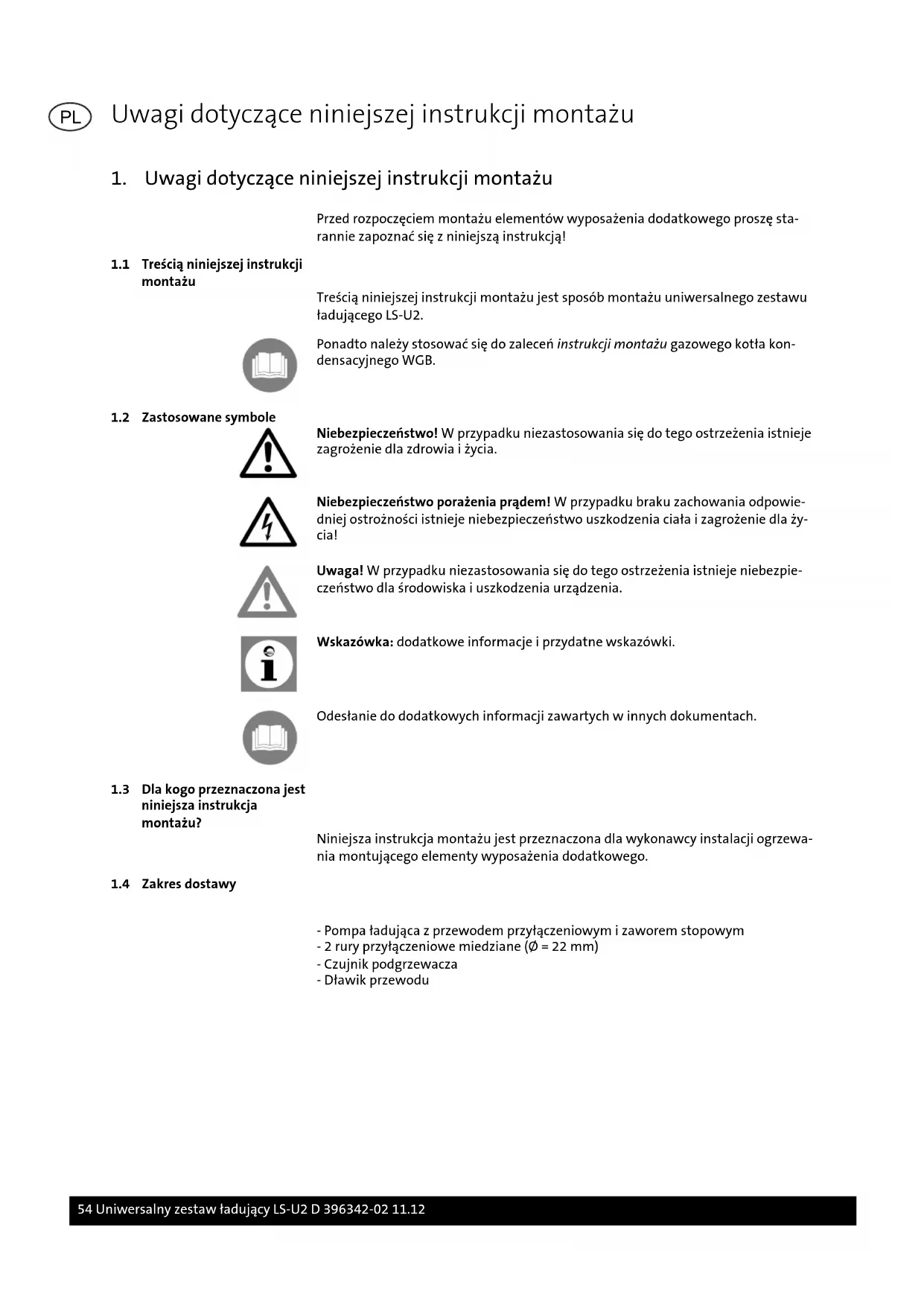 - Pompa ładująca z przewodem przyłączeniowym i zaworem stopowym - 2 rury przyłączeniowe miedziane (Ø = 22 mm) - Czujnik podgrzewacza - Dławik przewodu Uwagi dotyczące niniejszej instrukcji montażu 54 Uniwersalny zestaw ładujący LS-U2 D 396342-02 11.12 PL2. Bezpieczeństwo