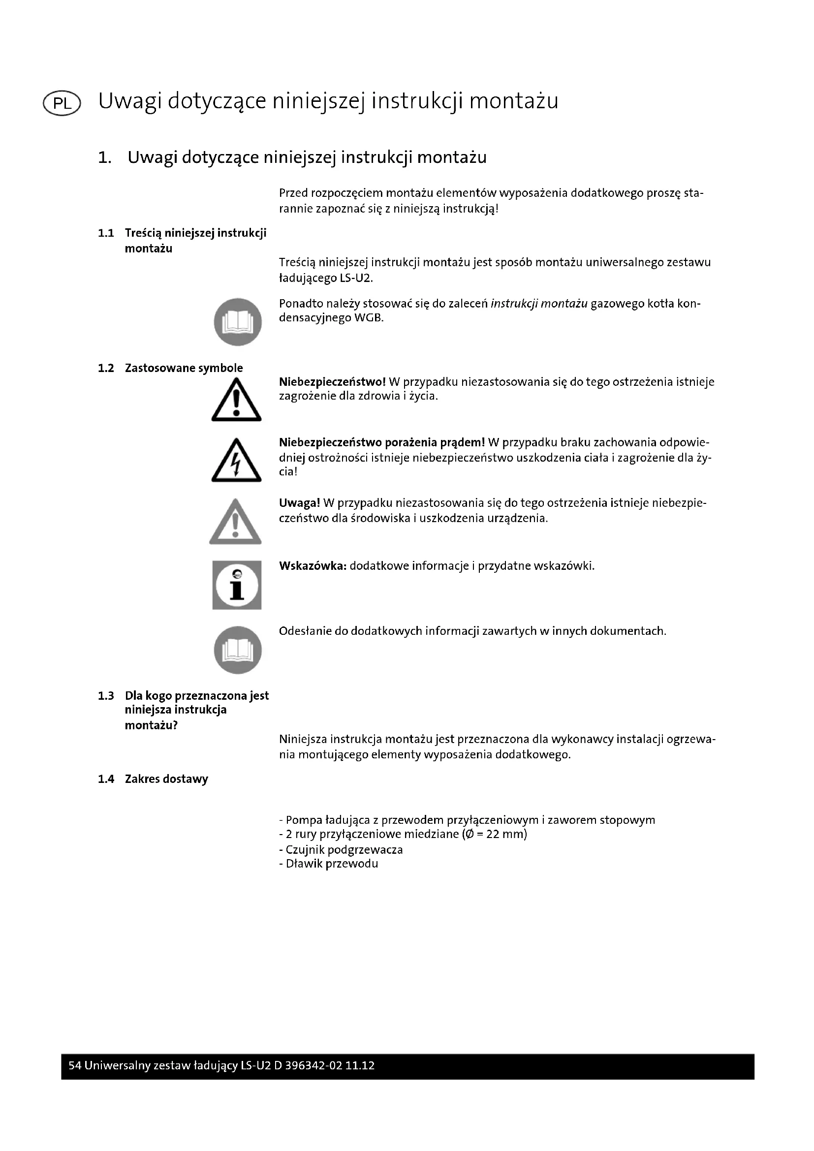 - Pompa ładująca z przewodem przyłączeniowym i zaworem stopowym - 2 rury przyłączeniowe miedziane (Ø = 22 mm) - Czujnik podgrzewacza - Dławik przewodu Uwagi dotyczące niniejszej instrukcji montażu 54 Uniwersalny zestaw ładujący LS-U2 D 396342-02 11.12 PL2. Bezpieczeństwo